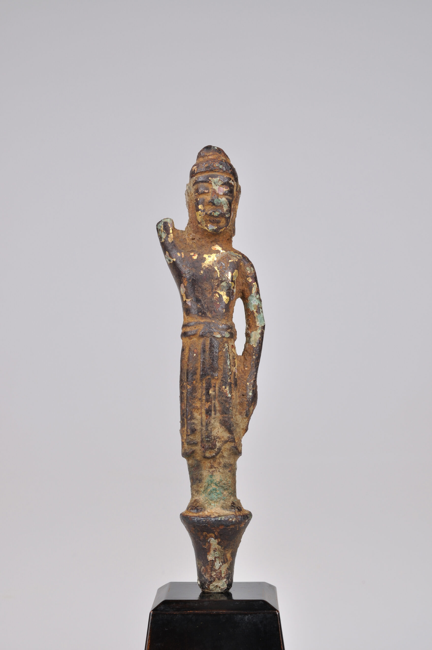 Shakyamuni (the Buddha), the historical founder of Buddhism, lived in ancient India approximately 2,500 years ago. The statue depicts the traditional story claiming that Buddha, immediately upon his birth, took seven steps, pointed his right hand toward the heavens and his left toward the earth, and proclaimed, “Above and below the heavens, I alone am the honored one.” The figure is bare-chested and wears a skirt-like kun garment around the waist. The right arm is raised (though now missing), while the left arm hangs down alongside the body. Although the exact dates of Shakyamuni’s birth and death remain uncertain, he is said to have been born on April 8. On this day each year, Buddhist temples throughout Japan hold the Flower Festival (Kanbutsu-e), a ceremony celebrating his birth in which halls are adorned with flowers and a small statue of the Buddha at birth is placed in a basin and bathed with sweet tea. This figure was cast in a single piece using the lost-wax process. The lotus base beneath the feet and the tenon used to secure the figure to its pedestal were created as an integral part of the casting. While verdigris corrosion now spreads across much of the surface, traces of gilding remain around the chest and waist, indicating that the entire figure originally shone with a golden luster. The celebration of Shakyamuni’s birth has been observed in Japan since the Asuka period, and many gilt-bronze Buddha images from that era survive. This piece is said to have been unearthed in 1964 at the site of the Sakata Temple in Nishikasuga-chō, Takamatsu City (the remains of a temple founded in the Asuka period). Today, it is an important artifact illustrating the history of Buddhist culture in Kagawa.