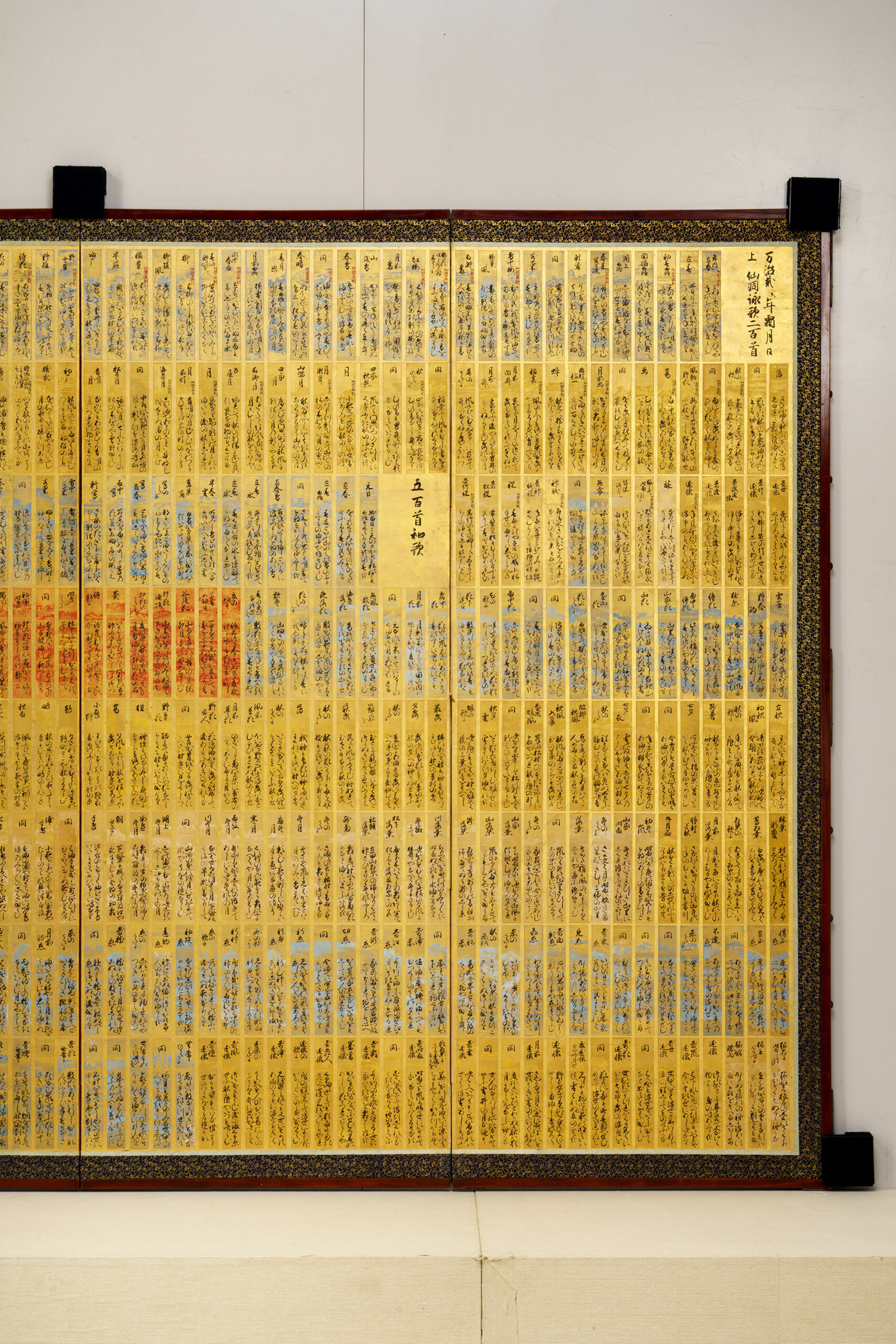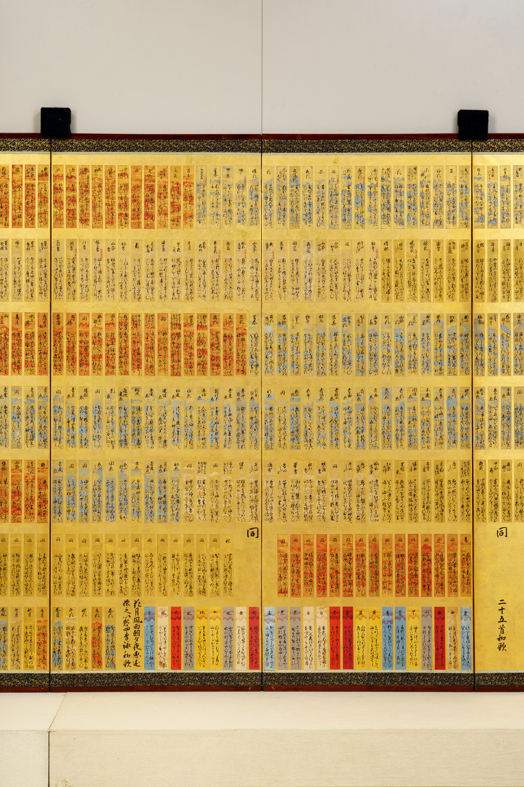 These folding screens are composed of tanzaku (poem papers) inscribed with waka poems by Matsudaira Yorishige, the first head of the Takamatsu Matsudaira family. There are 619 tanzaku on the right screen, including waka composed in 1658 (Manji 1) under the instruction of Emperor Emeritus Go-Mizunoo, as well as waka on the theme of the Eight Views of Kameyama. There are 700 tanzaku on the left screen, including waka composed under the emperor emeritus’s guidance in 1659 (Manji 2). The poem slips affixed to the screens that were revised by Emperor Emeritus Go‐Mizunoo are marked in red or black with the notation “Sendō on‐tensaku” (“corrected by the retired emperor”), indicating the places where he made additions, deletions, or other adjustments. Noted as one of the most accomplished waka poets among Japan’s emperors, Go-Mizunoo frequently reviewed Yorishige’s verses and provided instruction.
