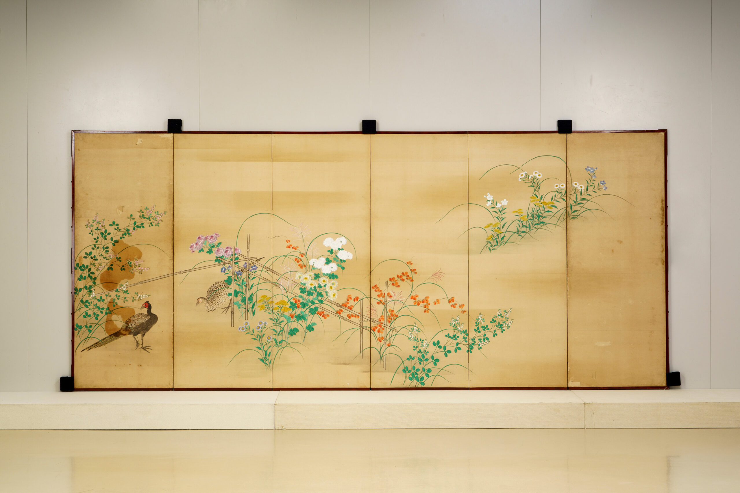 On the reverse of the screens, the 1658 screen depicts autumn grasses and a pheasant, while the 1659 screen shows autumn grasses and three small birds.