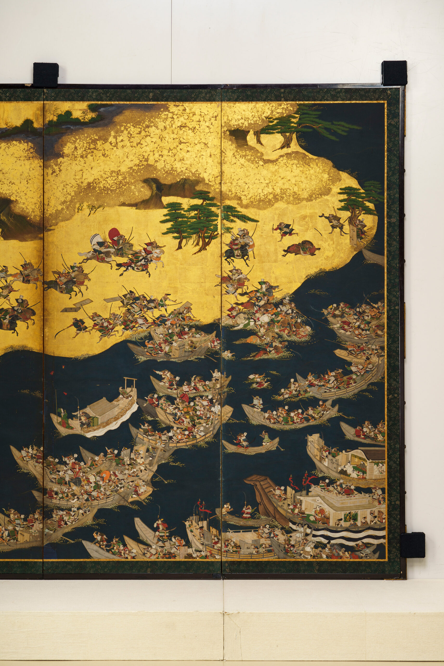 This six-panel folding screen depicts the Battle of Yashima in February 1185 (Genryaku 2). It was a part of the Genpei War between the Minamoto (Genji) and Taira (Heike) clans. From the lower left to the upper right of the composition appear several dramatic events: Satō Tsugunobu being shot by Taira no Noritsune, Nasu no Yoichi shooting down the fan held aloft by a court lady on board a Taira ship, Fujiwara no Kagekiyo, a Taira general, tearing off the shikoro (neck guard) of Mihonoya Jūrō’s helmet, and Minamoto no Yoshitsune retrieving his bow from the sea at great personal risk.