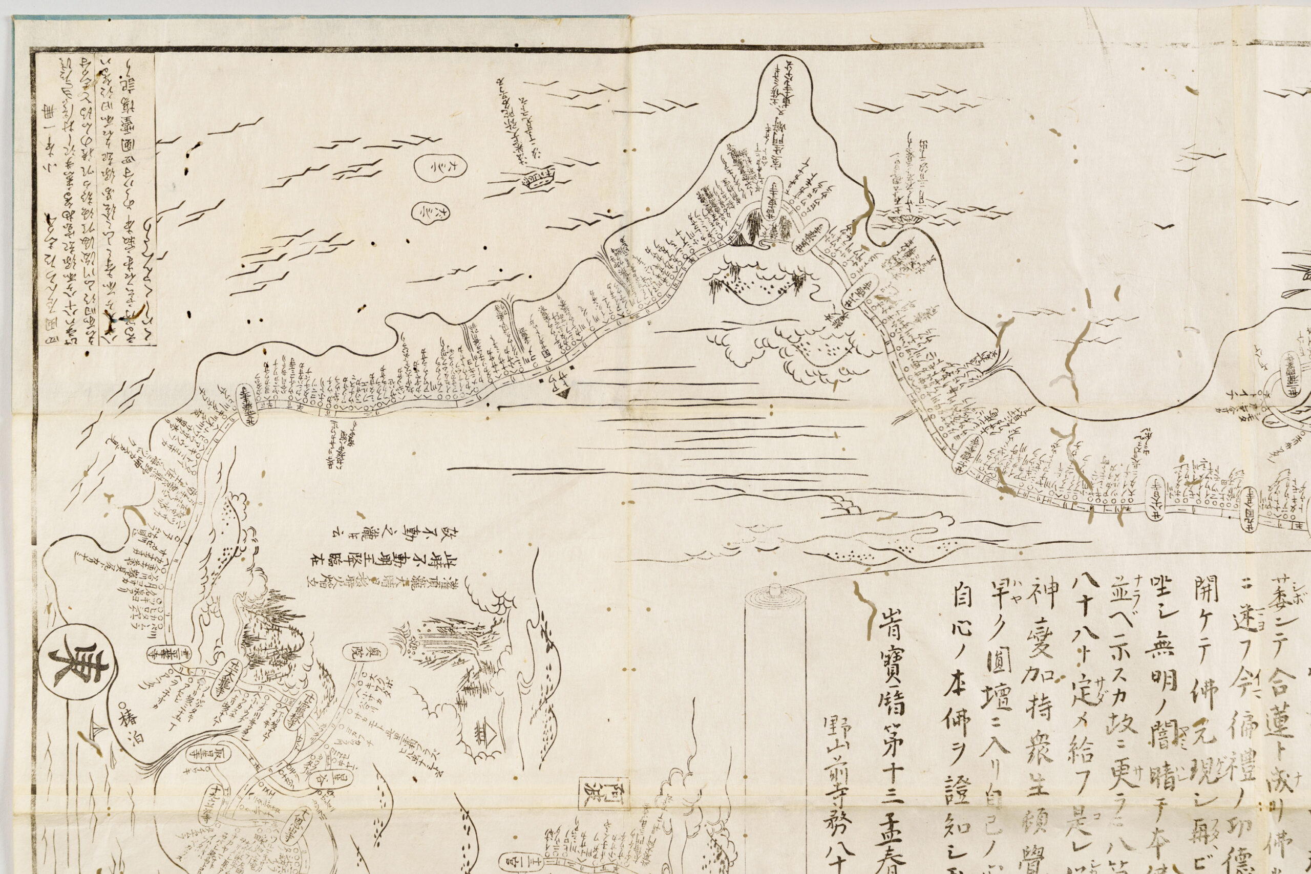 This is the oldest known map of the Shikoku pilgrimage for which the year of publication is known. It presents the island of Shikoku with Tosa, which is to the south, at the top. The map marks all eighty-eight sacred sites (fudasho), together with the distances between them, the names of villages along the route, mountain passes, and additional points of interest beyond the pilgrimage temples. It is all recorded in fine detail. At the center is Kūkai (Kōbō Daishi), depicted in the Zentsū-ji miei style, which is based on the story of the Buddha Shakyamuni appearing to him while he was training in Sanuki. Beside the image is text by the monk Kōhan of Mt. Kōya explaining the esoteric significance of the Shikoku pilgrimage. In the lower left is an account of the map’s publication, which states that Hosoda Shūei created the work after completing the pilgrimage himself, using Shin’nen’s Shikoku Henro Michishirube as his guide. He had found it inconvenient that there were no illustrated maps of the pilgrimage, like there were for the Saigoku Kannon Pilgrimage. This work subsequently became the prototype for many later maps of the Shikoku pilgrimage.