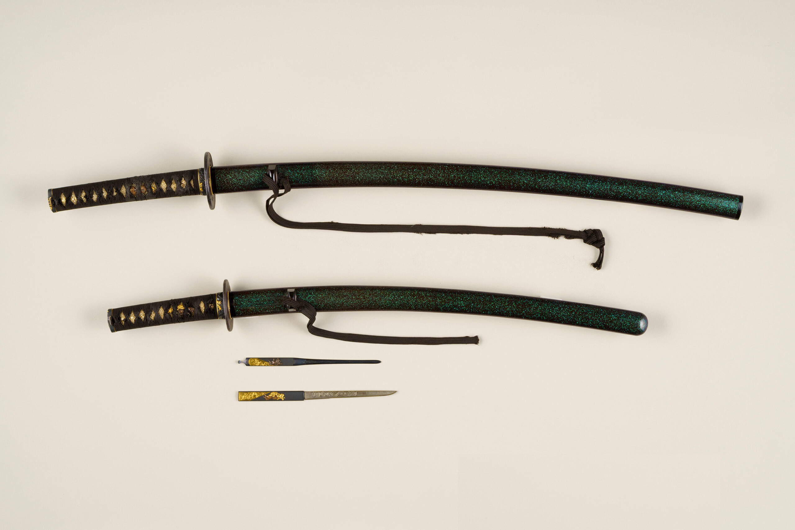Blue Iridescent Lacquered Scabbards and Paired Sword Mountings (Aogai Mijin-nuri Saya and Daishō Koshirae)