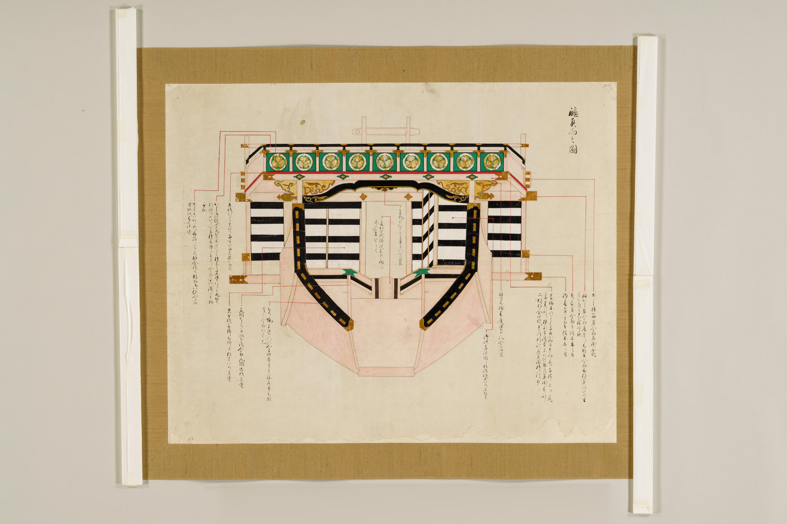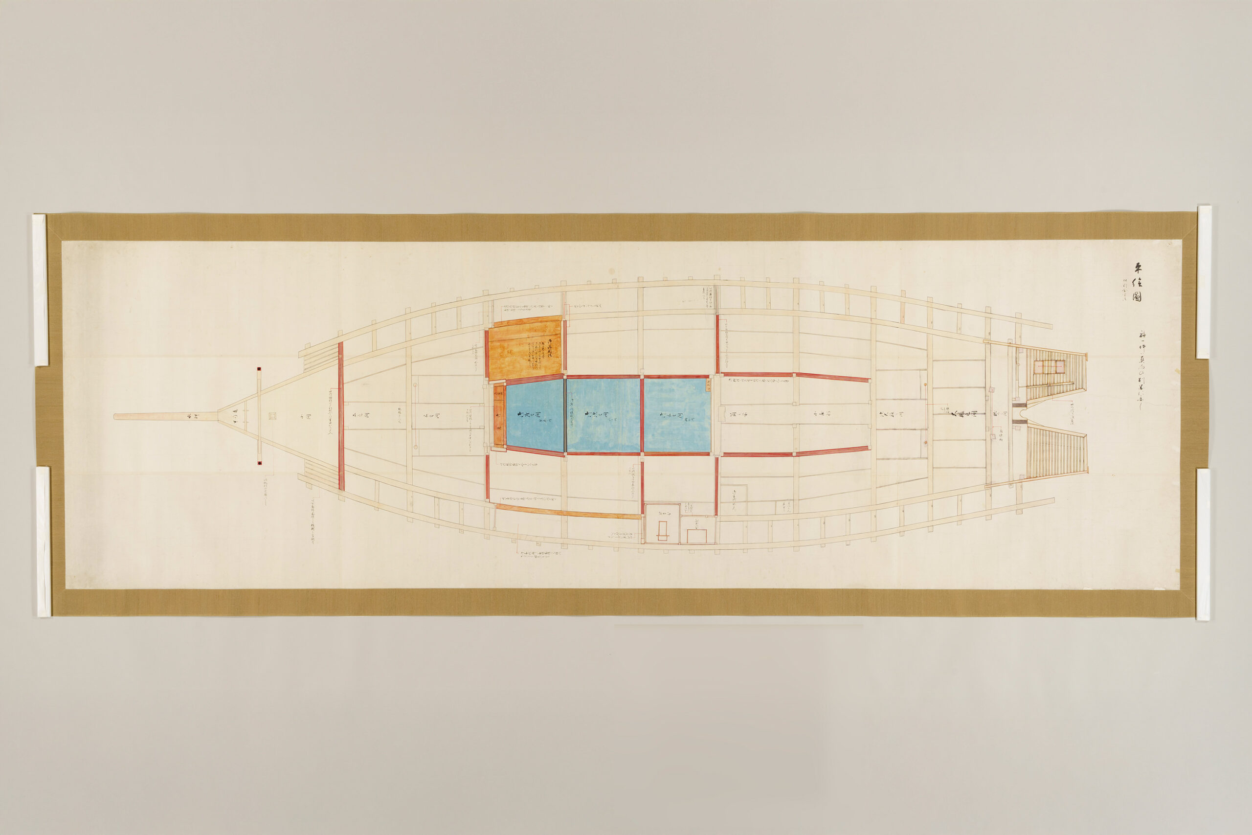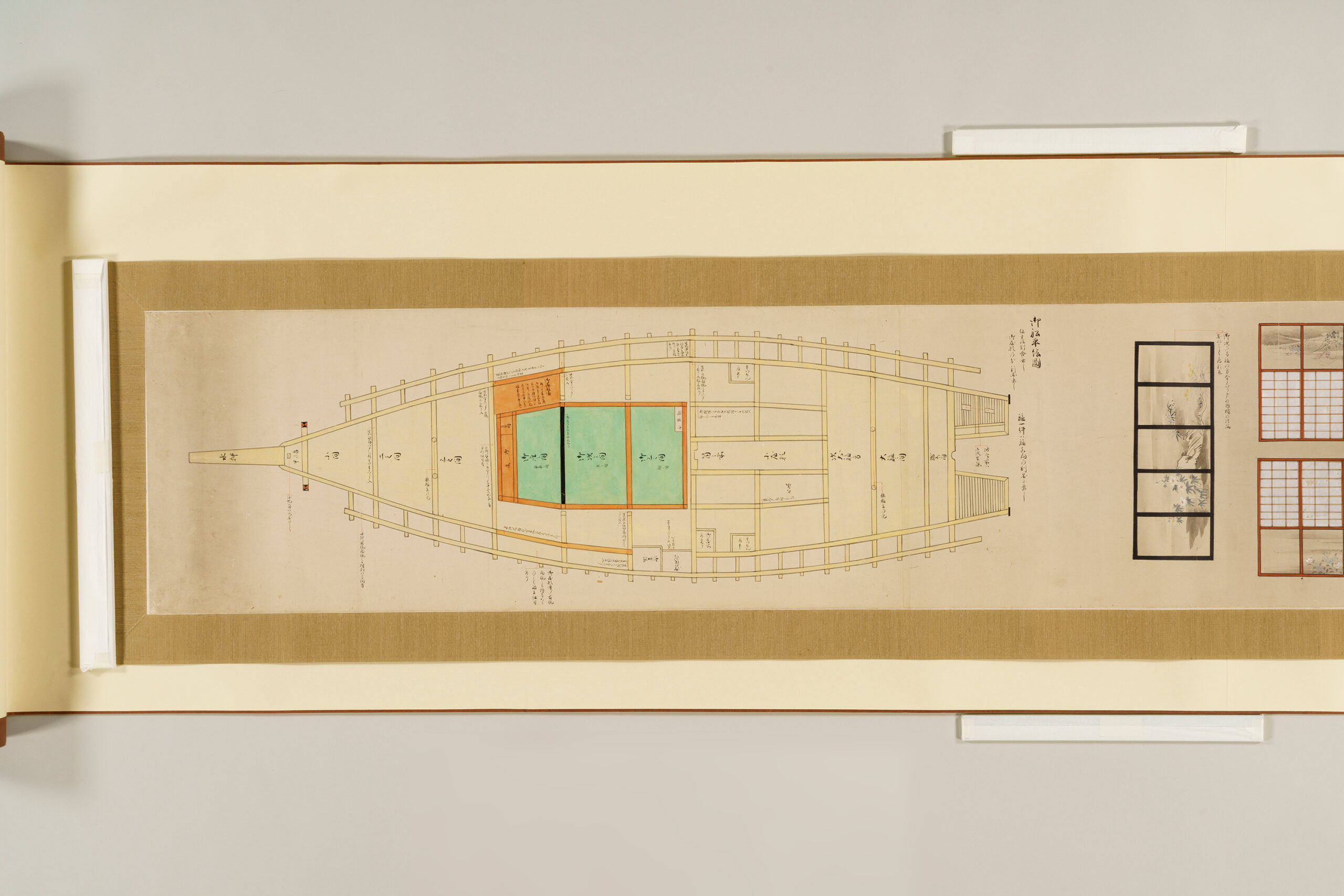 Each sheet is annotated with leader lines and explanatory notes that focus primarily on the ship’s decorative features. Of particular interest are the detailed depictions of the interior decoration of the two-story superstructure (yakata), which housed the cabins of the domain lord and his senior retainers, offering insight into aspects of daimyo life.