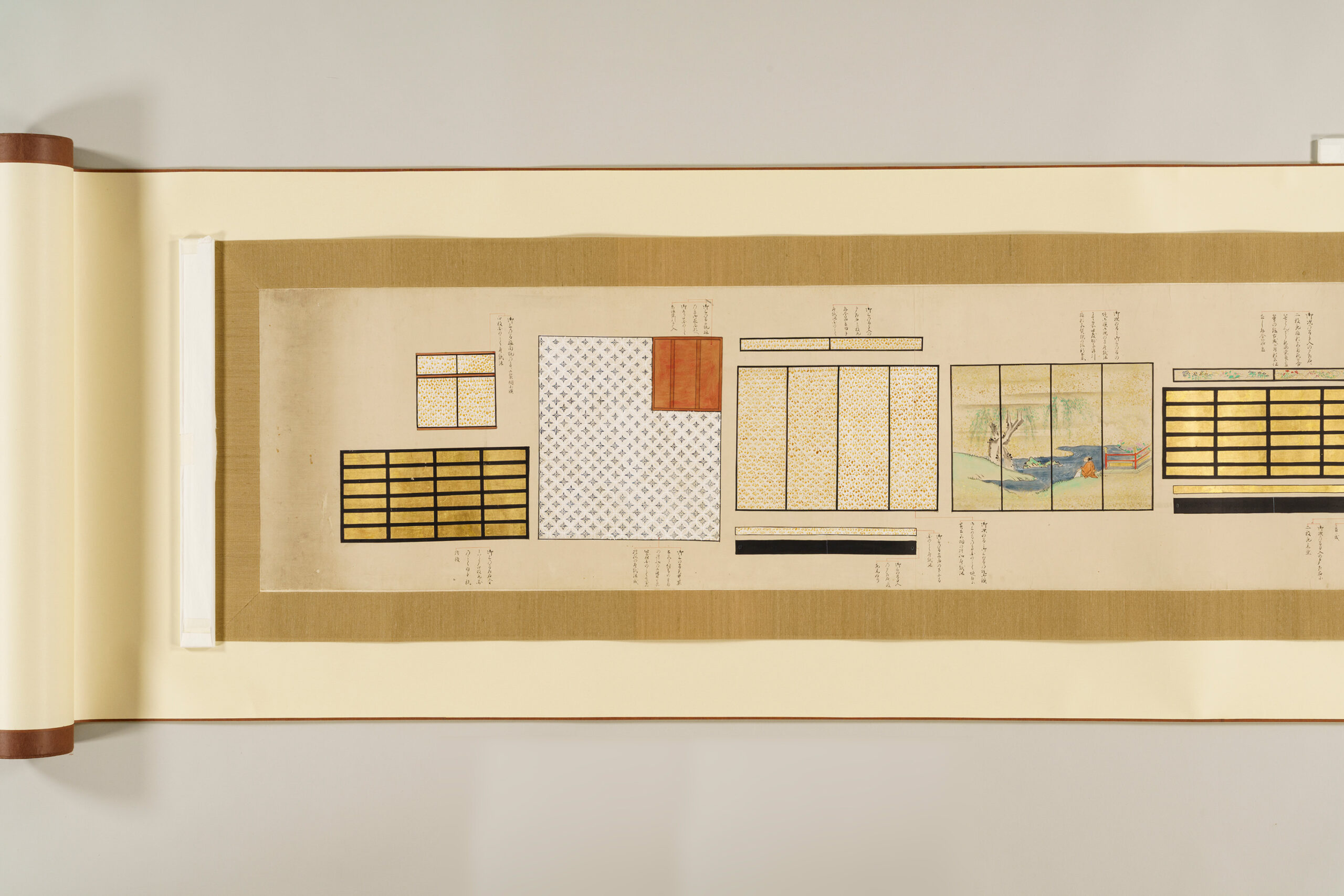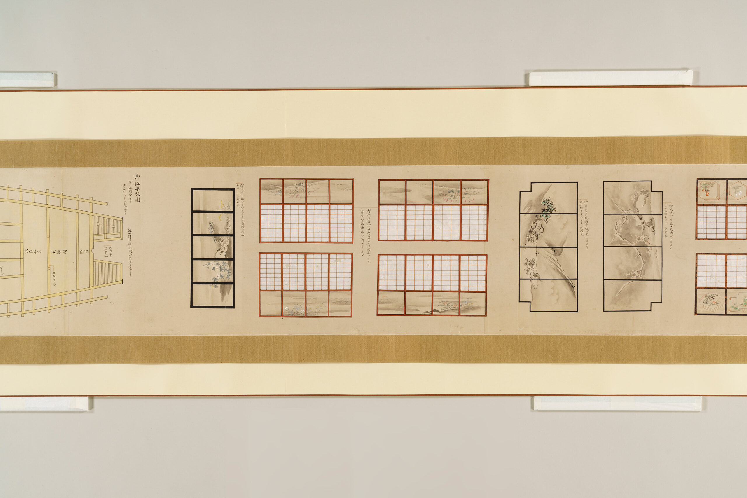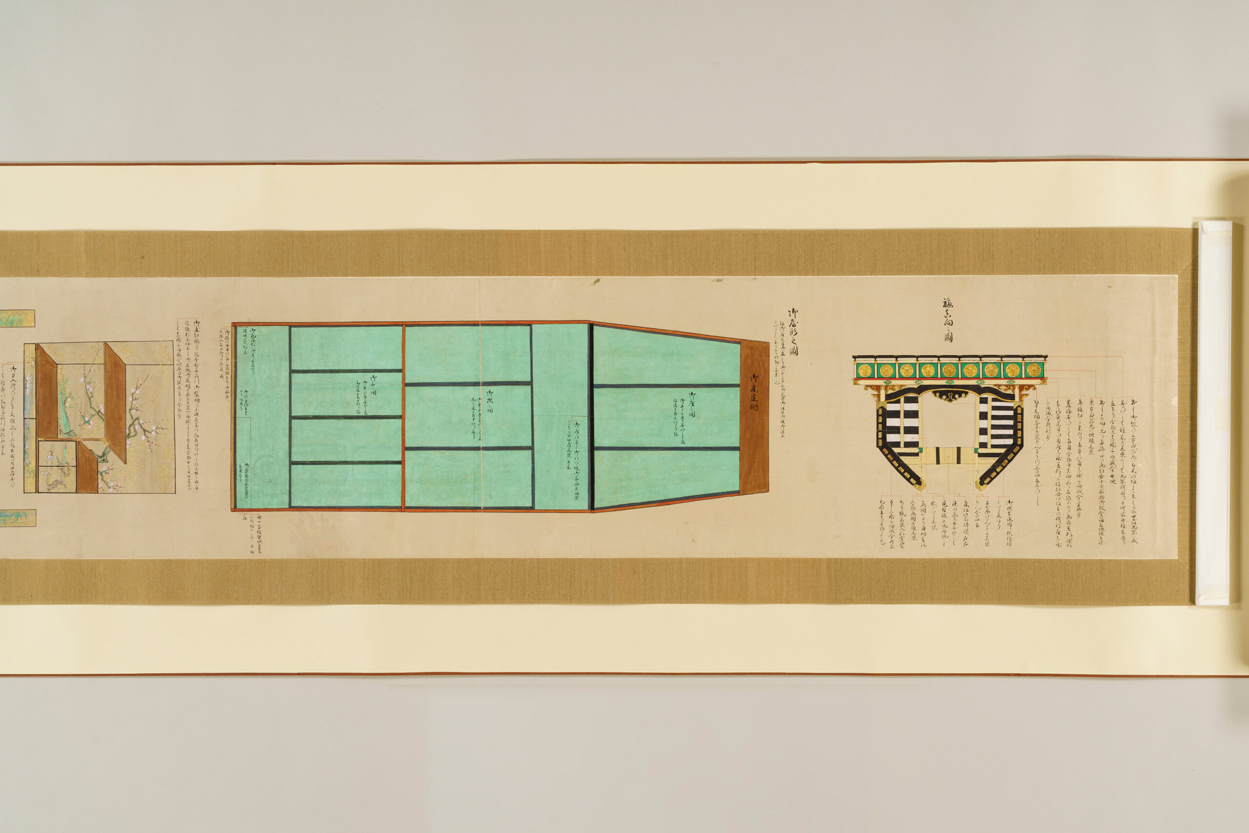 Each sheet is annotated with leader lines and explanatory notes that focus primarily on the ship’s decorative features. Of particular interest are the detailed depictions of the interior decoration of the two-story superstructure (yakata), which housed the cabins of the domain lord and his senior retainers, offering insight into aspects of daimyo life.