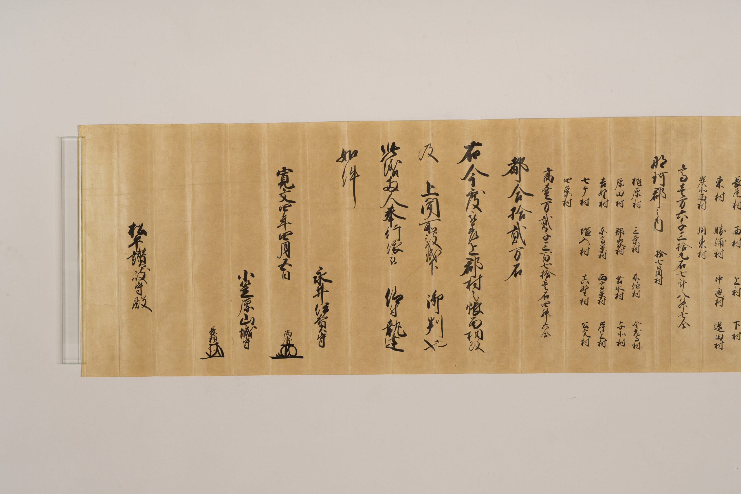 This document is a register listing the villages and the assessed agricultural yields (kokudaka), totaling 120,000 koku, which constituted the territories under the control of the Takamatsu Matsudaira family. It was issued together with a letter of enfeoffment (ryōchi ategaijō). While only Edo-period copies of the letter of enfeoffment have been handed down within the Matsudaira family, the original landholding register itself has been preserved. The register records both the number of villages and the total assessed yield for each of the six districts whose entire territories fell under the domain’s control: Ōchi, Sangawa, Miki, Yamada, Kagawa and Aya. For Uta and Naka, the two districts where only parts of the districts were included in the domain, it lists the names of villages and their combined assessed yields. The people who sent the document, Nagai Naotsune and Ogasawara Naganori, were daimyo who served as sōjaban, officials of the Tokugawa shogunate responsible for mediating communications between the shogun and the daimyo.