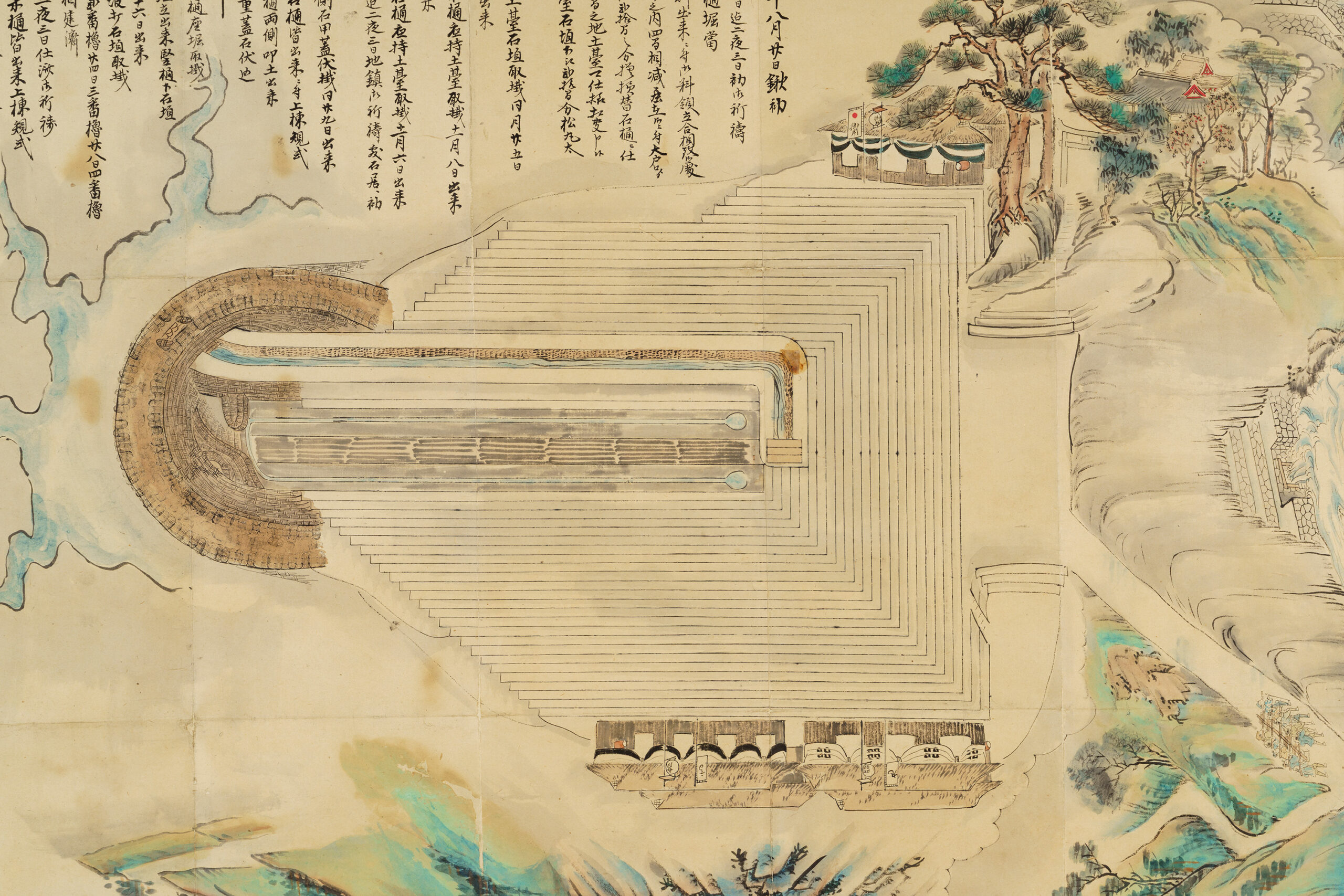 This illustration depicts construction carried out in 1850 (Kaei 3), in the late Edo period, at the Manno Reservoir, which is the largest irrigation reservoir in Japan. Today it is designated a National Place of Scenic Beauty. The scene shows the replacement of a wooden culvert (hi), which served as a water conduit, with a more durable stone culvert.
