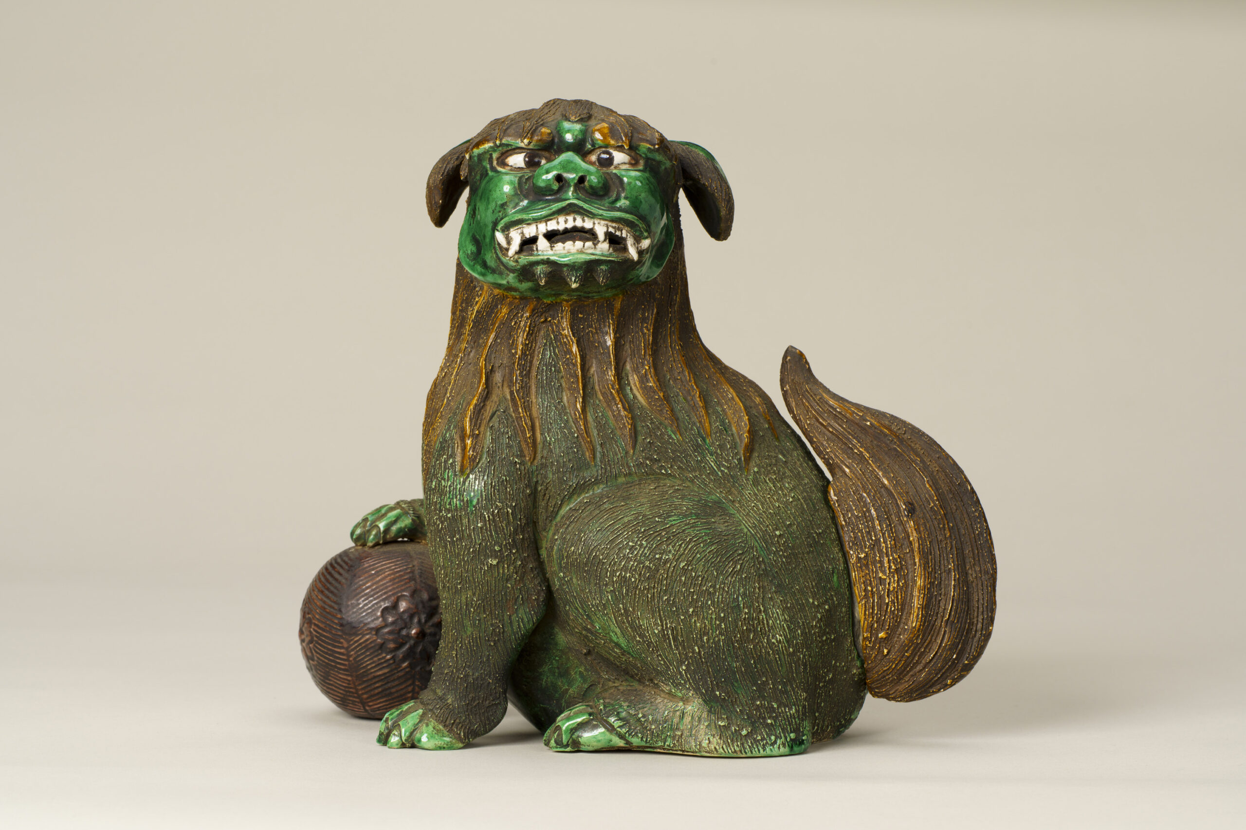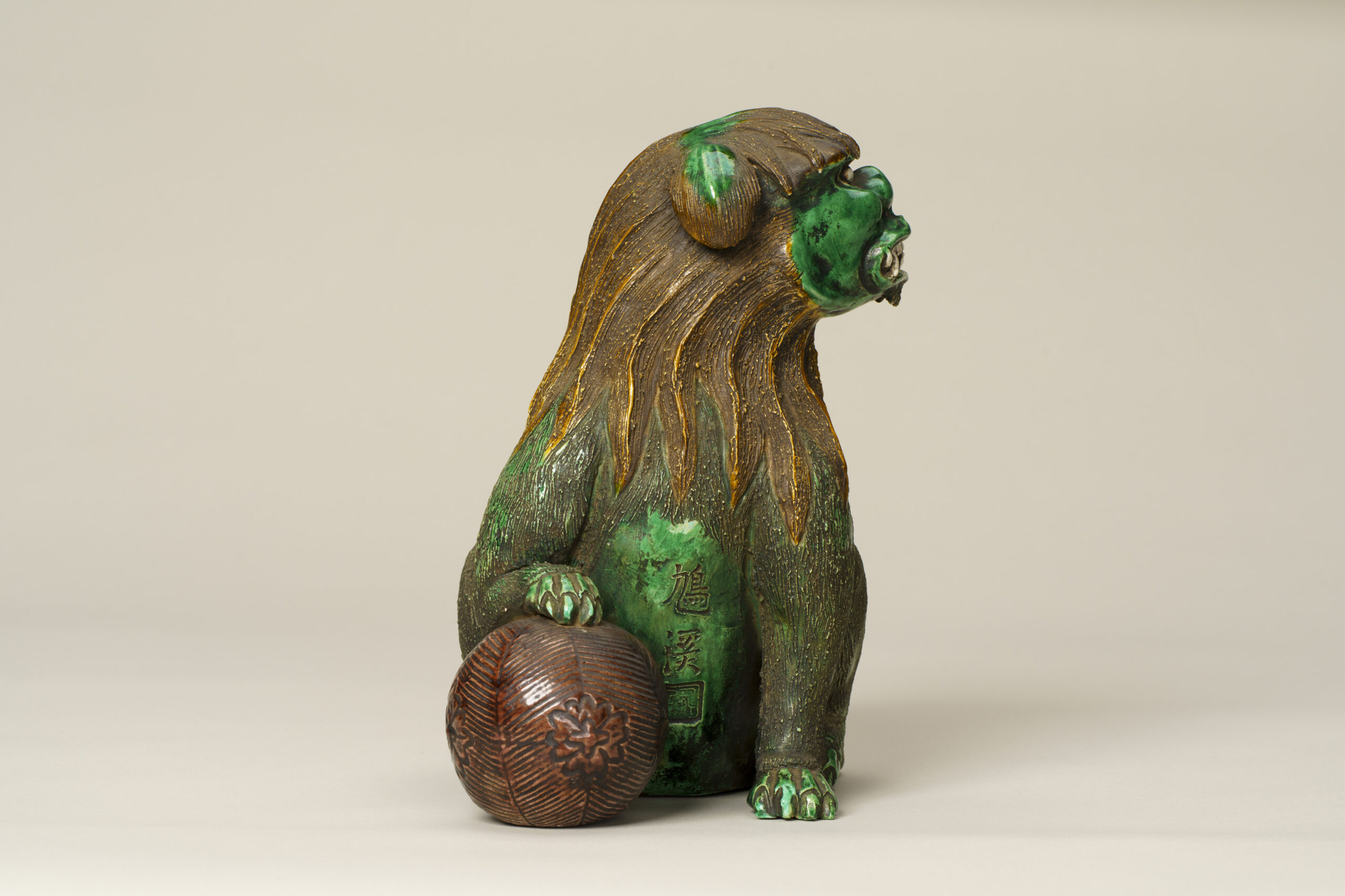 This is a Gennai-yaki ceramic figurine depicting a lion resting its right forepaw on a ball and tilting its head. Gennai-yaki is a type of pottery said to have been established in Shido (present-day Sanuki City, Kagawa Prefecture) by Hiraga Gennai (1728–1779), a native of the area renowned for his achievements in a wide range of fields, including science and literature. This ceramicware work is characterized by its distinctive use of color and decorative motifs. The lion’s mane and fur are rendered with great care, and the figure as a whole is well balanced. The modeling of the eyes, nose and fangs is precise, but the expression is not fierce. Instead, it conveys a sense of charm and humor. Inscribed on the lion’s chest is the name “鳩渓 (Kyūkei),” a sobriquet of Hiraga Gennai, while the base bears the inscription “舜民 (Shunmin),” identifying Wakita Shunmin, a potter known to have worked in the Gennai-yaki tradition. Some examples of Gennai-yaki, including this work, bear inscriptions using Gennai’s sobriquet “鳩渓 (Kyūkei).”
