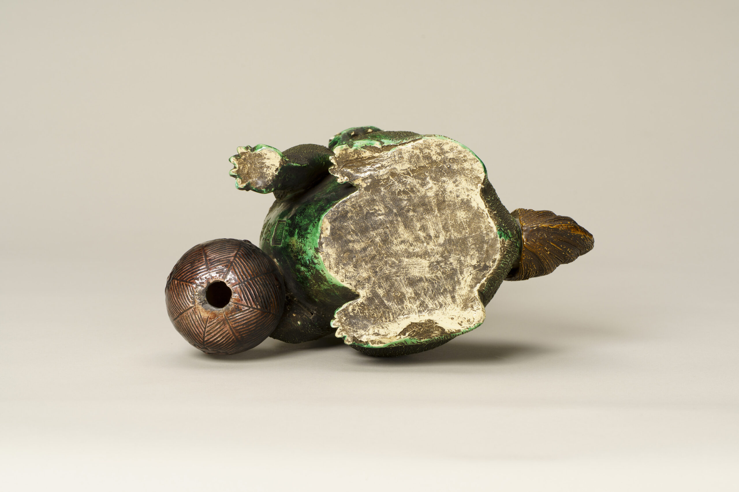 Inscribed on the lion’s chest is the name “鳩渓 (Kyūkei),” a sobriquet of Hiraga Gennai, while the base bears the inscription “舜民 (Shunmin),” identifying Wakita Shunmin, a potter known to have worked in the Gennai-yaki tradition. Some examples of Gennai-yaki, including this work, bear inscriptions using Gennai’s sobriquet “鳩渓 (Kyūkei).”