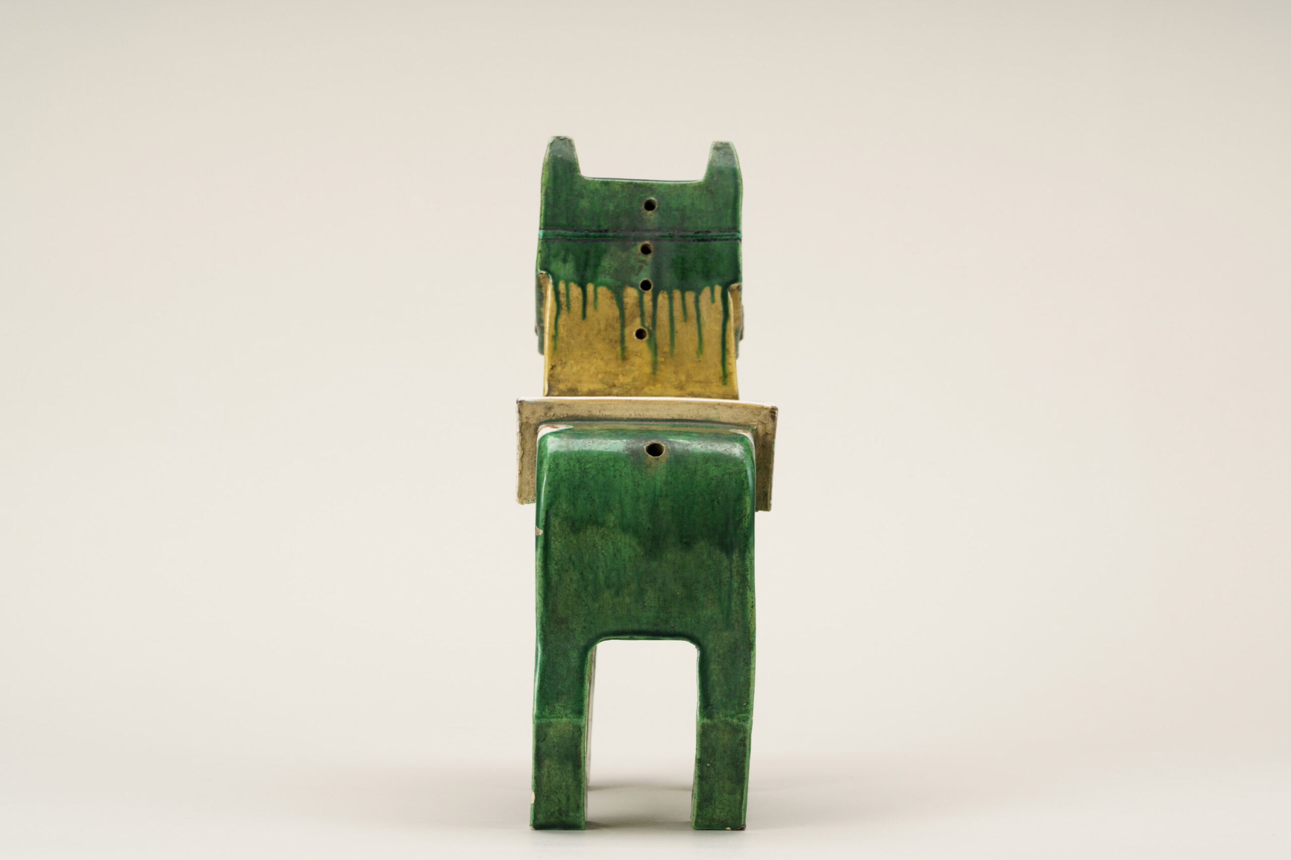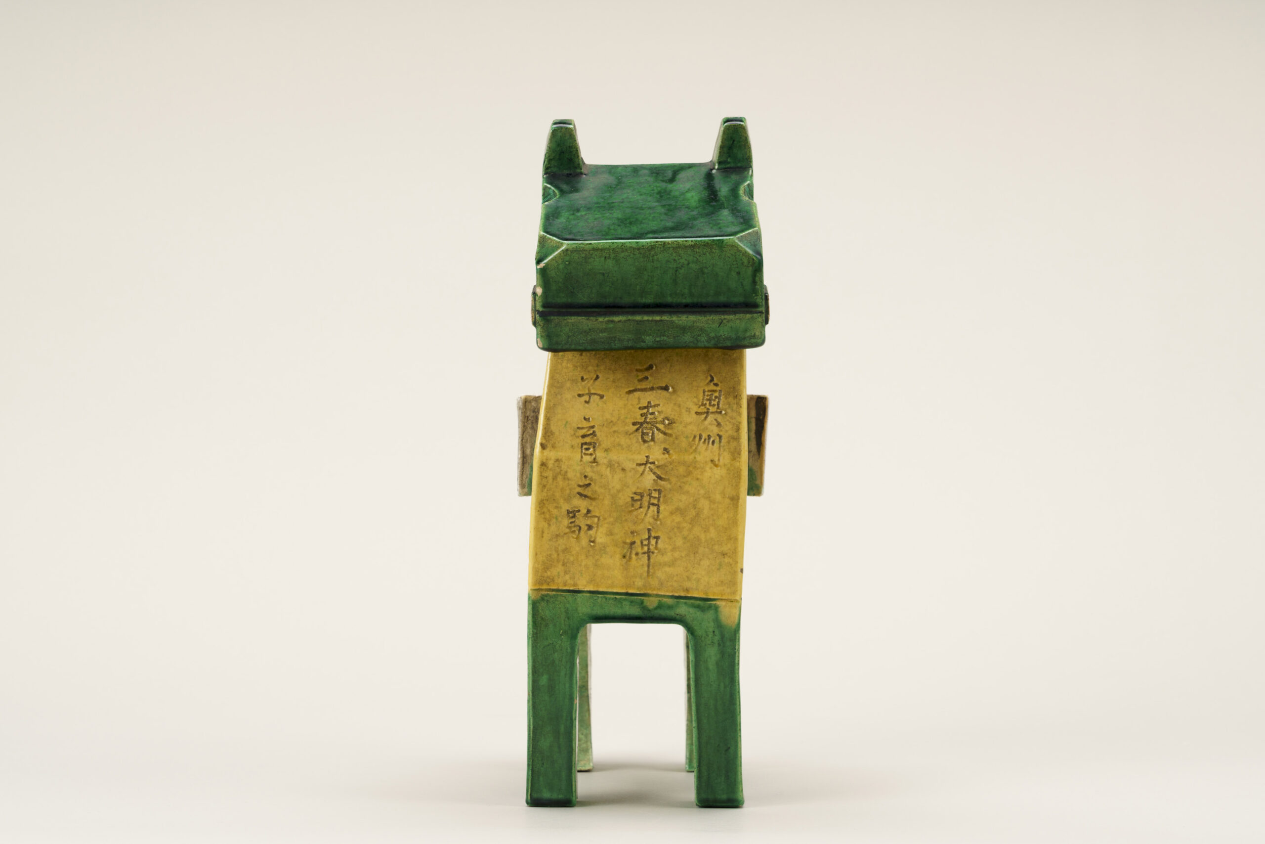 This is a Gennai-yaki incense burner modeled after a Miharu-goma, a wooden horse figurine still made today in Miharu Town, Fukushima Prefecture. Miharu-goma are folk toys traditionally associated with prayers for the healthy growth of children. On the front of this piece is an inscription reading “奥州三春大明神子育之駒 (Ōshū Miharu Daimyōjin Kosodate no Koma),” which is a reference to the Miharu deity revered for nurturing children. Gennai-yaki is a type of pottery said to have been established in Shido (present-day Sanuki City, Kagawa Prefecture) by Hiraga Gennai (1728–1779), a native of the area renowned for his achievements in a wide range of fields, including science and literature. An incense burner (kōro) is a vessel used for burning incense. In this work, incense is burned within a hollow chamber inside the body of the figure. On the reverse of the abdomen is an inscription reading “安永三年 甲午正月元旦 平賀鳩渓謹模造,” which records both a date (An’ei 3, kinoe-uma, New Year’s Day) and the sobriquet of Hiraga Gennai, indicating that the work was made in deference to his design. Other Gennai-yaki incense burners in the form of Miharu-goma bear the same inscription, but differences in calligraphic style have been noted, and further examination is required to determine whether the inscription denotes authorship.
