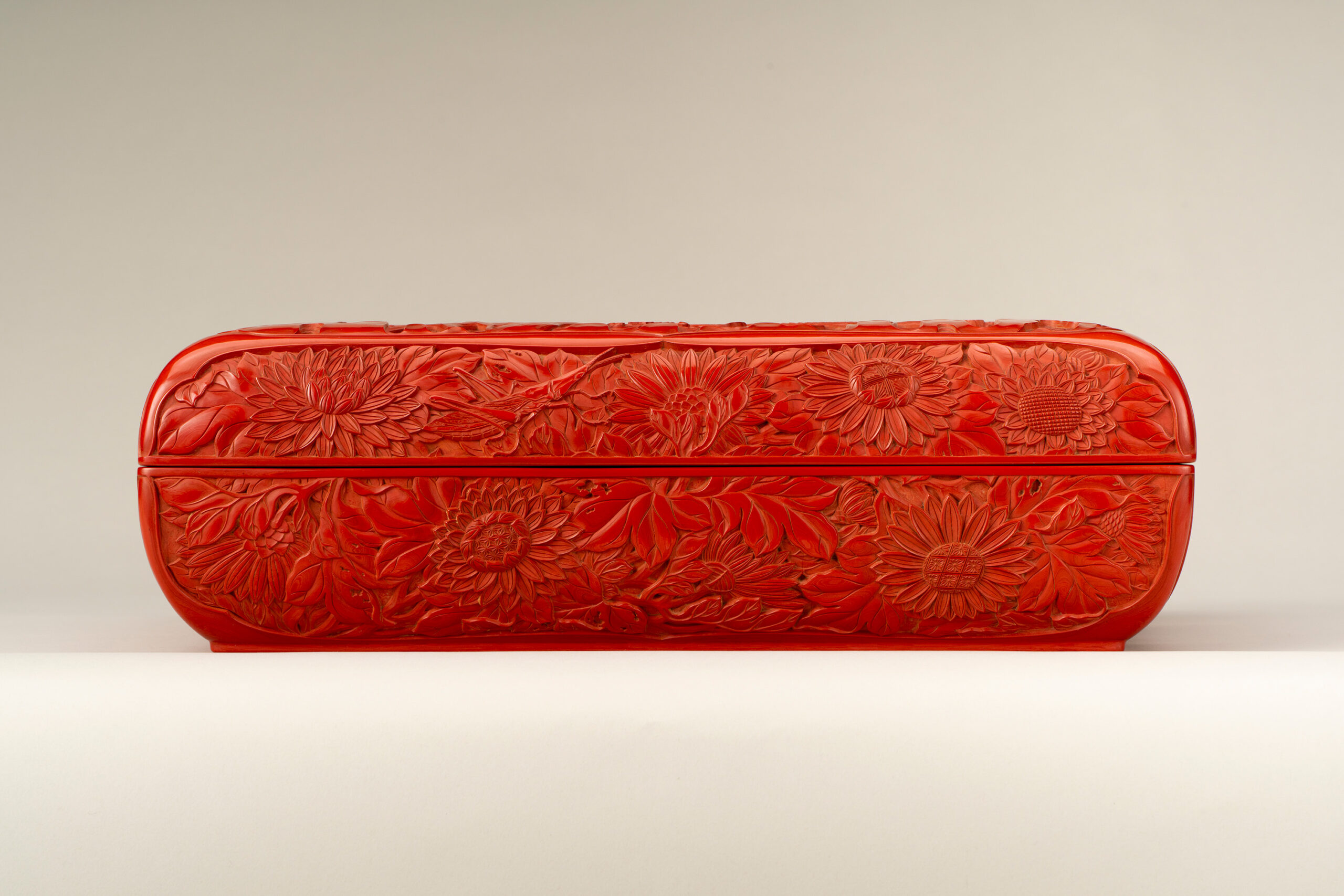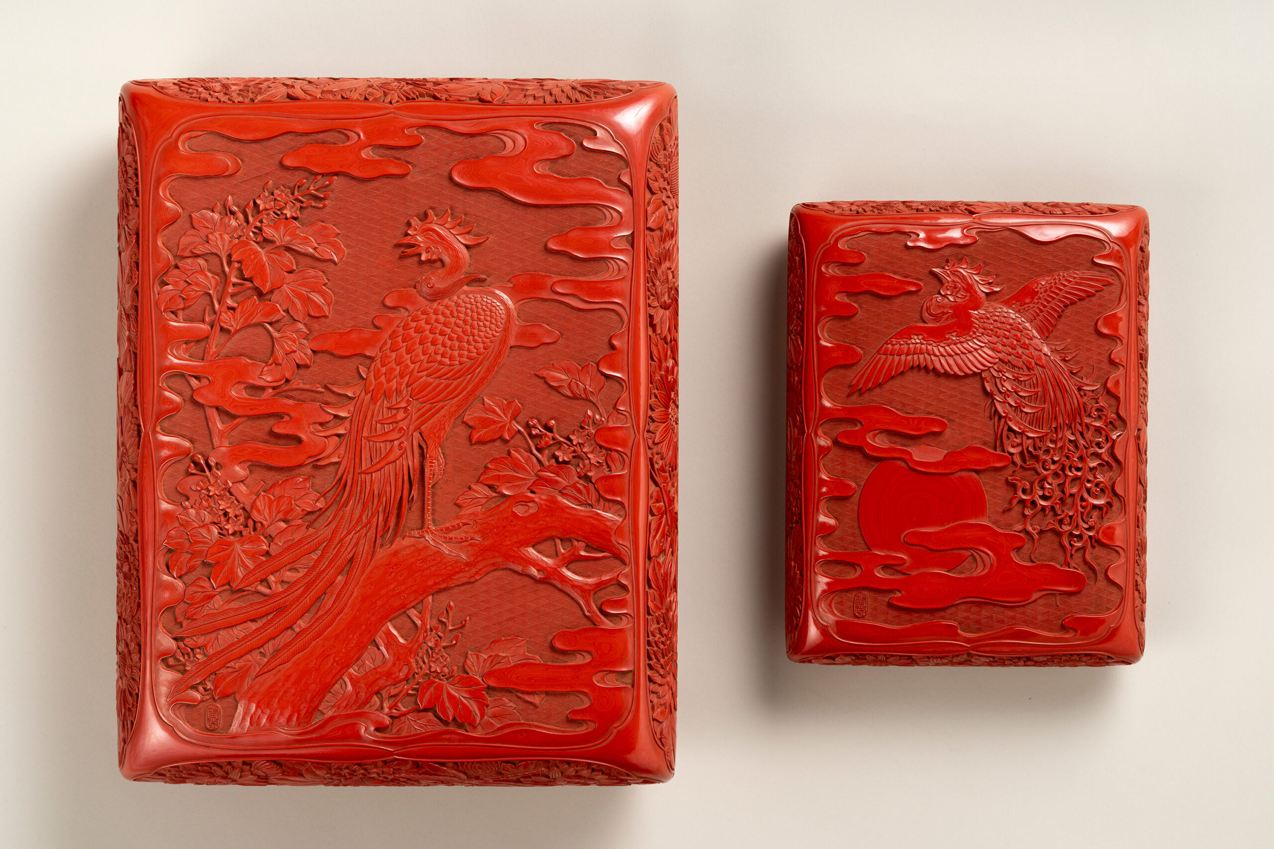 Both pieces are decorated with shared motifs of phoenixes and chrysanthemums, rendered in tsuishu (cinnabar lacquer)-a technique in which multiple layers of red lacquer are built up and then carved to reveal patterns. A phoenix with its wings outspread is depicted on the lid of the inkstone case, and chrysanthemum motifs adorn its sides. This is in contrast to the paper box, on which a phoenix perched upon a tree is depicted. In the background of the phoenix motif, the lacquer has been boldly carved away to create finely articulated seigaiha (wave) patterns, creating a pronounced sense of relief and depth.