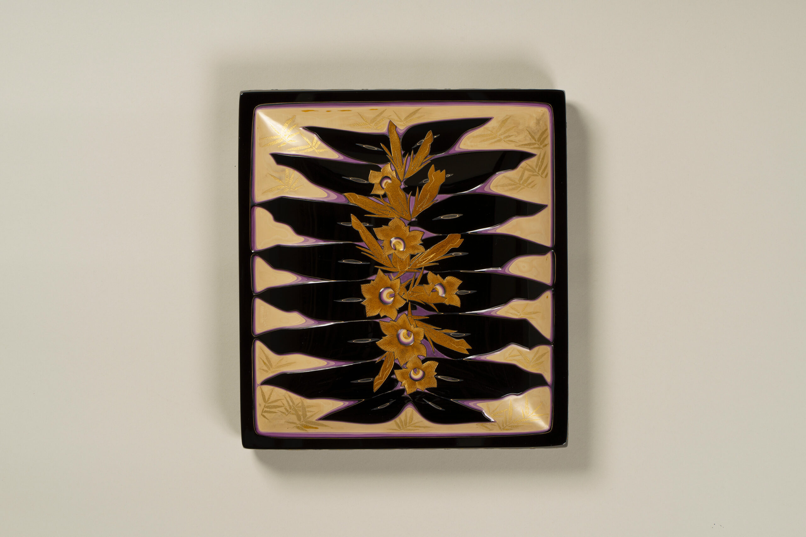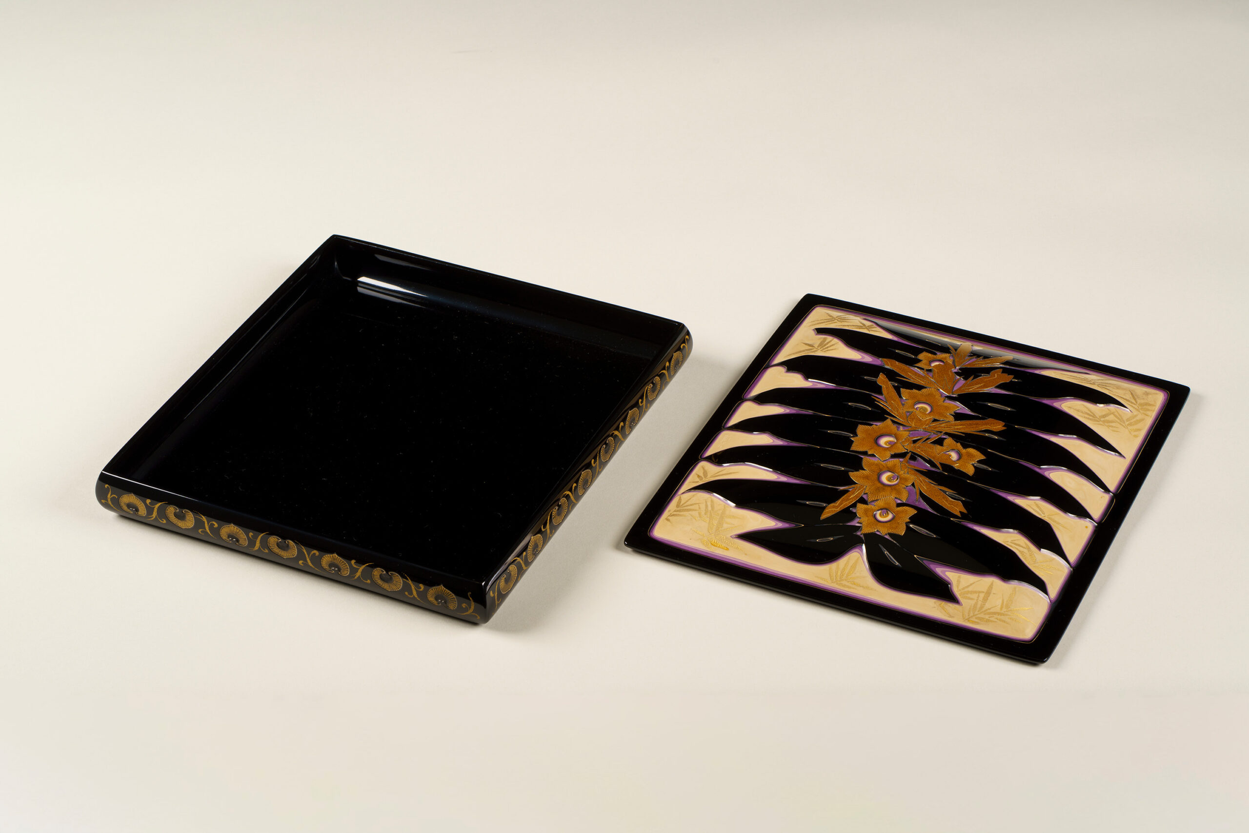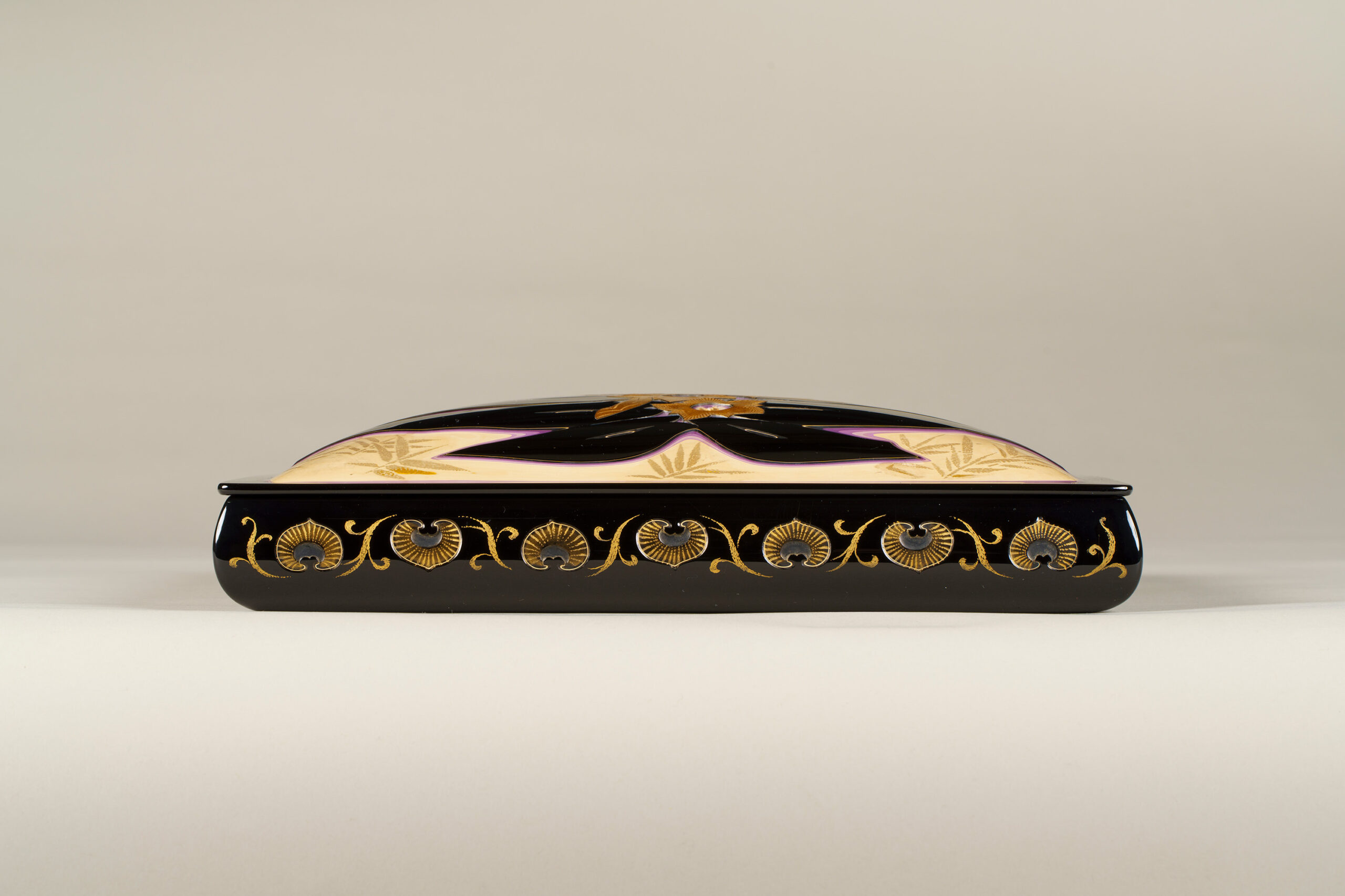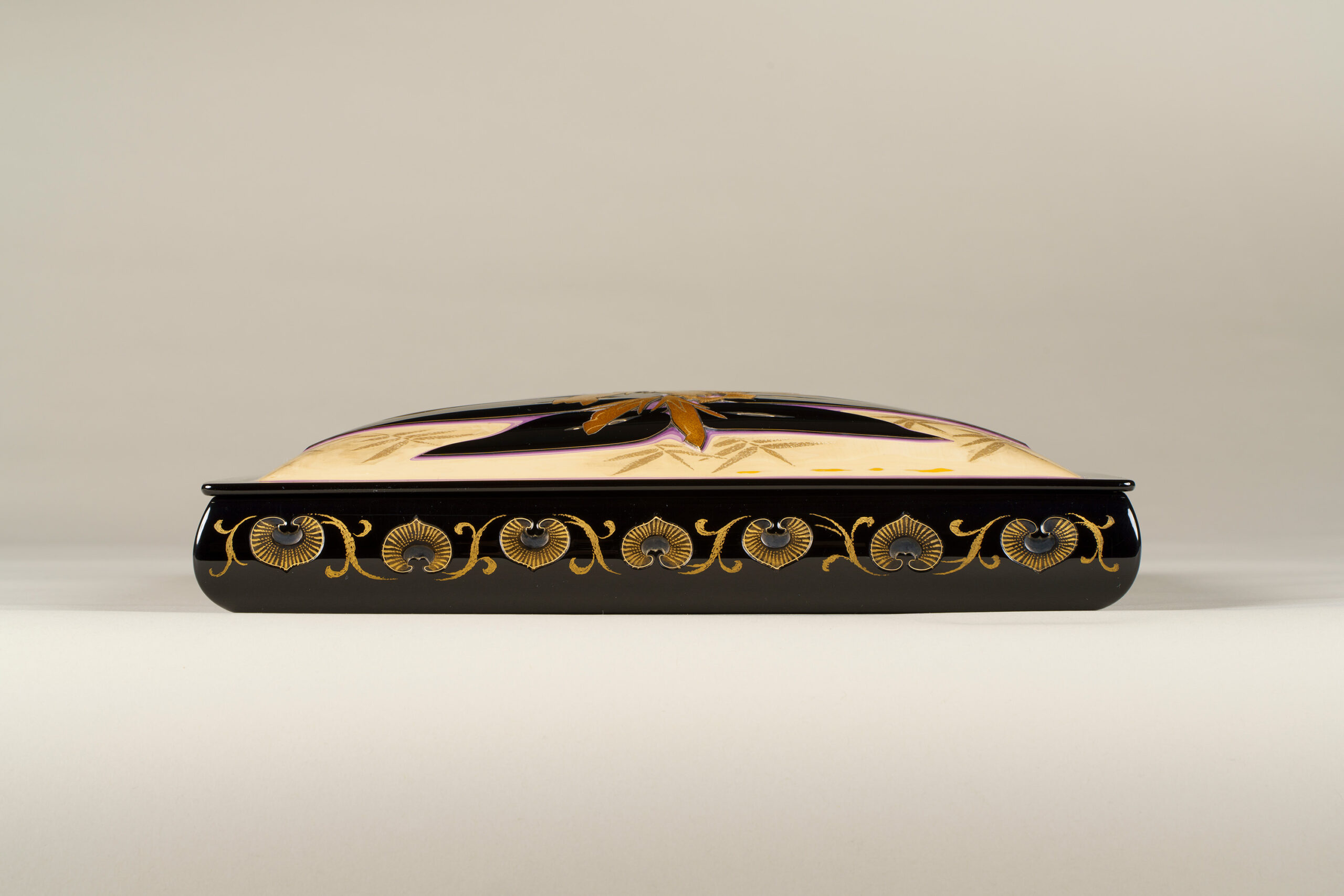 Using the chōshitsu (carved lacquer) technique in which layers of colored lacquer are built up and then carved to reveal patterns, the artist depicts trailing gentian flowers and buds at the center of the lid, with large leaves spreading expansively to either side. The design reflects a careful observation of nature which has been translated into a refined ornamental composition. The purple and white lacquers used in this work are derived from lake pigments, which the artist was quick to adopt. These pigments are produced by precipitating dyes using metal salts, a process that expanded the expressive range of color in lacquer art.