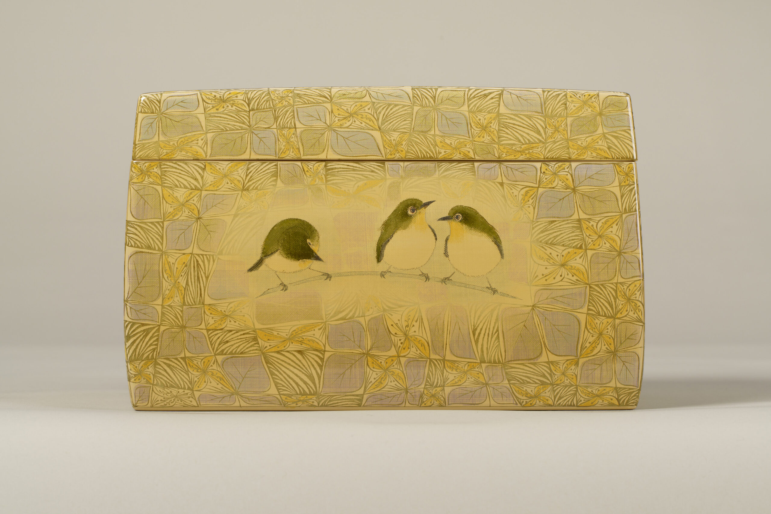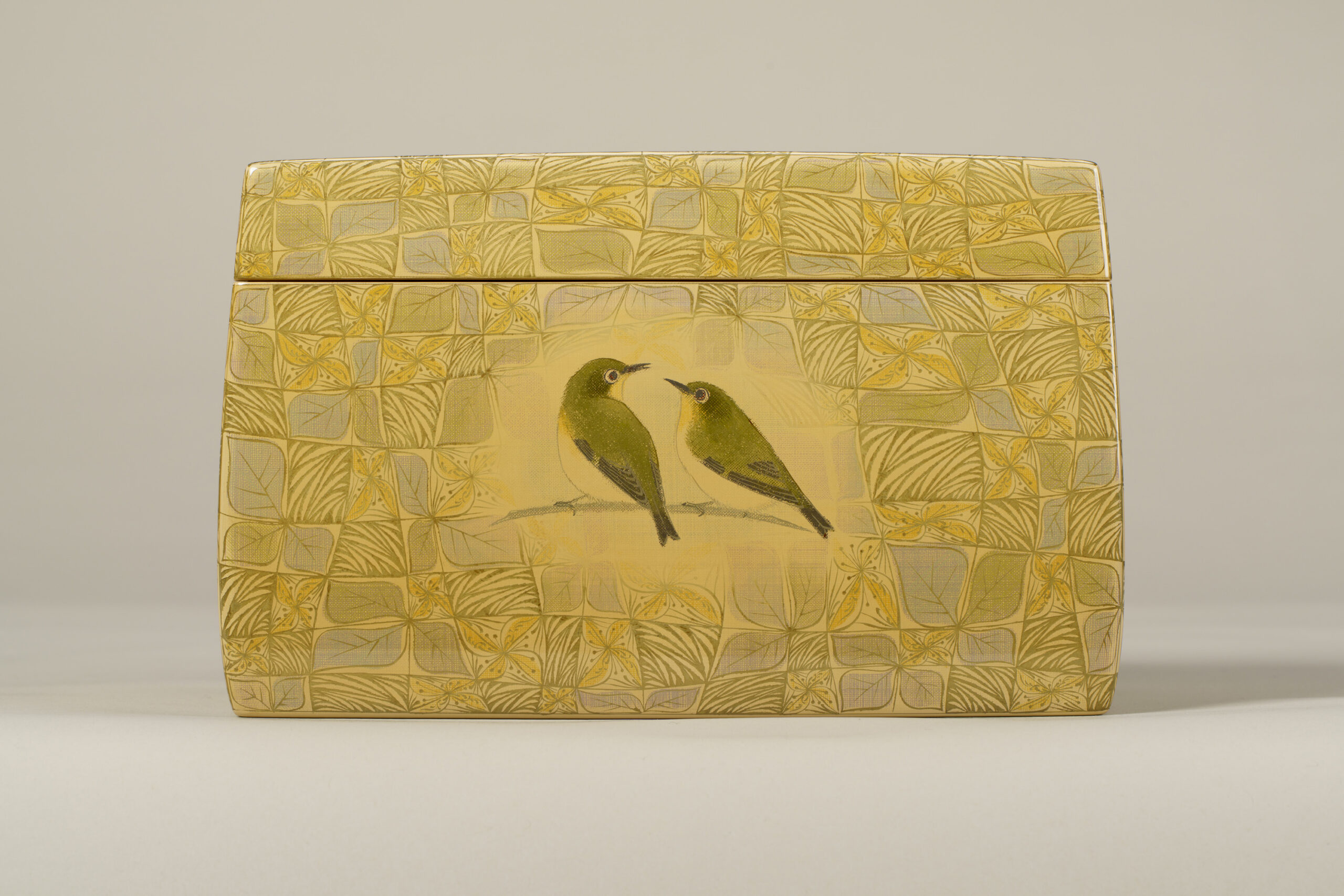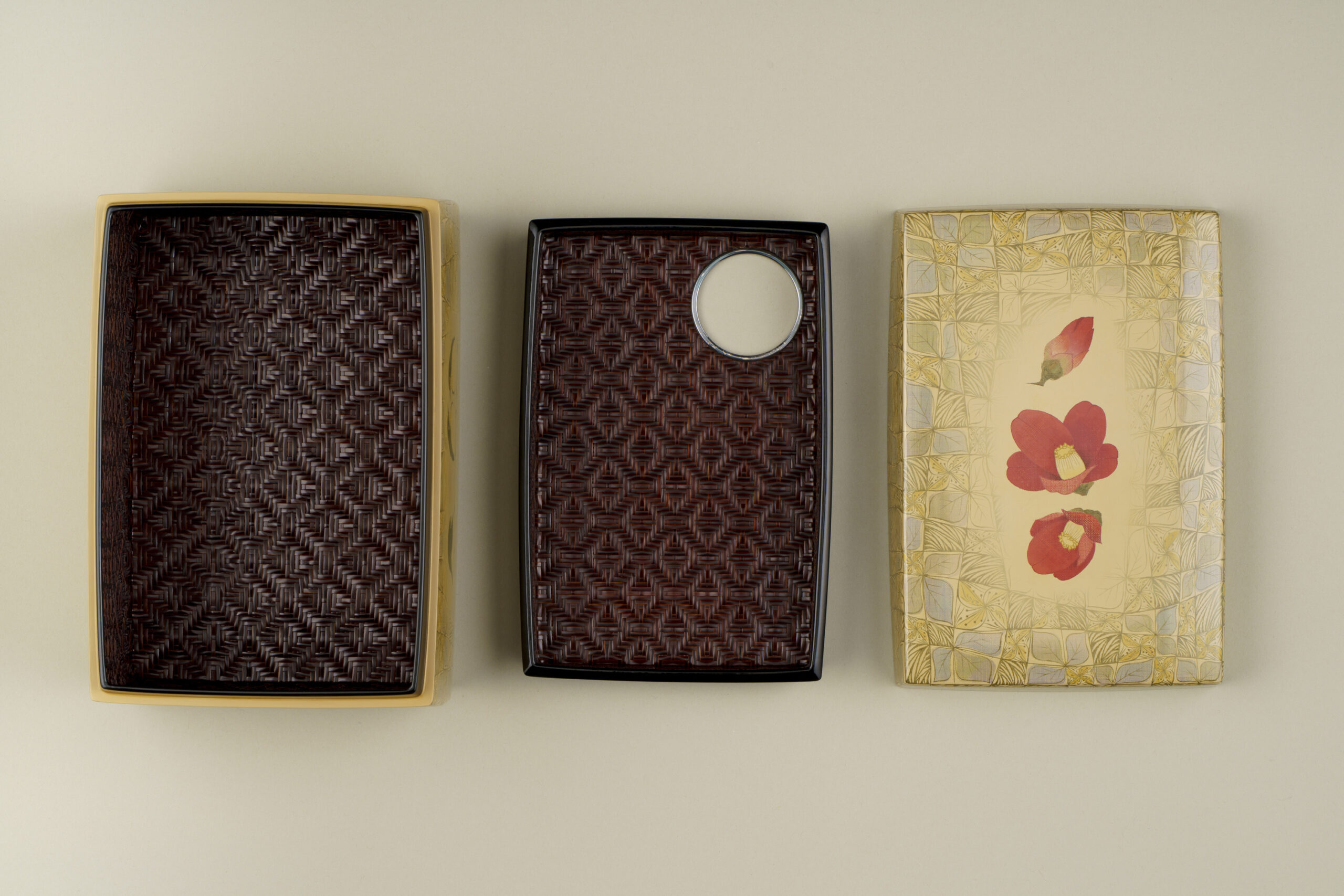 The base of this tea caddy is constructed from bamboo strips approximately 2 mm wide, woven into a basketry structure and reinforced through double layering. On the lid, a Japanese white-eye (mejiro) is depicted using the nunomebori kinma technique devised by the artist, and the interior reveals the intricate pattern formed by the woven bamboo strips of the rantai base. The flexibility of the bamboo structure protects the tea utensils stored within. Ōta Hitoshi was born in Okayama Prefecture. He later became a close disciple of the lacquer artist Isoi Joshin, then a professor at Okayama University. After completing his studies, he relocated to Kagawa Prefecture. In 1994, he was designated a Holder of an Important Intangible Cultural Property, Kinma. Through the extensive study of classical works, Ōta revived the rantai basketry base by developing a double-weaving method that enhanced the structural strength of the base. He then devised the nunomebori technique, which is characterized by repeated fine lines cut vertically, horizontally and diagonally to create a fabric-like pattern. Through the fusion of classical tradition and creative innovation, he opened the door to new possibilities for expression in lacquer art.