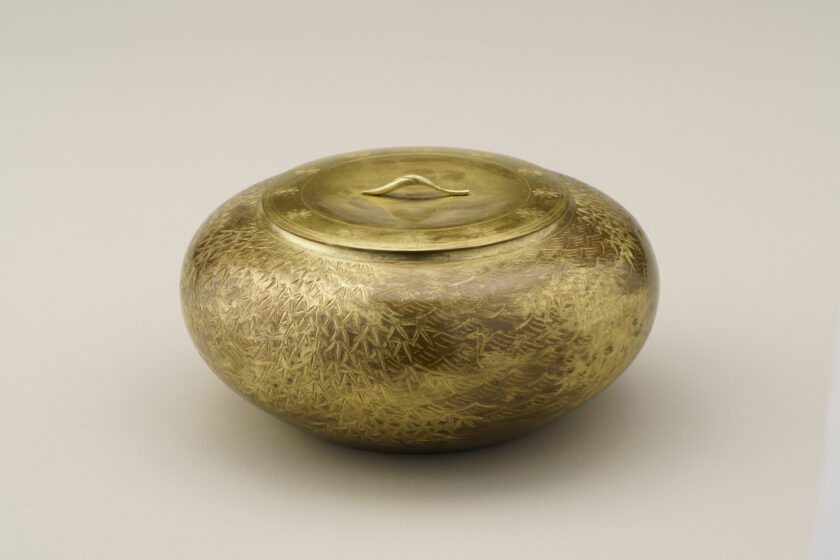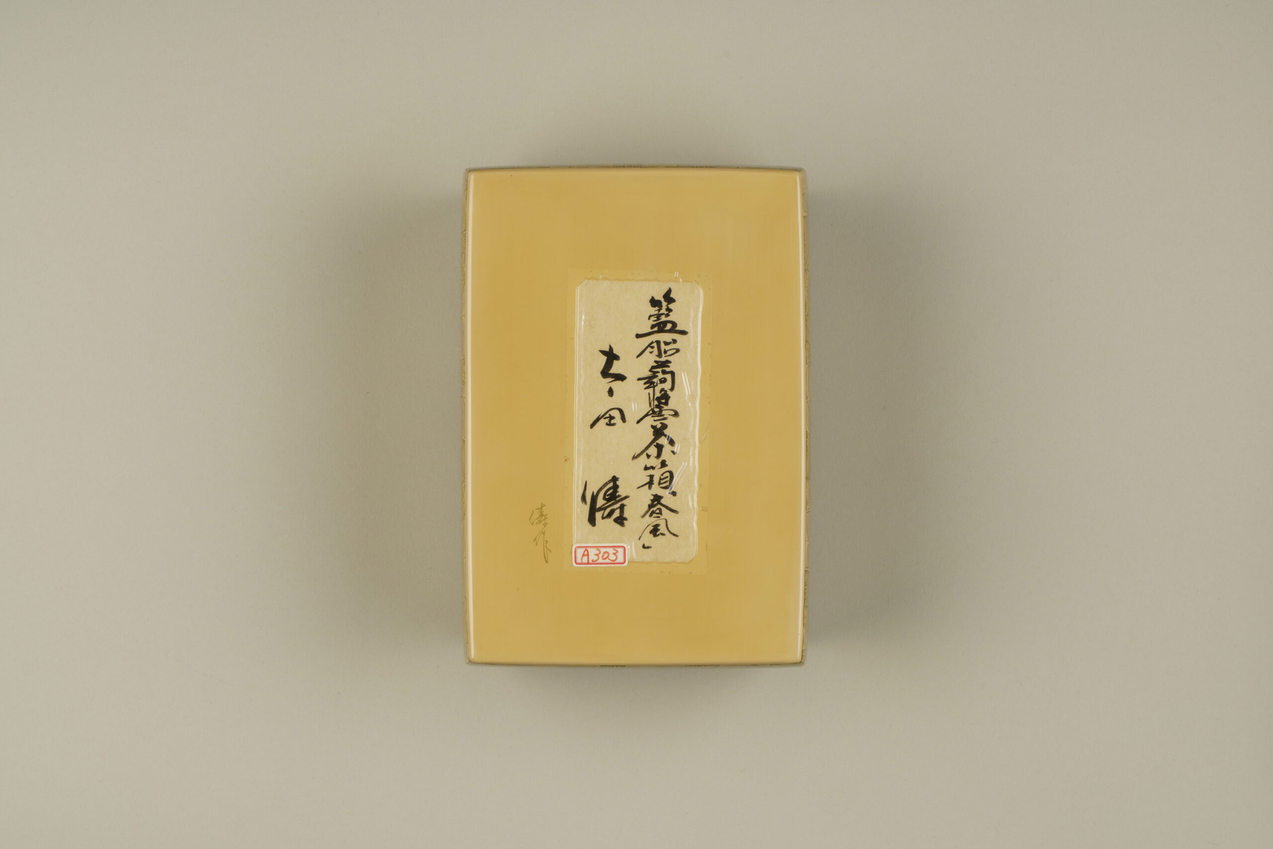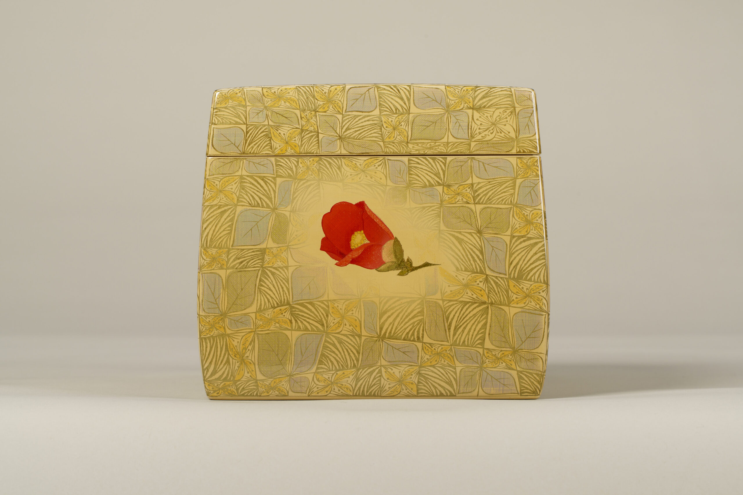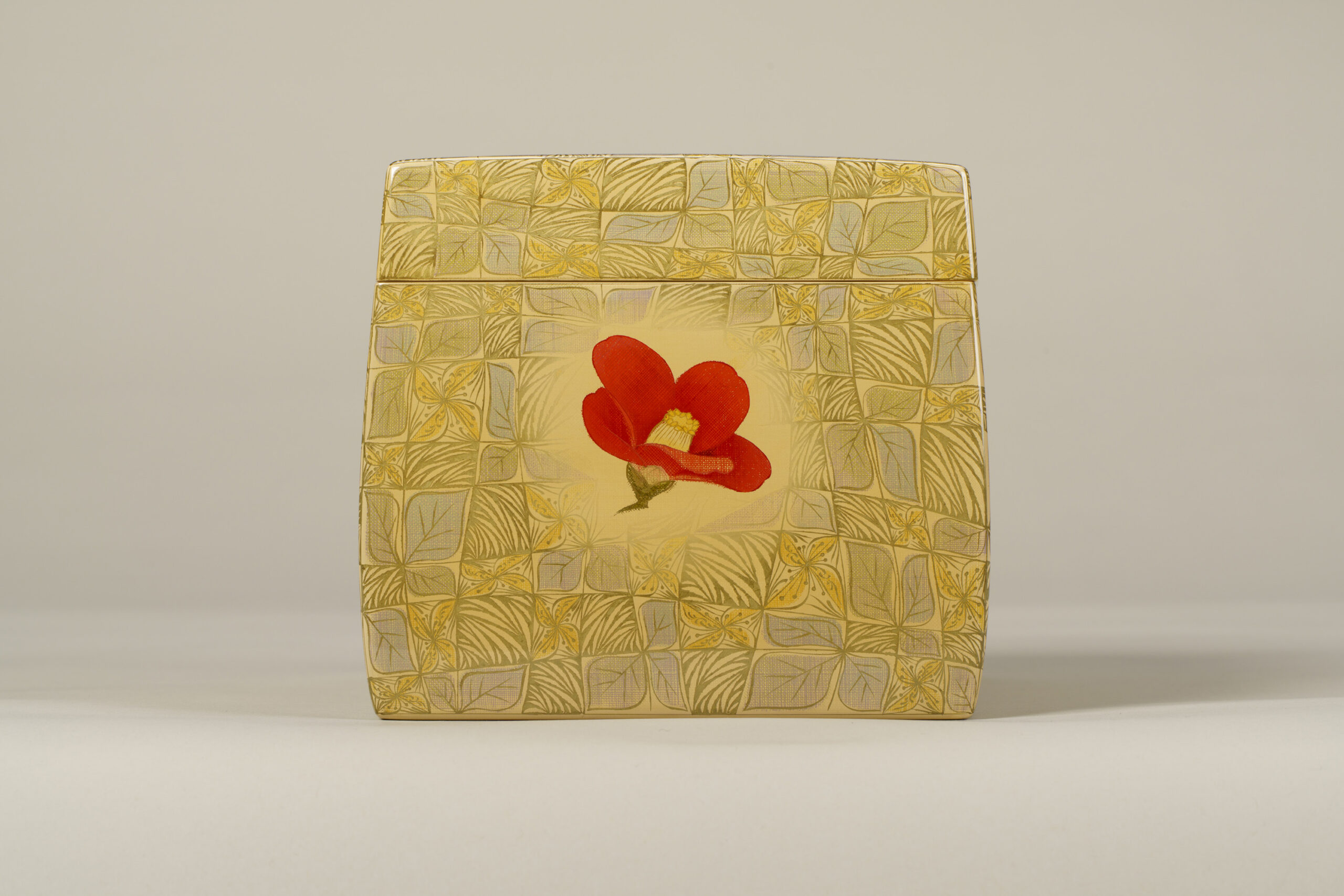 The base of this tea caddy is constructed from bamboo strips approximately 2 mm wide, woven into a basketry structure and reinforced through double layering. On the lid, a Japanese white-eye (mejiro) is depicted using the nunomebori kinma technique devised by the artist, and the interior reveals the intricate pattern formed by the woven bamboo strips of the rantai base. The flexibility of the bamboo structure protects the tea utensils stored within. Ōta Hitoshi was born in Okayama Prefecture. He later became a close disciple of the lacquer artist Isoi Joshin, then a professor at Okayama University. After completing his studies, he relocated to Kagawa Prefecture. In 1994, he was designated a Holder of an Important Intangible Cultural Property, Kinma. Through the extensive study of classical works, Ōta revived the rantai basketry base by developing a double-weaving method that enhanced the structural strength of the base. He then devised the nunomebori technique, which is characterized by repeated fine lines cut vertically, horizontally and diagonally to create a fabric-like pattern. Through the fusion of classical tradition and creative innovation, he opened the door to new possibilities for expression in lacquer art.