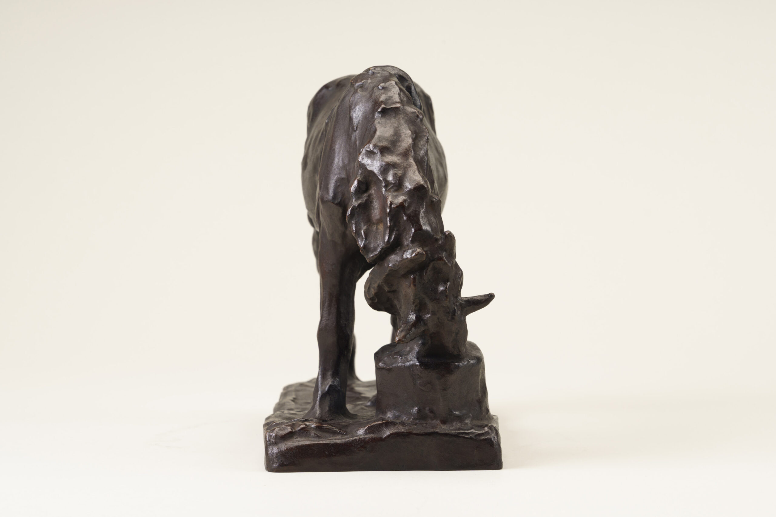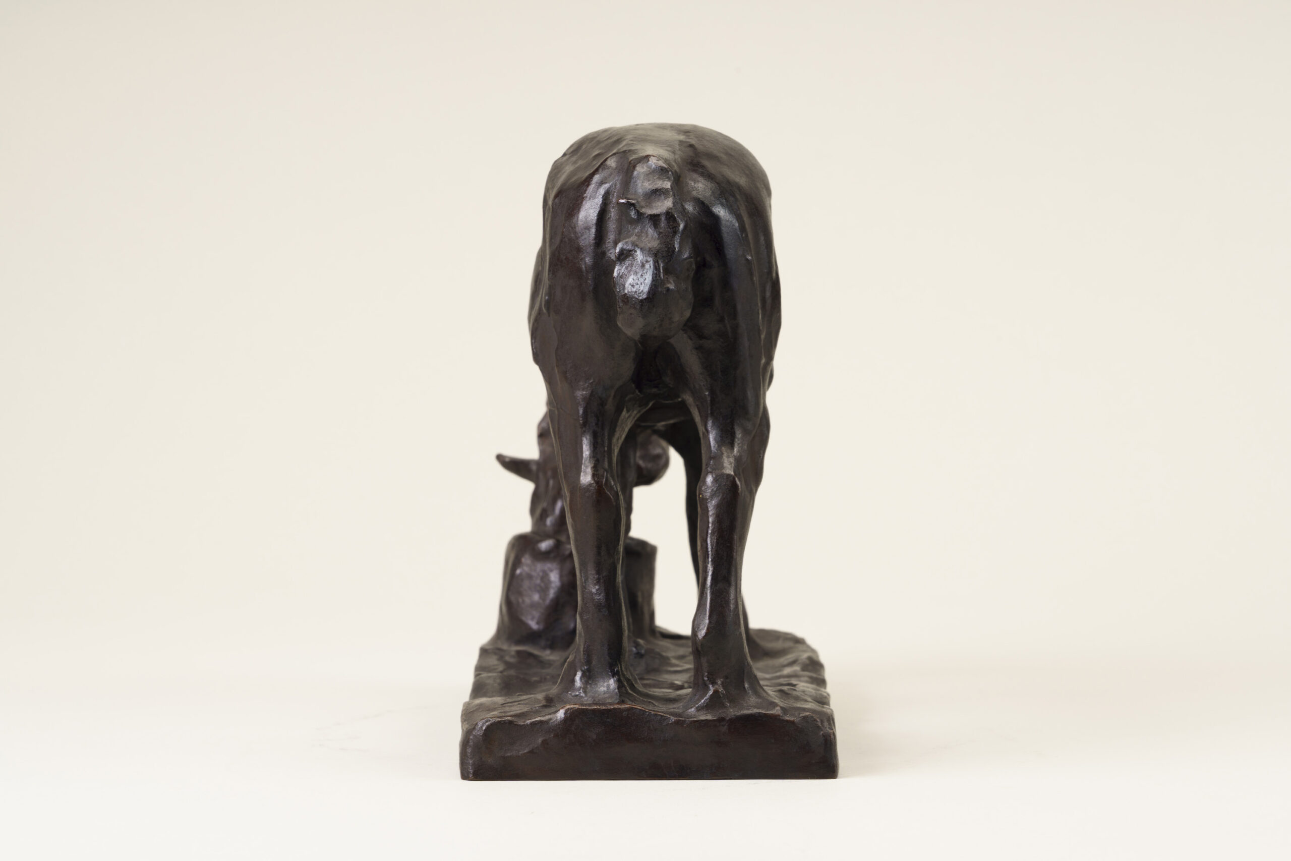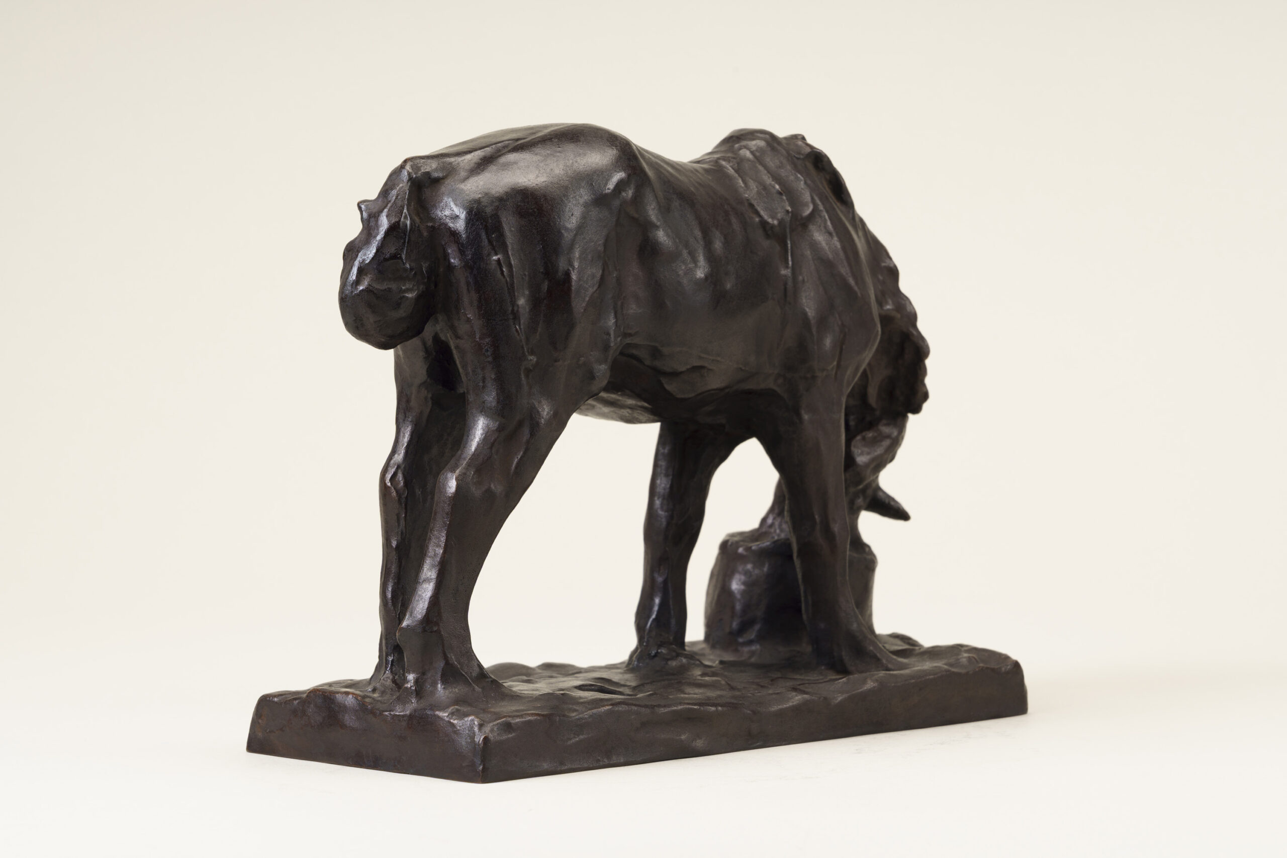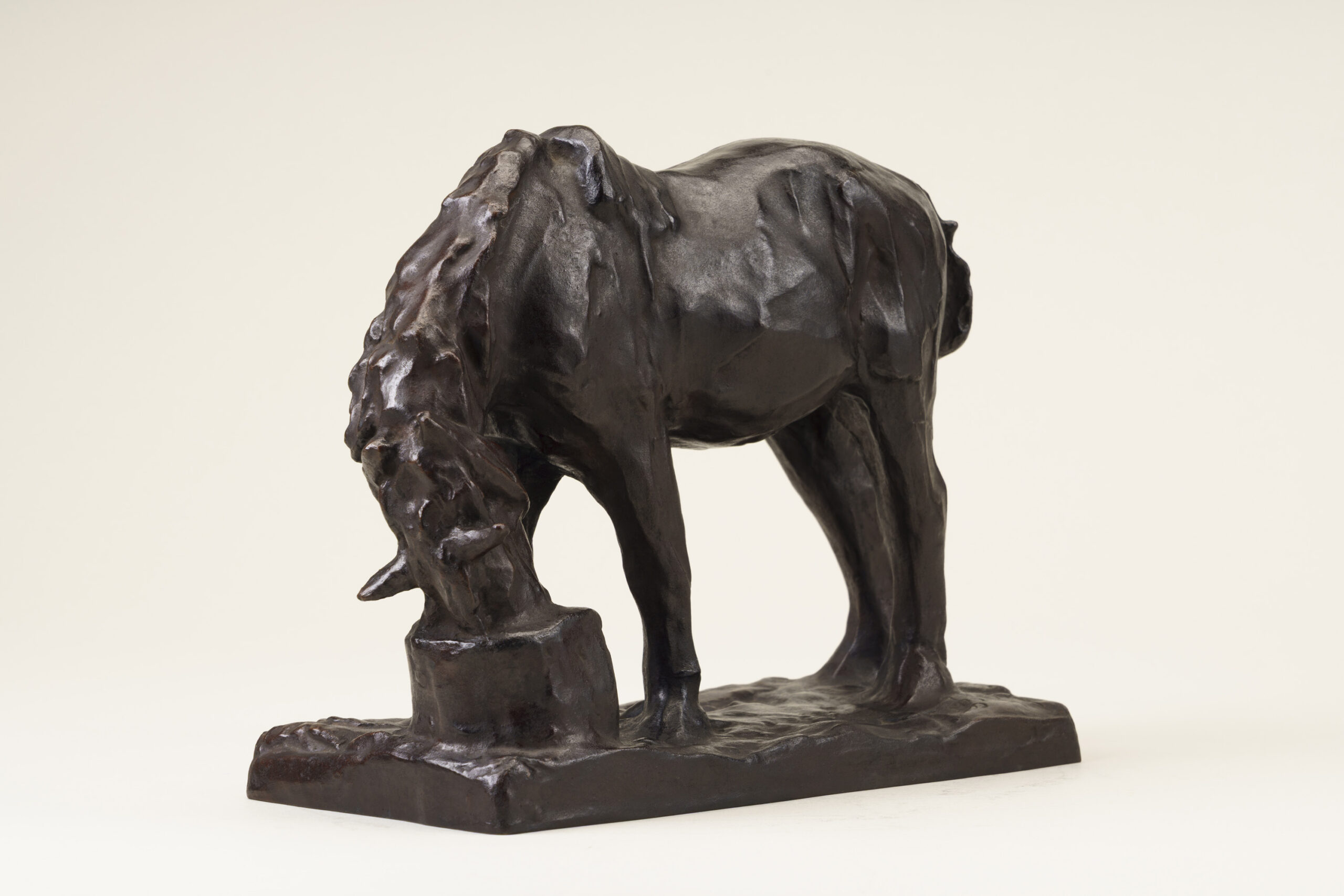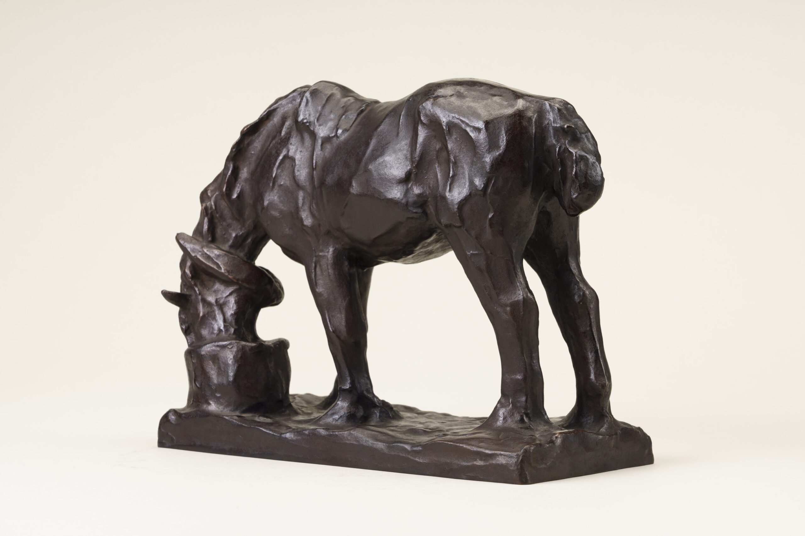 This sculpture depicts a horse lowering its head into a feed trough, absorbed in chewing fodder. While the modeling is gentle and rounded, the underlying movement of the horse’s skeletal structure is accurately understood and rendered. The animal’s inherent charm is vividly and tenderly conveyed.