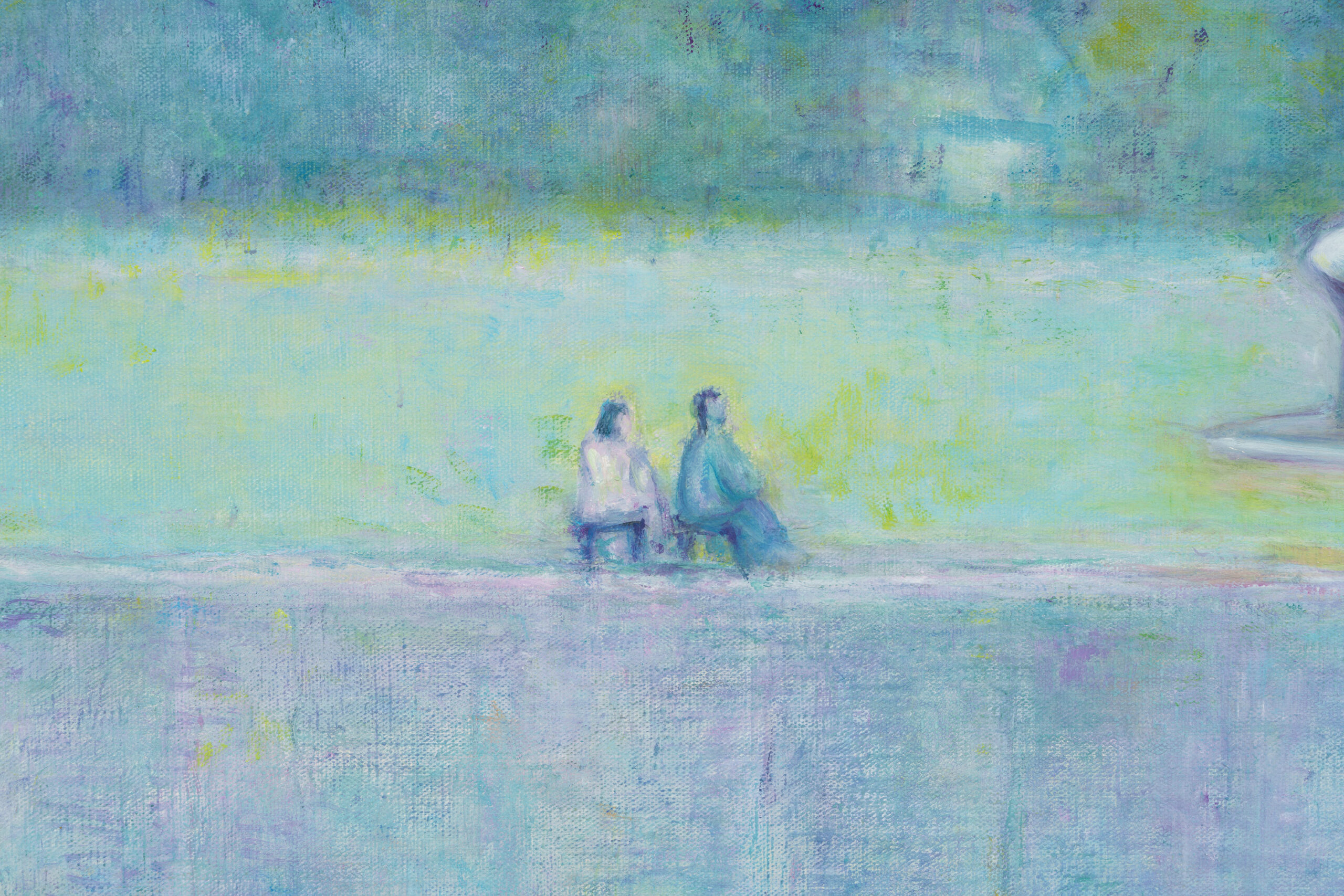 Beyond the window frame stretches an expansive view of an open plaza bordered by groves of trees and a distant mountain range. In the plaza stands a sculpture by Henry Moore, beside which two figures are quietly poised. While Fujikawa explored a wide range of pictorial styles, including those of Picasso and Mondrian, she ultimately, in her later years, arrived at a mode of expression characterized by gentle color and brushwork, through which she depicted scenes imbued with a quiet, dreamlike quality.