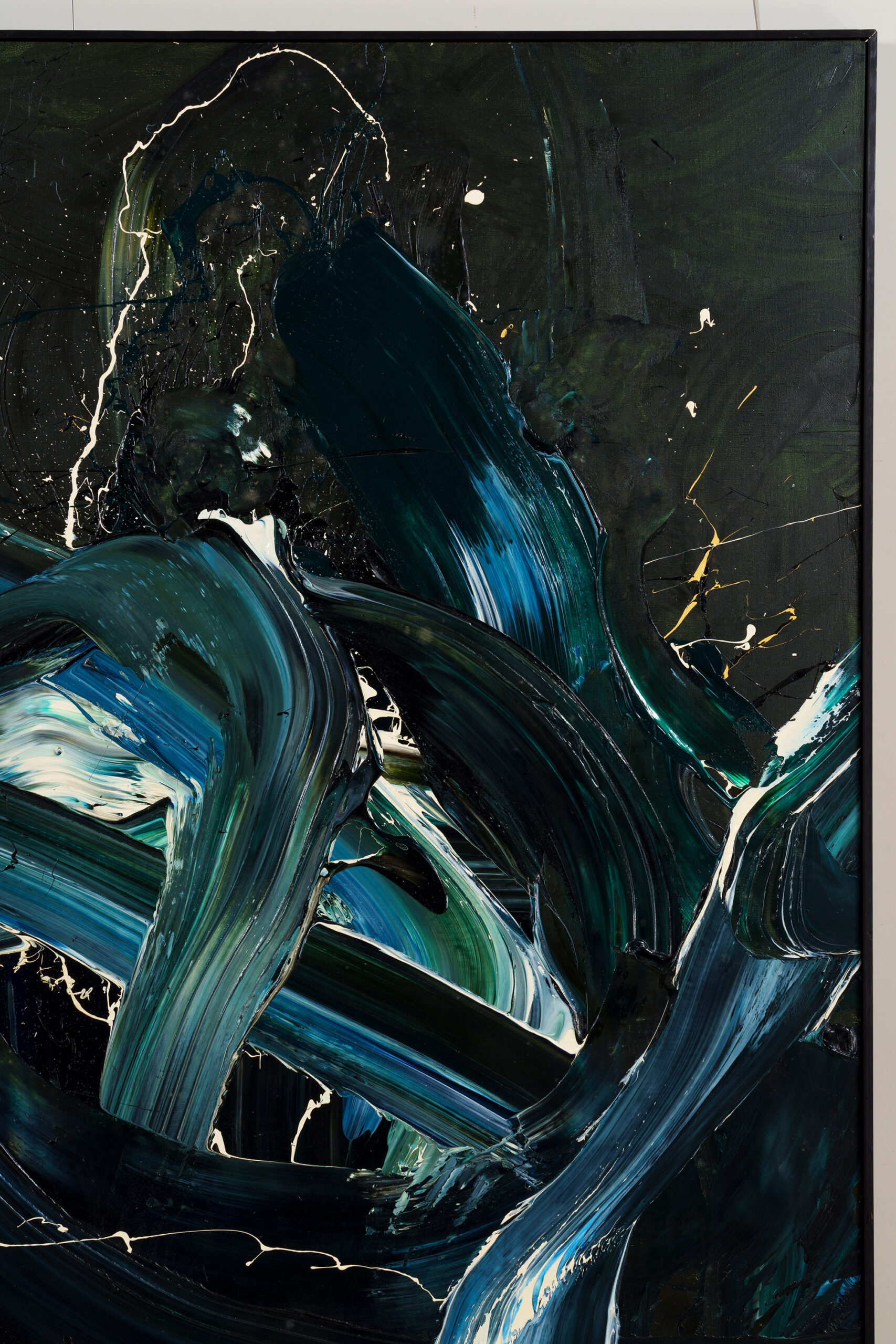 Indigo and white paint are intertwined in broad, sweeping arcs against a deep indigo background. Kanro Gundari refers to one of the Five Great Wisdom Kings in Esoteric Buddhism. Kanro (amrita) is the elixir of immortality in Indian mythology. It is said to be produced by the gods using their combined power to churn the great ocean. Shiraga created this work by laying a hemp-cloth canvas on the floor and painting with his feet. By moving his entire body on a grand scale, he generated a pictorial surface charged with violently undulating motion.