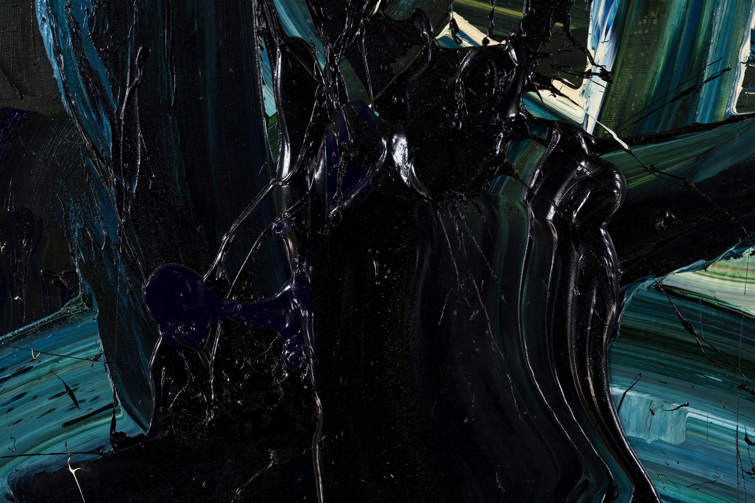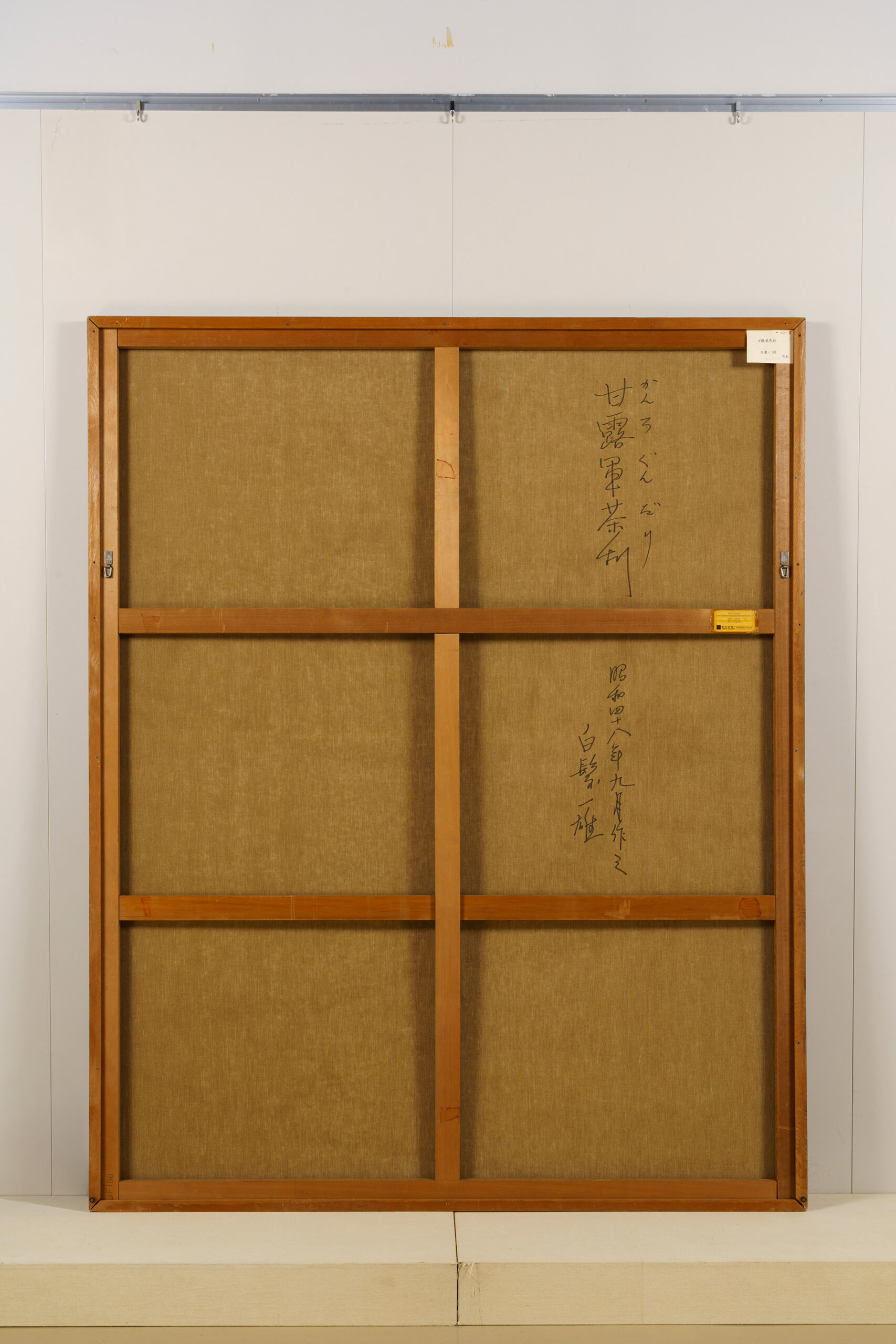 Indigo and white paint are intertwined in broad, sweeping arcs against a deep indigo background. Kanro Gundari refers to one of the Five Great Wisdom Kings in Esoteric Buddhism. Kanro (amrita) is the elixir of immortality in Indian mythology. It is said to be produced by the gods using their combined power to churn the great ocean. Shiraga created this work by laying a hemp-cloth canvas on the floor and painting with his feet. By moving his entire body on a grand scale, he generated a pictorial surface charged with violently undulating motion. Shiraga Kazuo was born in Hyōgo Prefecture. He studied nihonga (traditional Japanese-style painting) at the Kyoto Prefectural School of Painting (now Kyoto City University of Arts) from 1948, before turning to Western-style painting after graduation. In 1955, he joined the Gutai Art Association, which had been founded the previous year by avant-garde artist Yoshihara Jirō and young artists from the Hanshin region. Shiraga went on to play a central role in its activities.