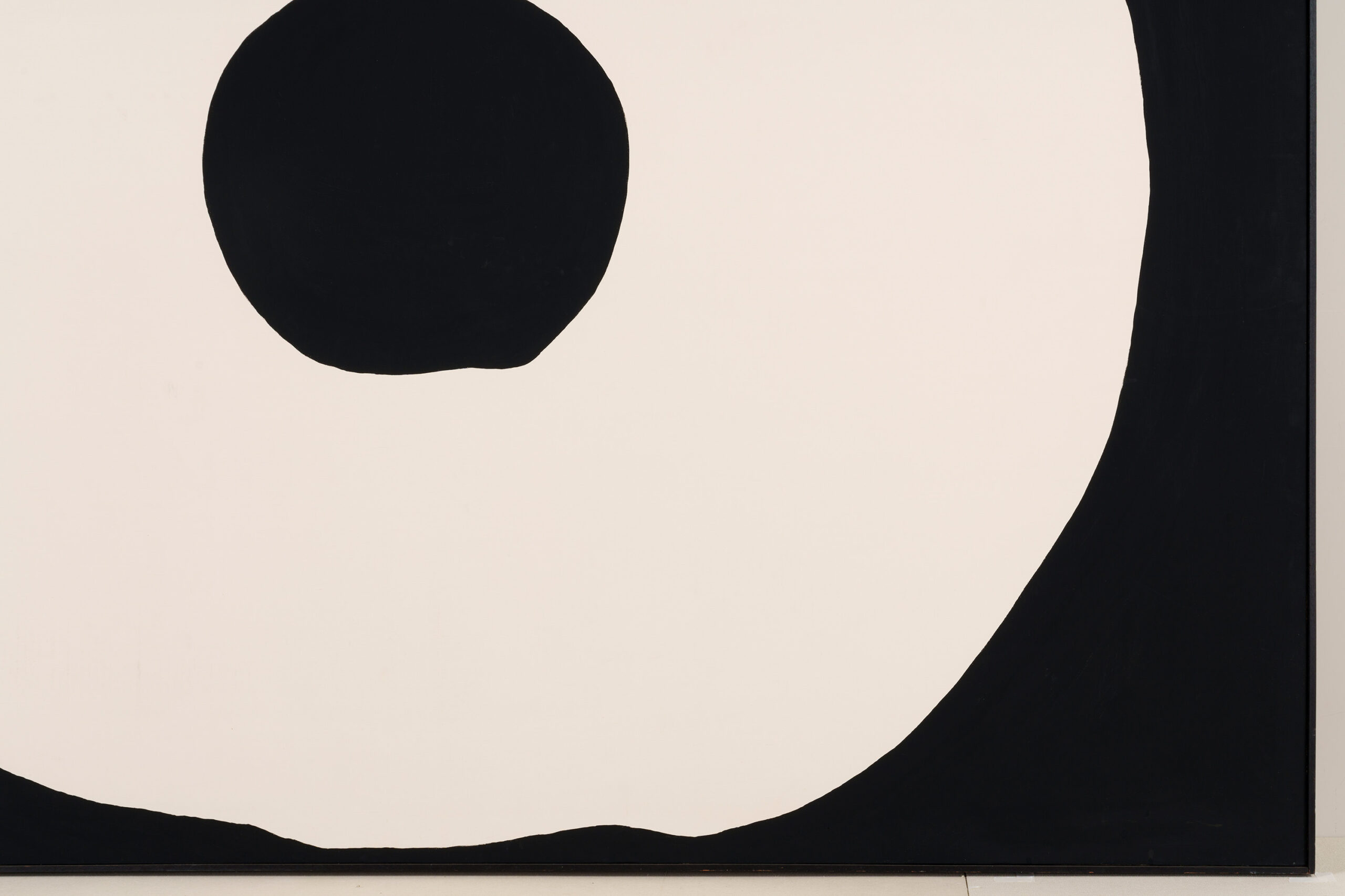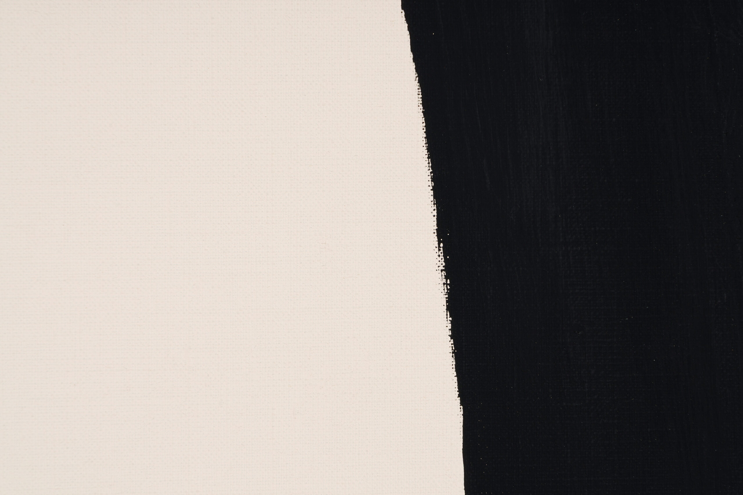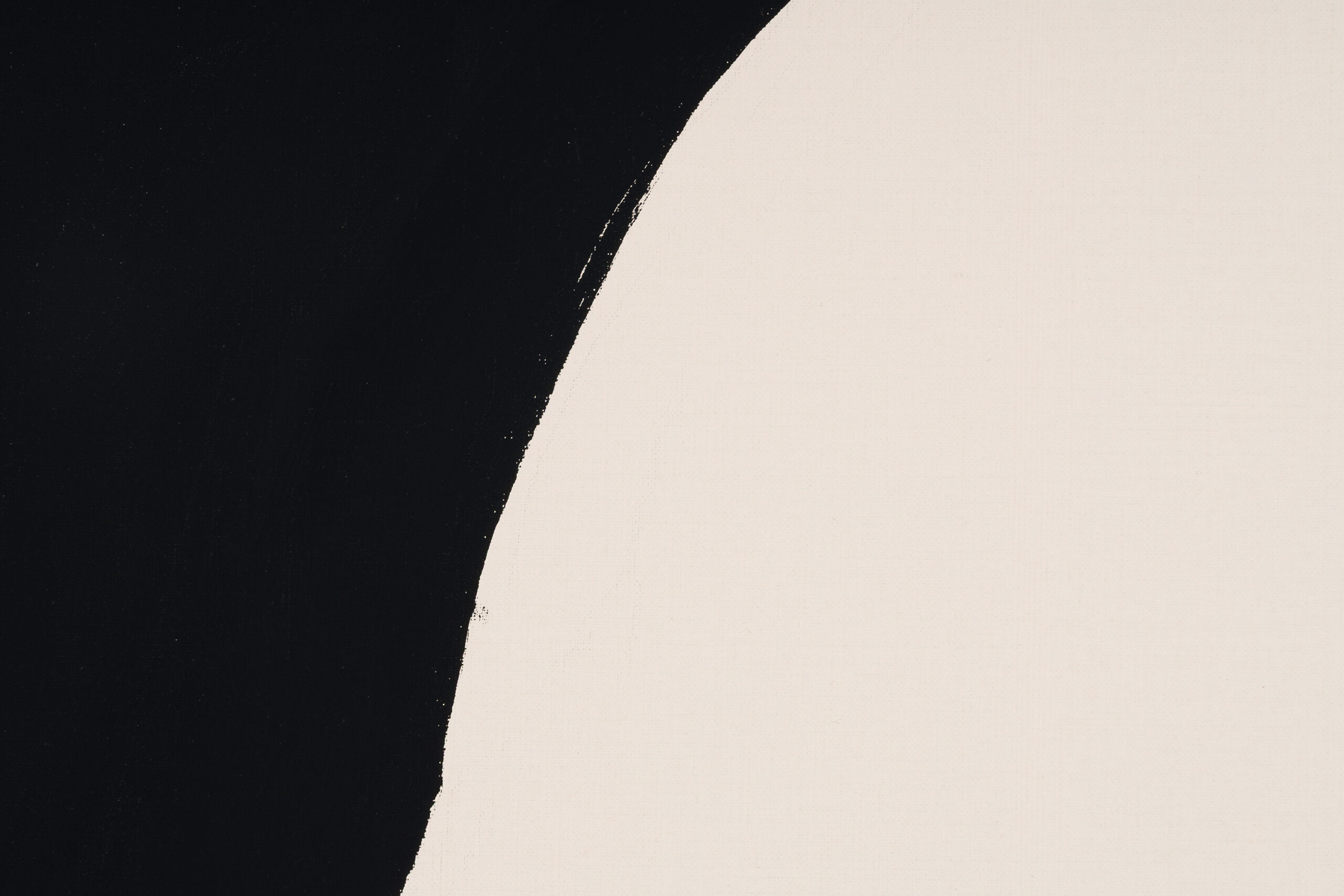 At first glance, the work appears to consist of white paint applied on a black background. In fact, however, it is created by leaving areas of the white background exposed and laying black oil paint on top of it. By deliberately creating a disjunction between the method of painting the viewer imagines and the method actually employed, the work prompts reflection on the very act of painting itself.