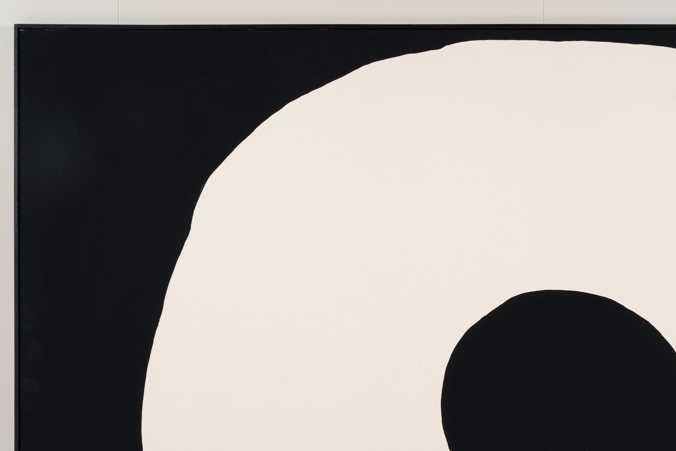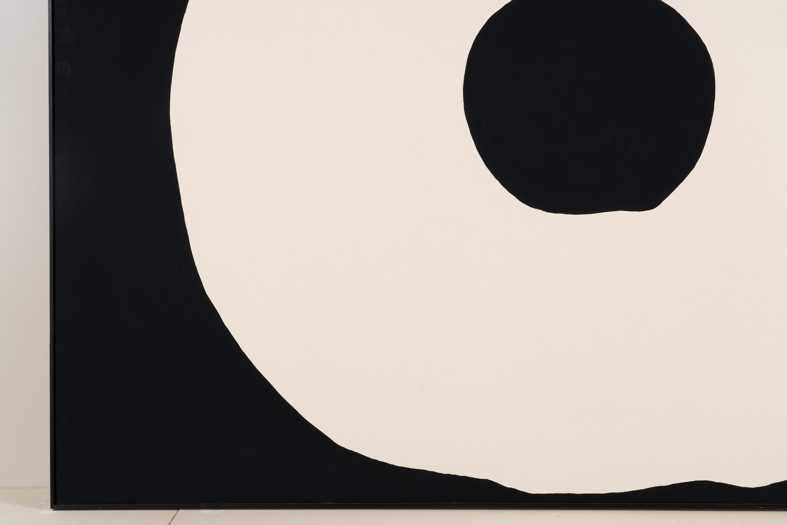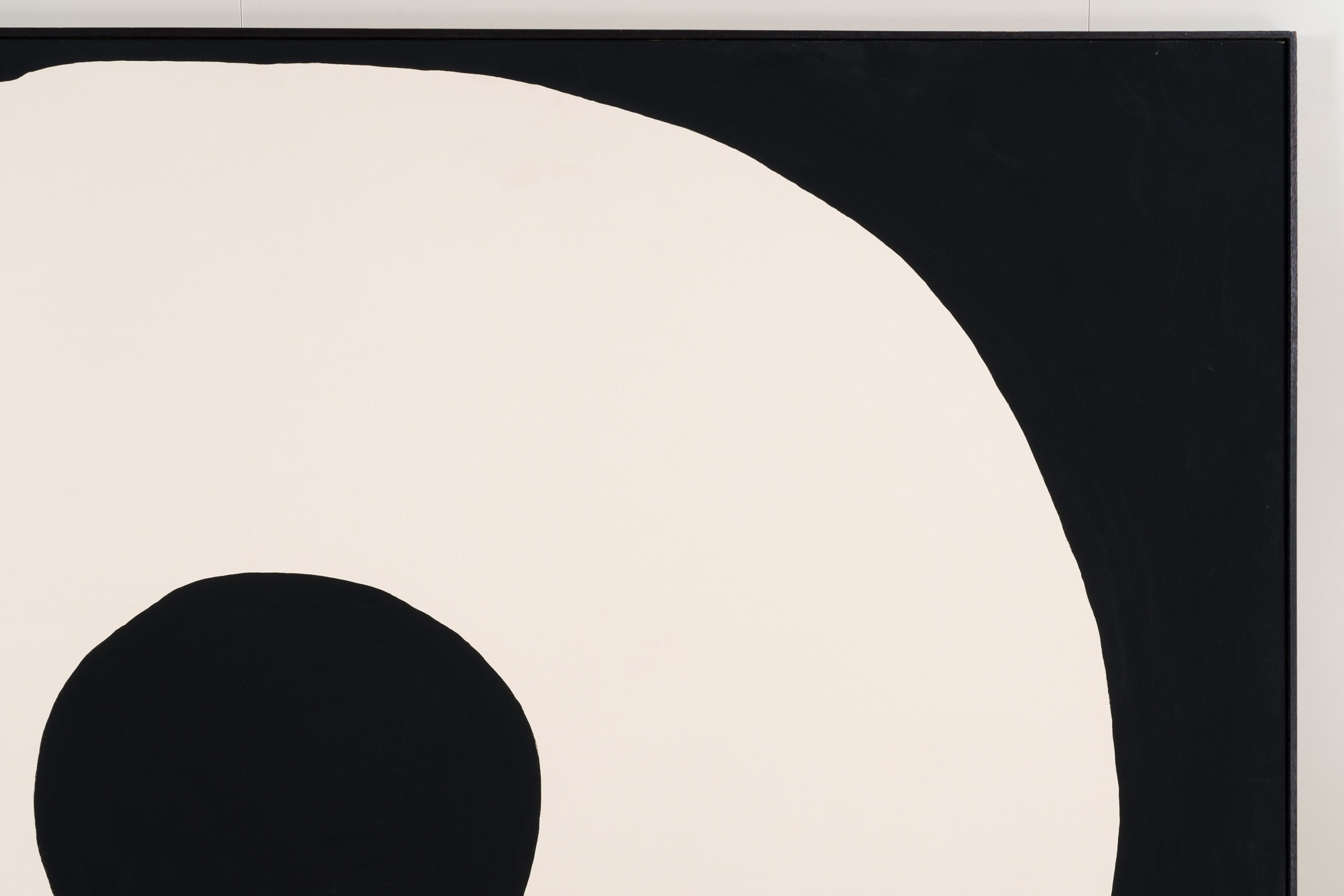 At first glance, the work appears to consist of white paint applied on a black background. In fact, however, it is created by leaving areas of the white background exposed and laying black oil paint on top of it. By deliberately creating a disjunction between the method of painting the viewer imagines and the method actually employed, the work prompts reflection on the very act of painting itself.