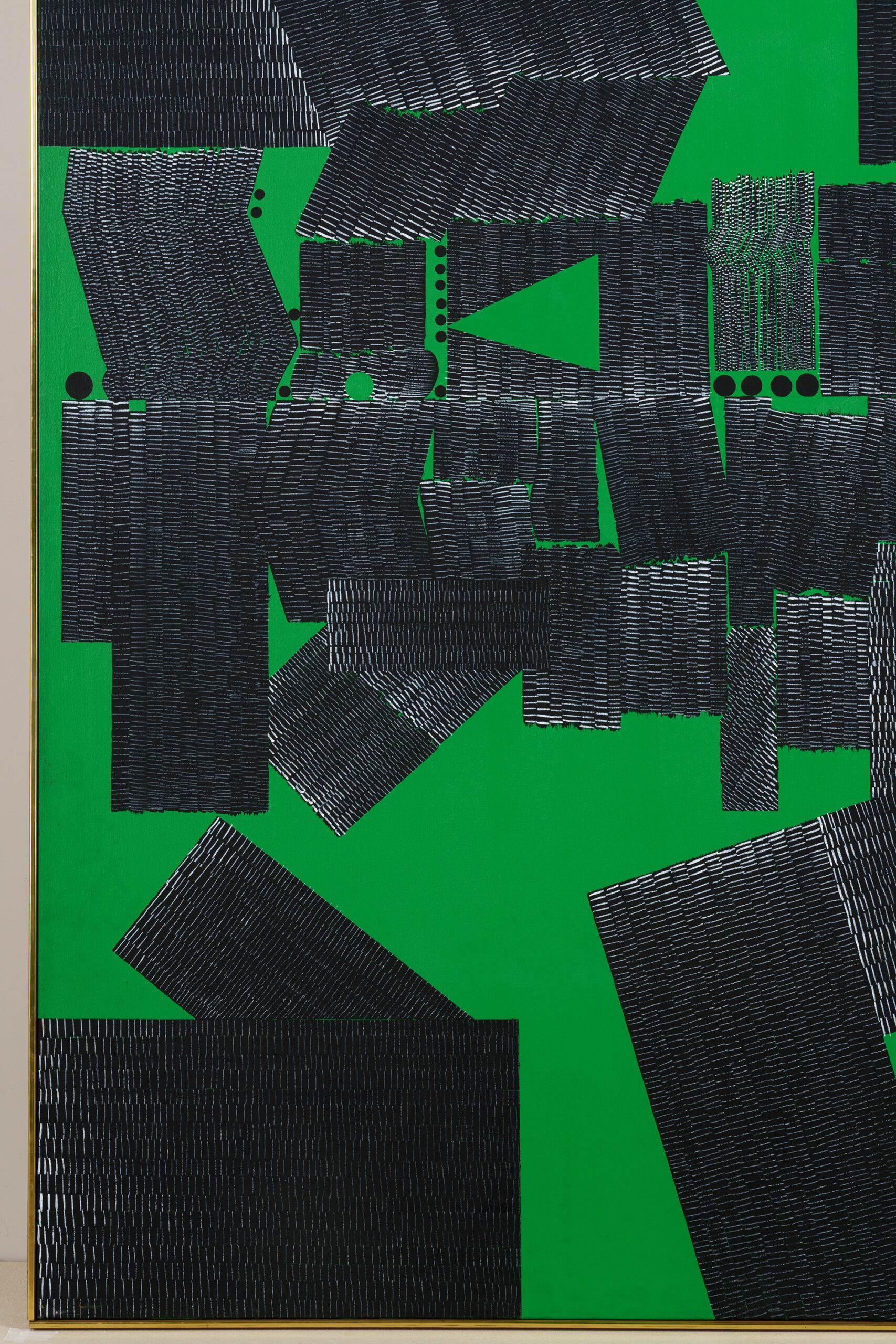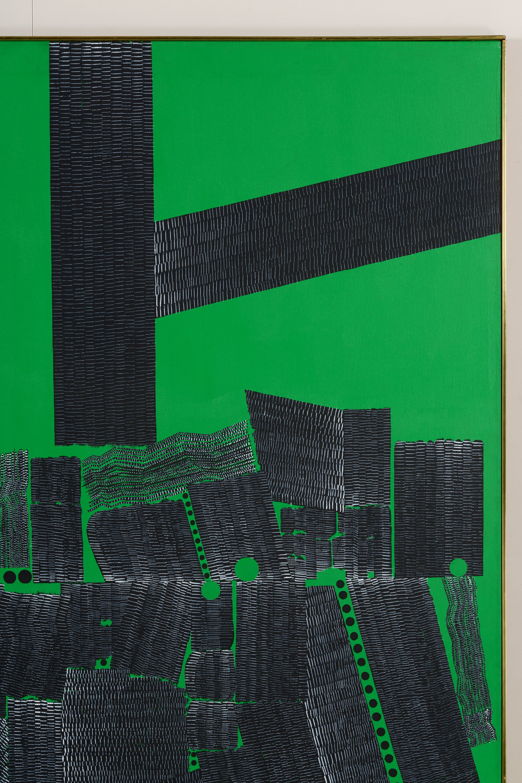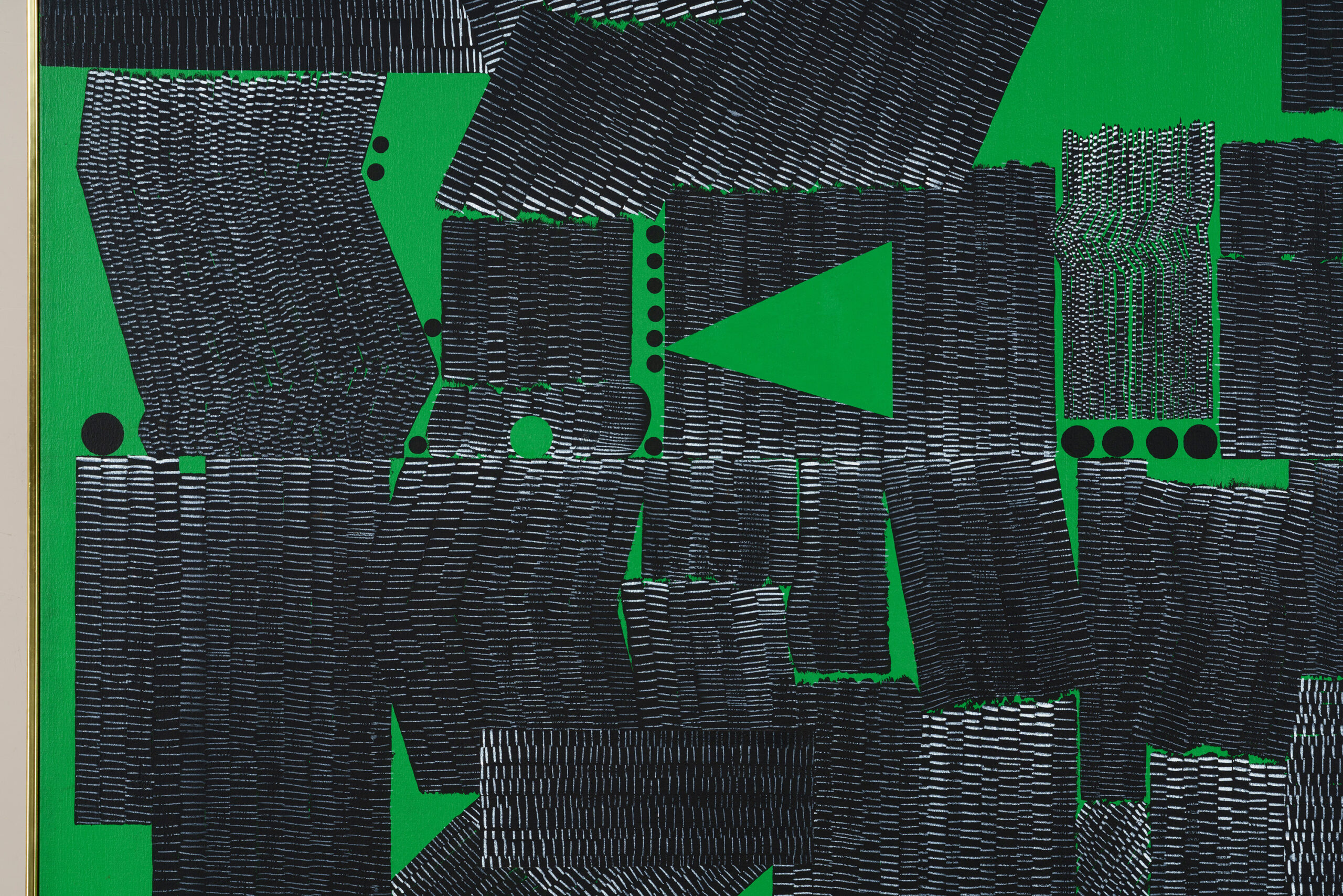 Against a uniformly green background, bold black lines run vertically, horizontally, and diagonally. Varying in direction, length, and thickness, these lines are punctuated by occasional small black dots. The resulting composition evokes both a decorative pattern and a map-like image. This work was created during Inokuma’s thirteenth year in New York.