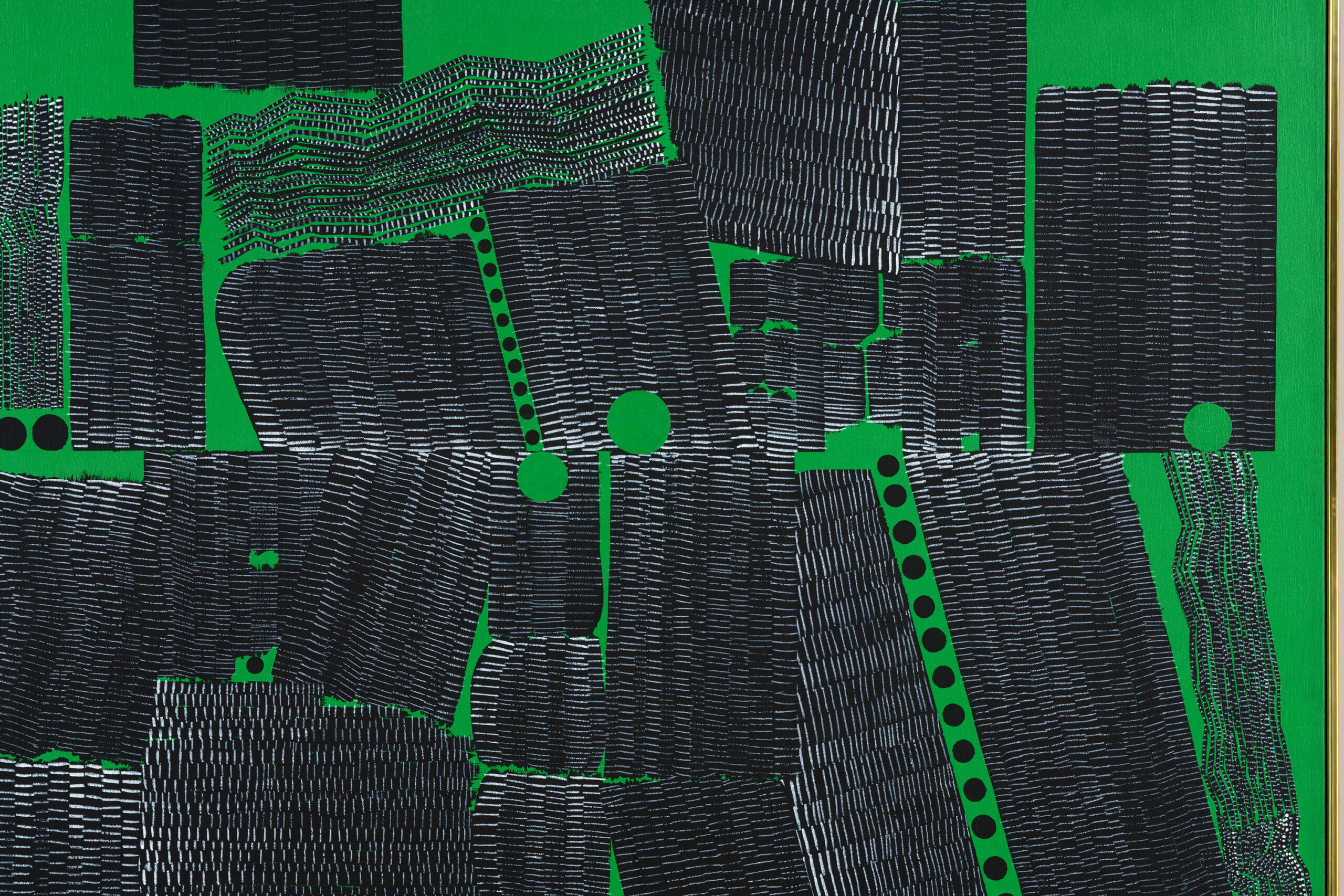 Against a uniformly green background, bold black lines run vertically, horizontally, and diagonally. Varying in direction, length, and thickness, these lines are punctuated by occasional small black dots. The resulting composition evokes both a decorative pattern and a map-like image. This work was created during Inokuma’s thirteenth year in New York. Inokuma Genichirō was born in Takamatsu City. He graduated from Kagawa Prefectural Marugame Middle School (now Kagawa Prefectural Marugame High School) and went on to study Western-style painting at the Tokyo School of Fine Arts (now Tokyo University of the Arts). He traveled to Europe in 1938 and returned to Japan in 1940. In 1955, while en route to Europe once again, he was captivated by the vibrant energy of New York and made the city his base, devoting himself to abstract expression. From 1975 onward, he worked in Tokyo and Hawaii.