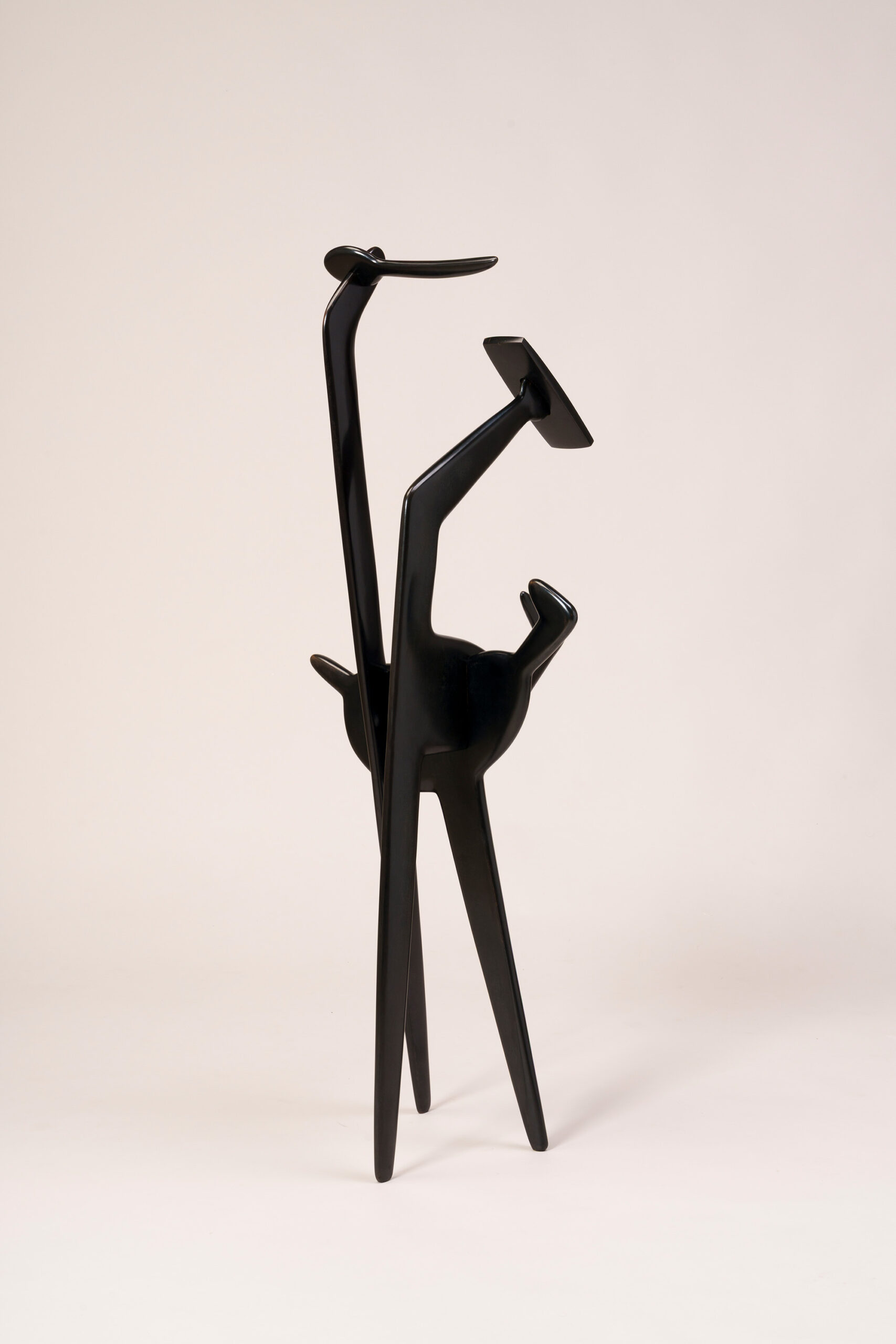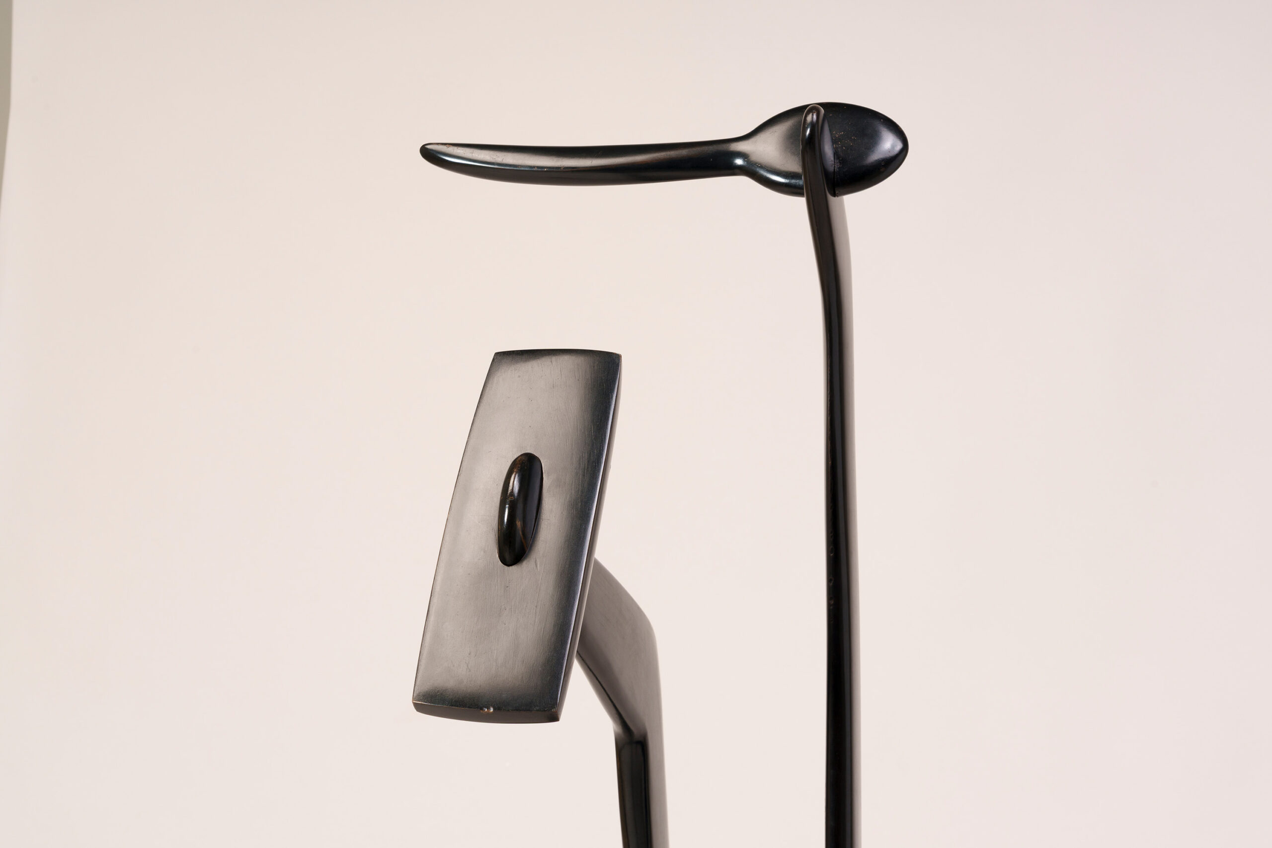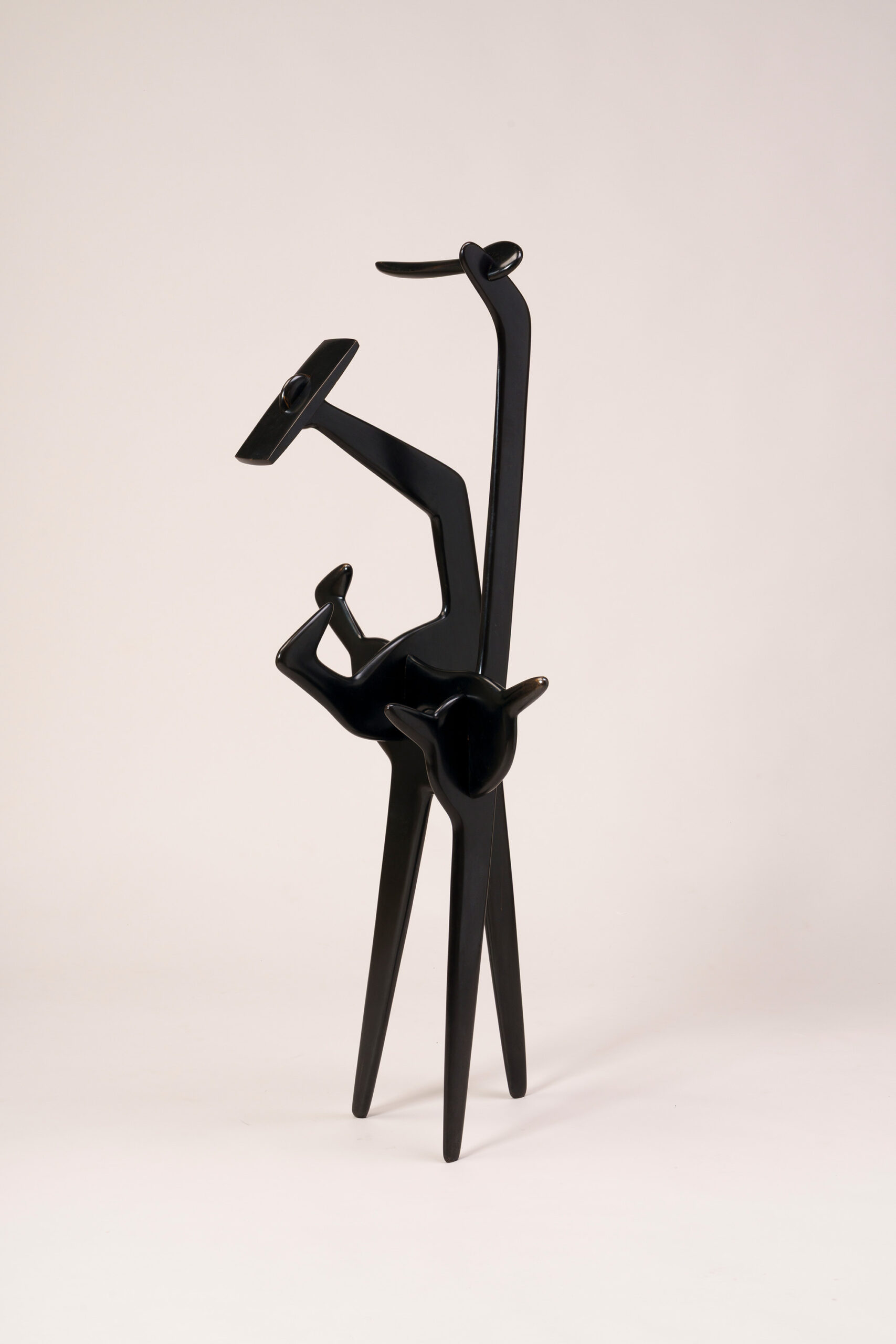 This sculpture depicts a bird with elongated legs. Upon closer inspection, it reveals an uncanny form with three legs and two heads. This enigmatic appearance activates the viewer’s imagination. The work is formed from thin, plate-like components assembled into a complex structure. While the original model was made by cutting and assembling slate, this version was produced by casting each component and assembling them in bronze. The method of cutting flat planes and joining them together echoes the principles of traditional Japanese wooden joinery.