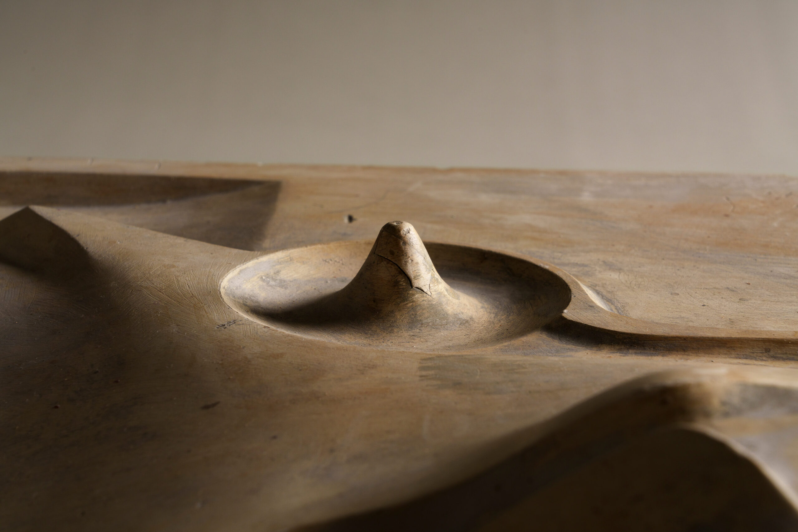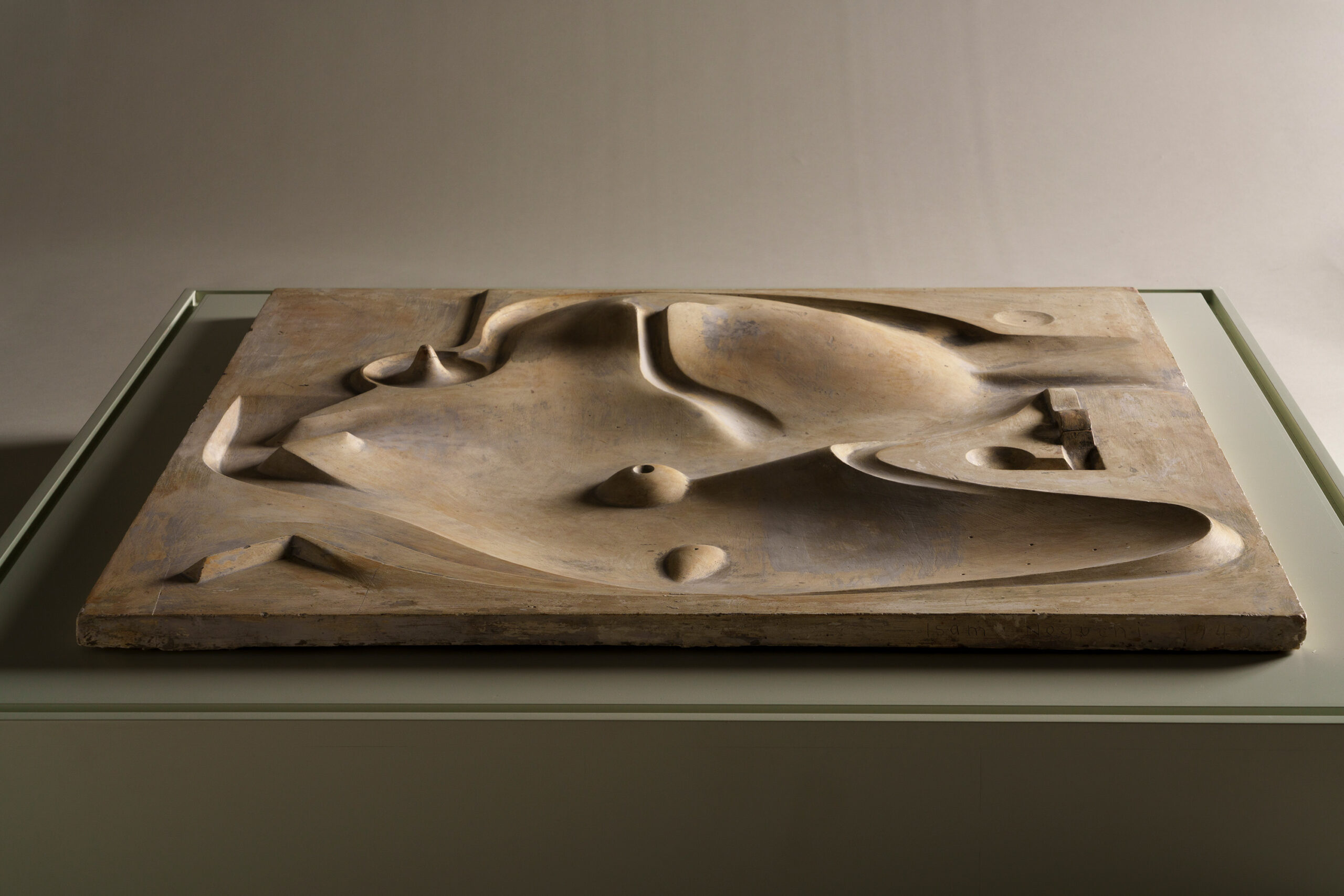 This work appears as an abstract sculpture composed of softly contoured forms. Viewed from above, however, it reveals gentle hill-like rises, basin-shaped depressions reminiscent of man-made ponds, and bridge-like elements, evoking aspects of a Japanese garden. The piece is a model for an unrealized park that the artist conceived for Central Park in New York. Noguchi’s practice extended beyond sculpture to encompass the creation of landscapes that bridged art and society. Isamu Noguchi, one of the foremost sculptors of the twentieth century, was born in the United States to Japanese poet Noguchi Yonejirō and American writer Léonie Gilmour. In his later years, he established a studio in Mure-chō, Kagawa Prefecture (present-day Takamatsu City).