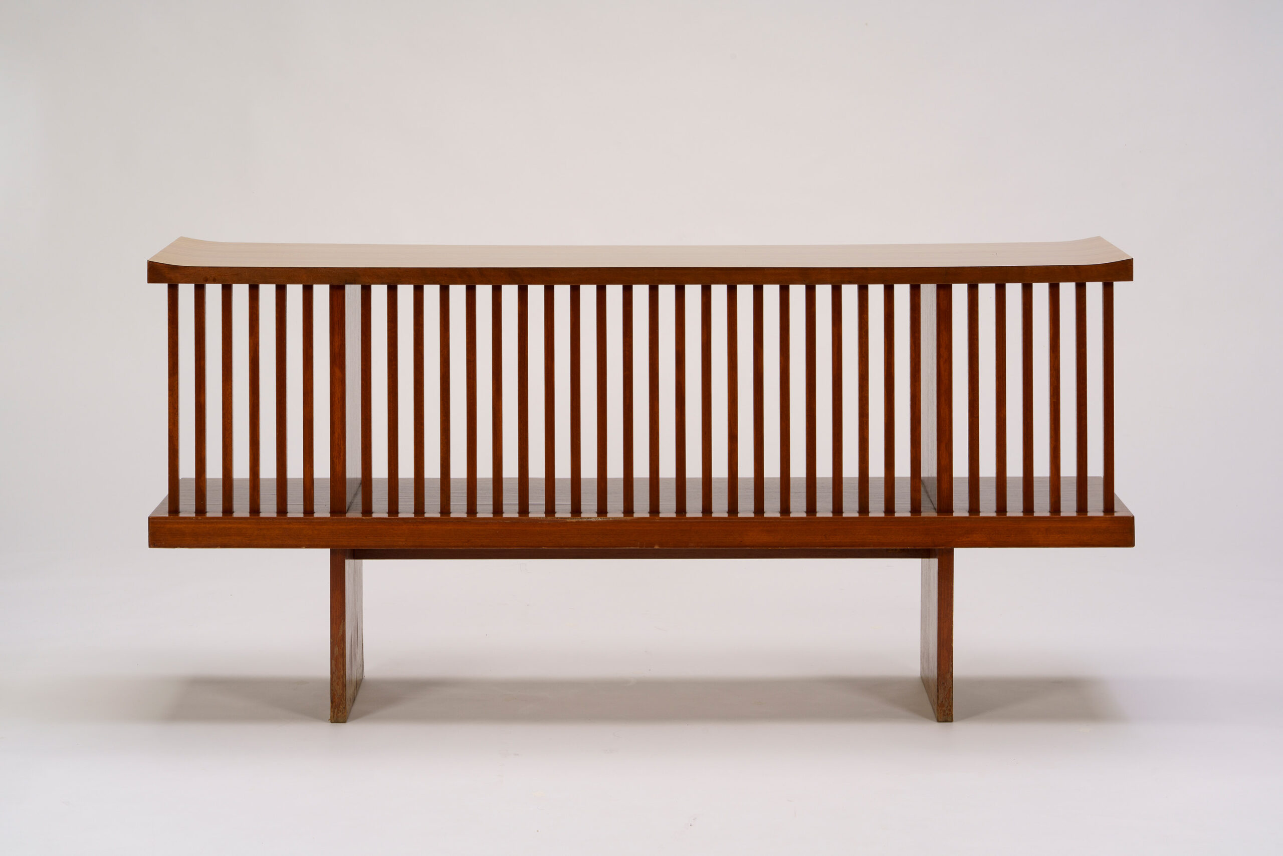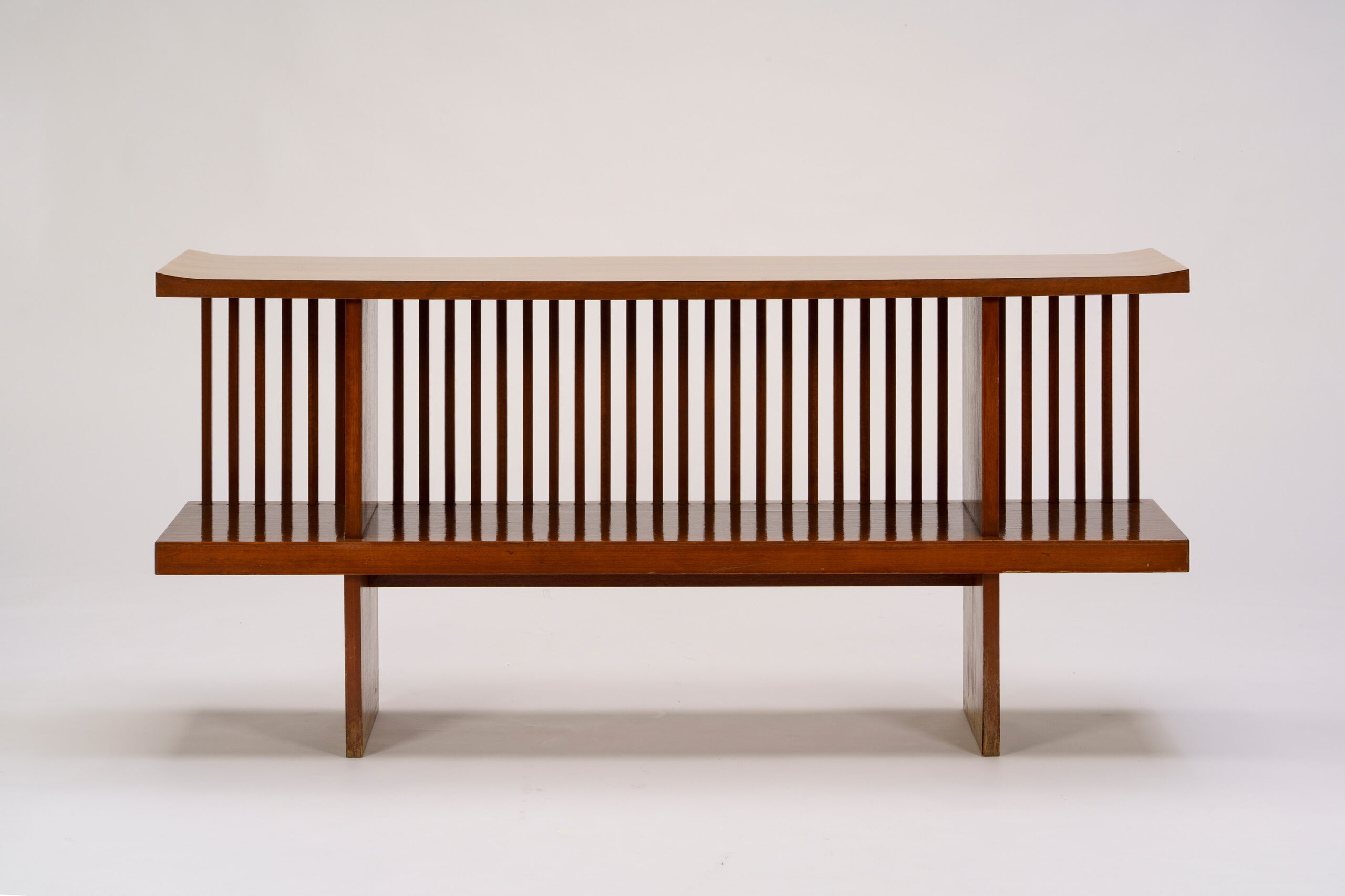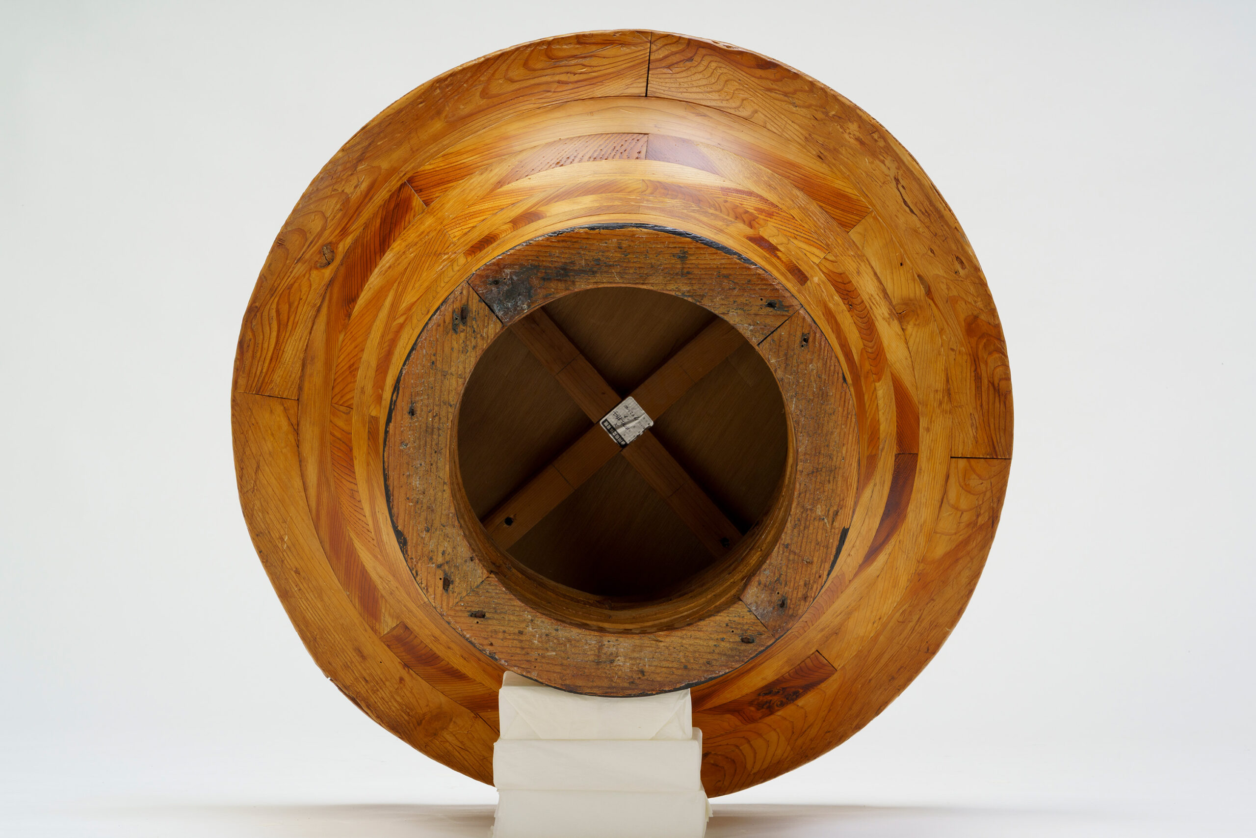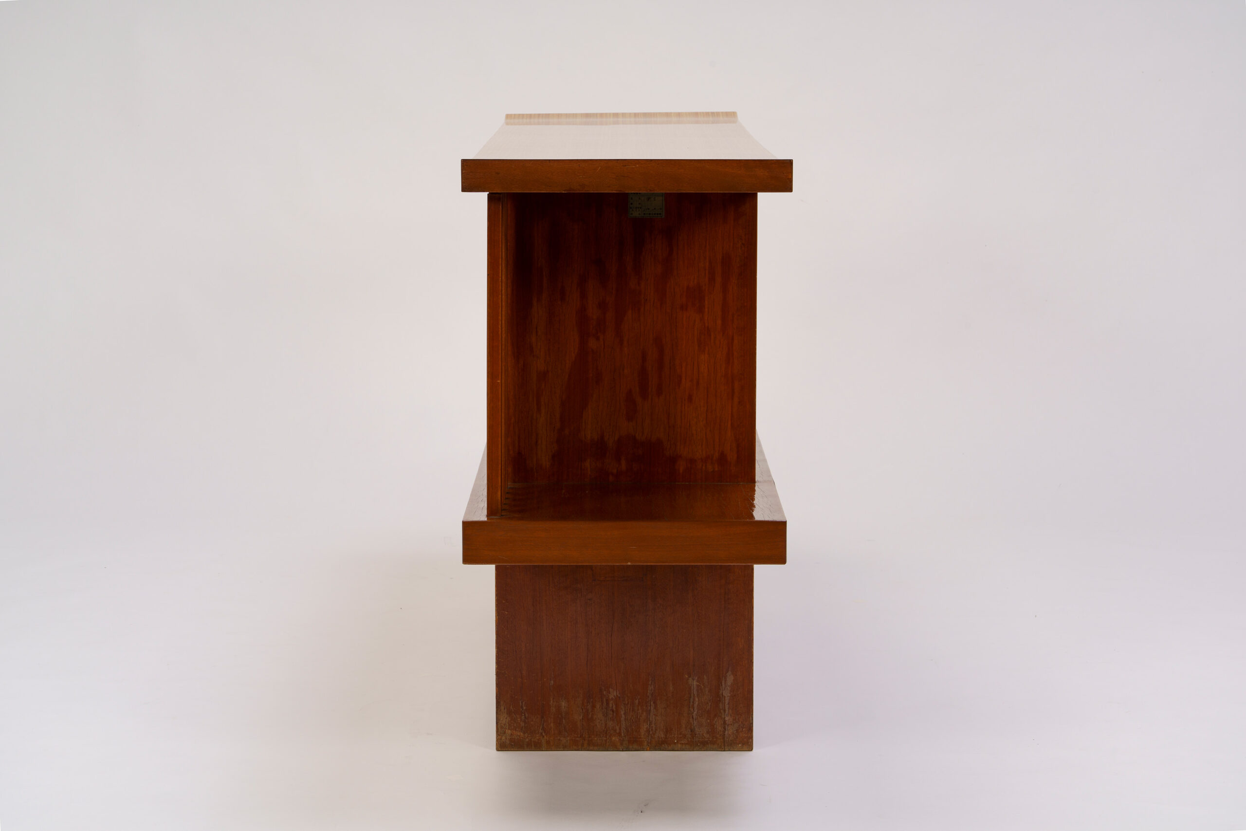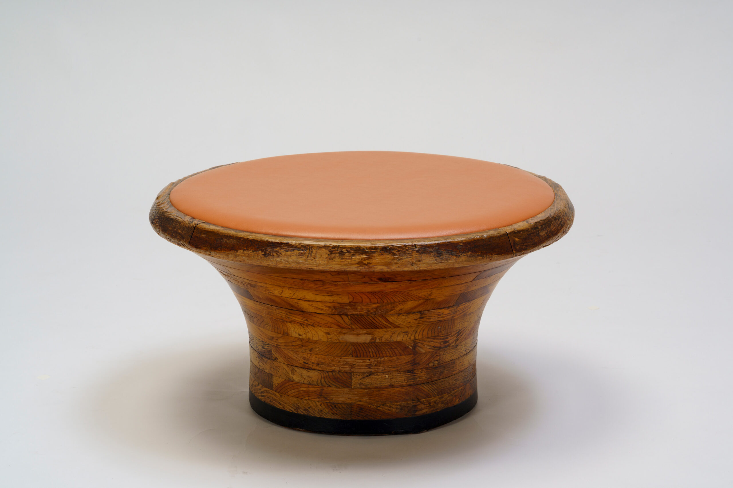 This table and set of chairs were used in the Kagawa Prefectural Gymnasium designed by architect Tange Kenzo (1913–2005) and completed in 1964. Bent laminated wood is formed into circular shapes and stacked. When viewed from the side, their profile opens upward like a morning glory or a trumpet. The table and chairs share a form and dimensions. The tabletop is finished with a white plastic panel, while the chair seats are upholstered in black, red, and orange vinyl. Arranged in various configurations, the visual expression of the furniture changes within the space. The table and chairs were designed by Kenmochi Isamu, who had earlier designed the governor’s office furniture for the Kagawa Prefectural Office Former Main Building and East Wing, which was completed in 1958.