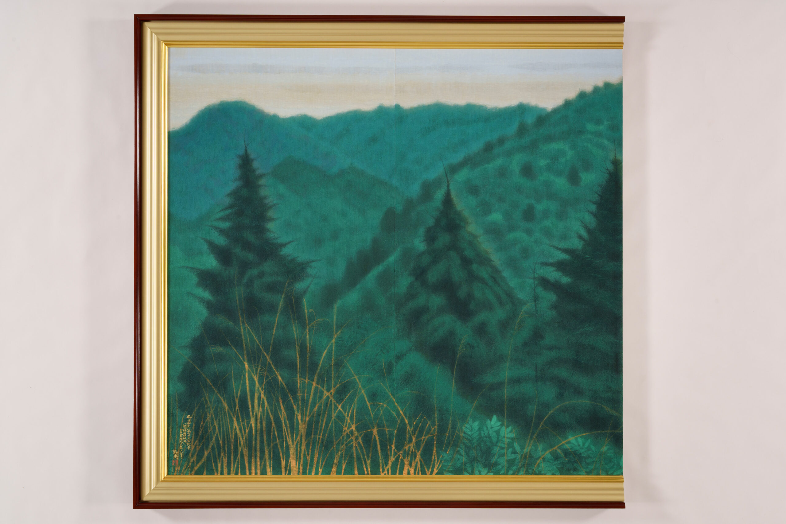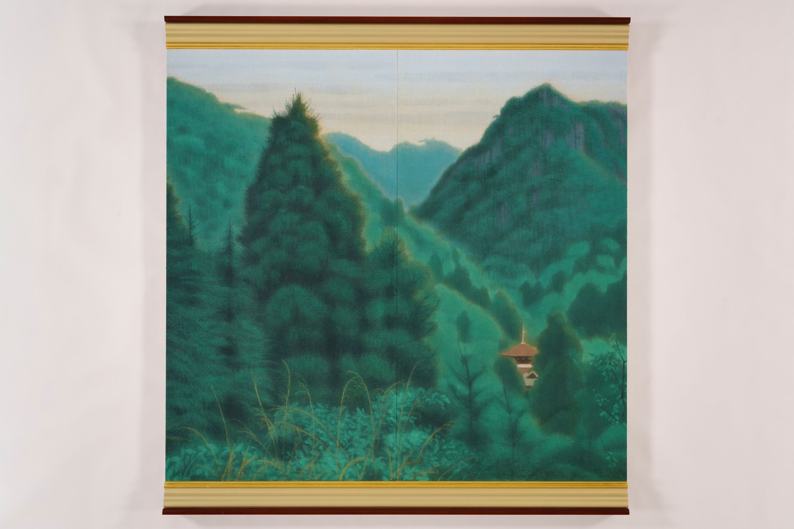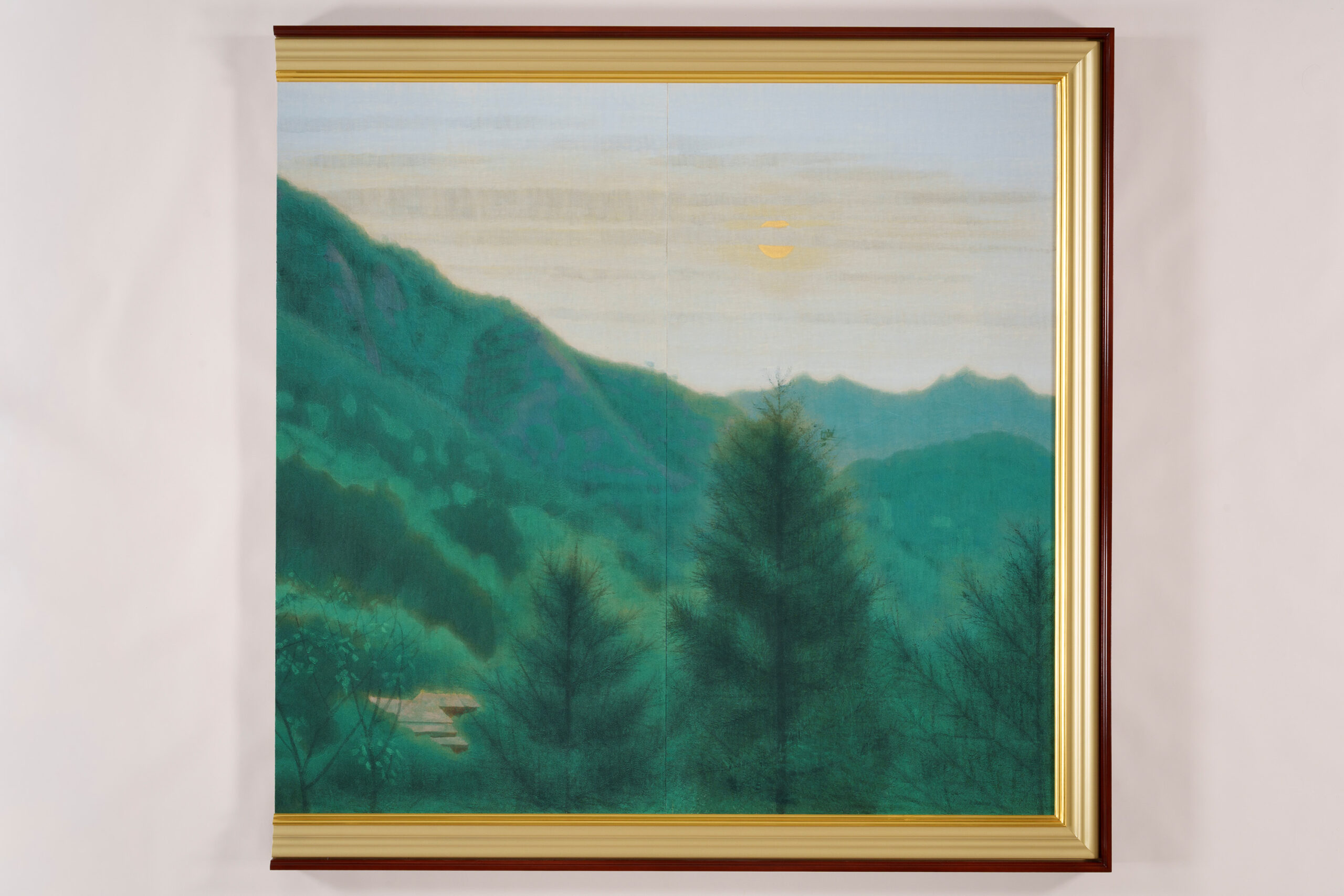 Soft light from the rising sun glows through a haze draped over the mountain ridges, gently illuminating Ōkuboji Temple and its surrounding landscape. Located in Sanuki City, Kagawa Prefecture, Ōkuboji Temple stands against the backdrop of Mt. Yahazu (788 m) and Mt. Nyotai (761 m) and serves as the final stop of the Shikoku pilgrimage, a circuit of eighty-eight sacred sites. Between 1992 and 1994, Hirayama visited Kagawa Prefecture on four occasions, producing numerous sketches. After refining the composition and color palette through a series of preparatory drawings, both small and large, he undertook the final painting and completed the work over a period of three years. Among the more than thirty works created through field research conducted throughout Kagawa Prefecture at that time, this painting stands as one of the masterpieces representative of the artist. It was exhibited at the 79th Inten Exhibition of the Japan Art Institute. Born in Setoda-chō (present-day Onomichi City) in Hiroshima Prefecture, Hirayama graduated in 1952 from the Japanese Painting Department of the Tokyo Fine Arts School (now Tokyo University of the Arts). He later produced many works exploring the origins of Japanese culture and Buddhism.