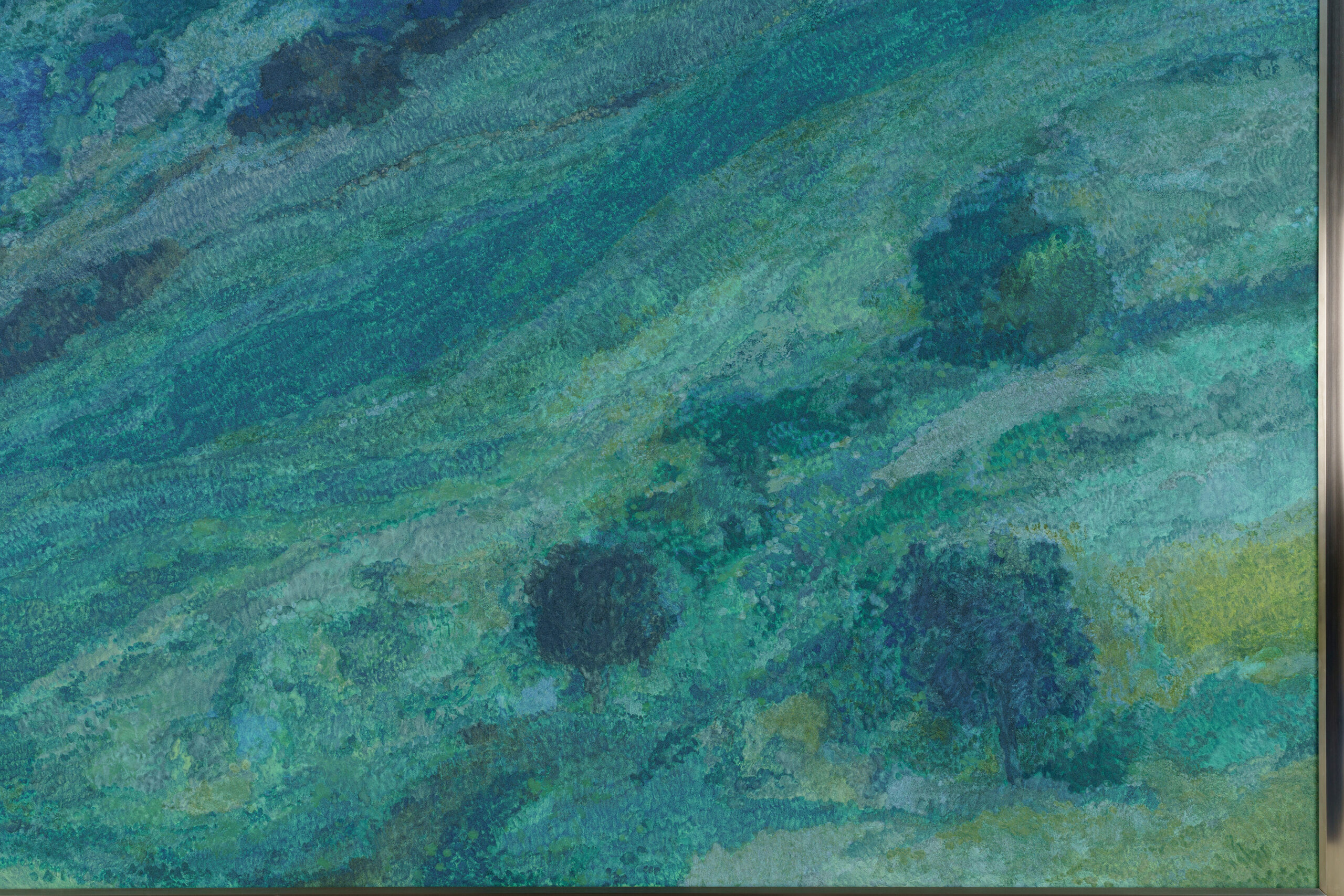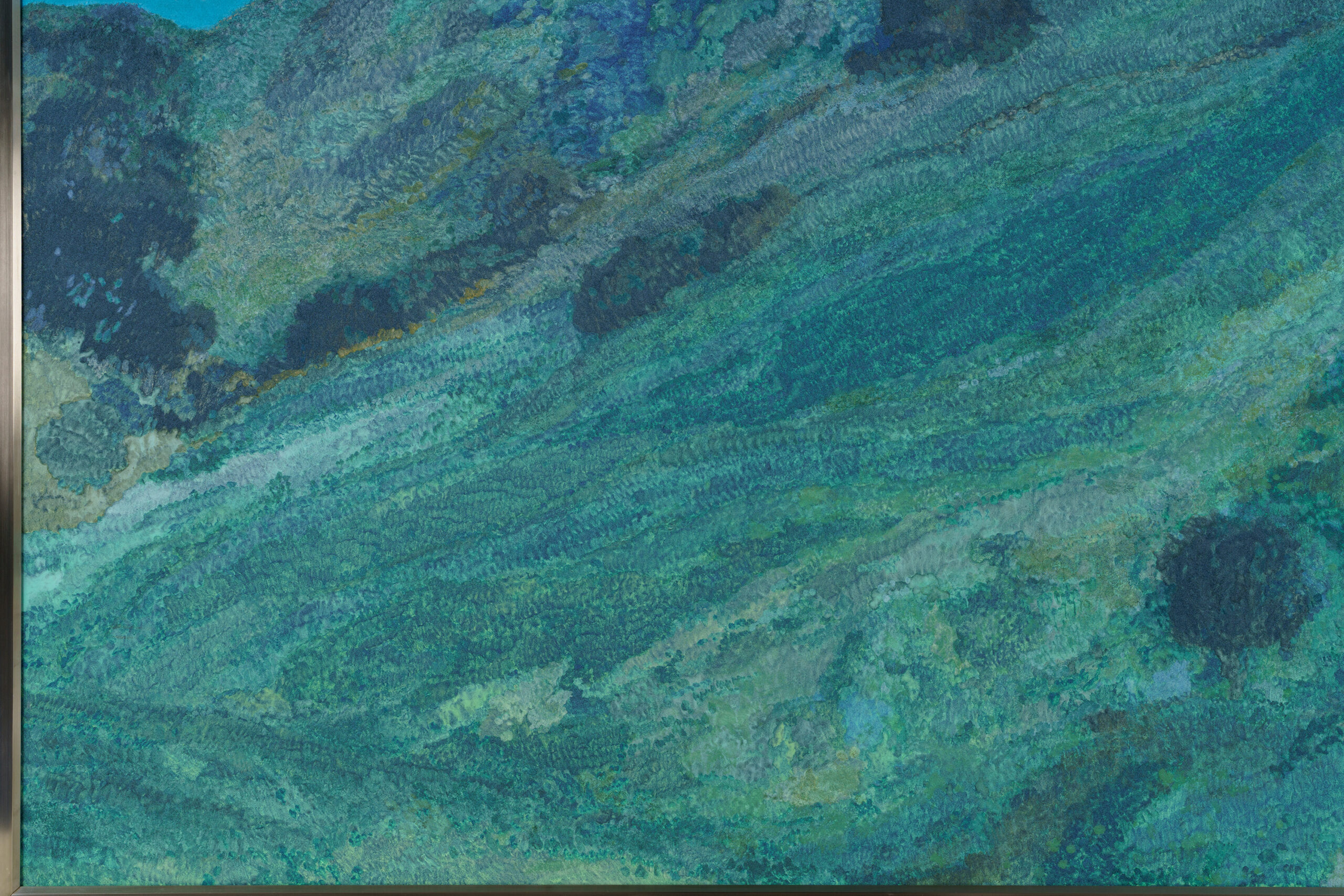 An old castle appears on the crest of a hill. When one looks upward, their gaze falls upon a deep blue sky. The upward-looking composition and the horizontally flowing brushwork evoke a palpable feeling of the wind moving through the scene. Once a place of human activity, the castle has now dissolved into the surrounding landscape, becoming a part of nature. The artist sought to capture the subtle presences that drift through everyday scenery—moments that are easily overlooked.