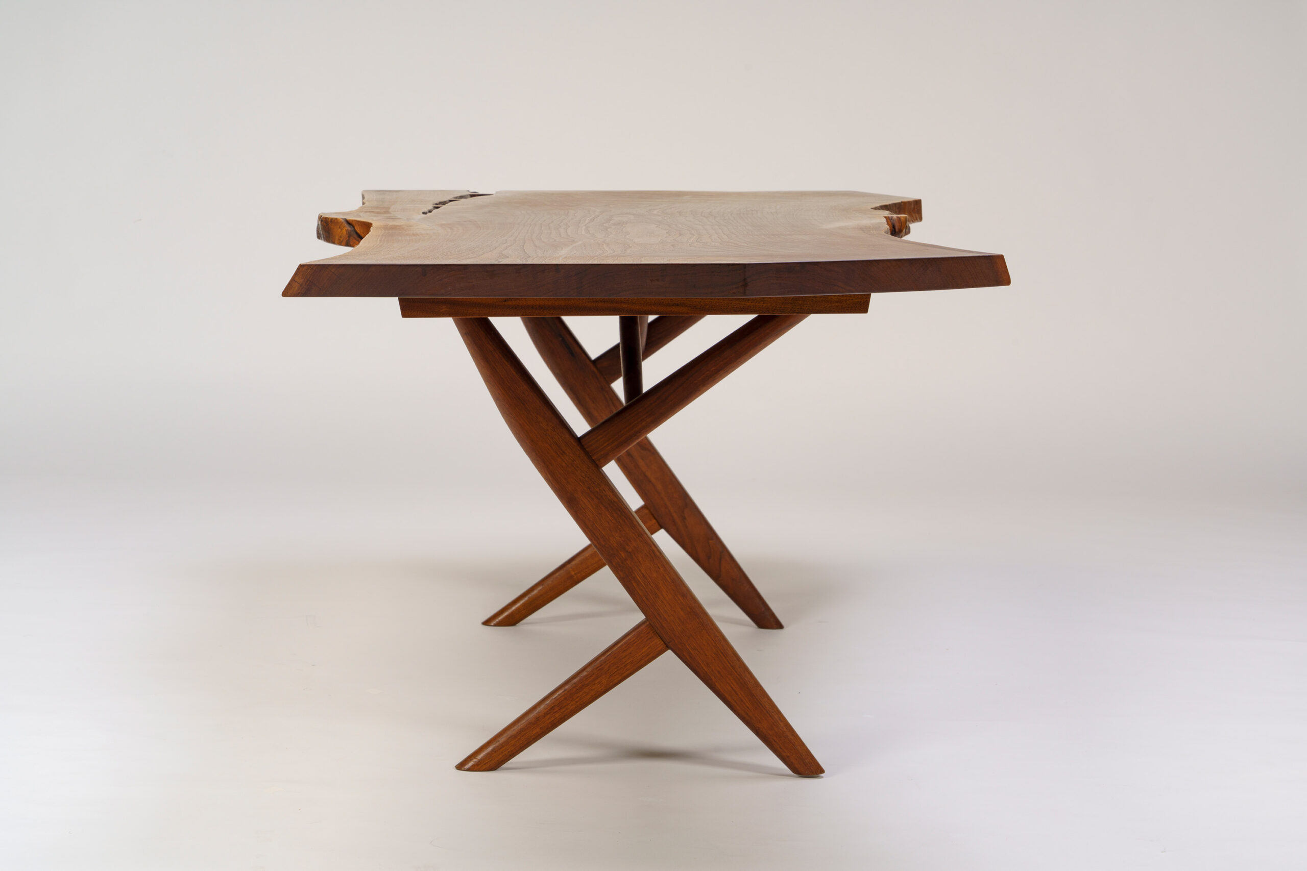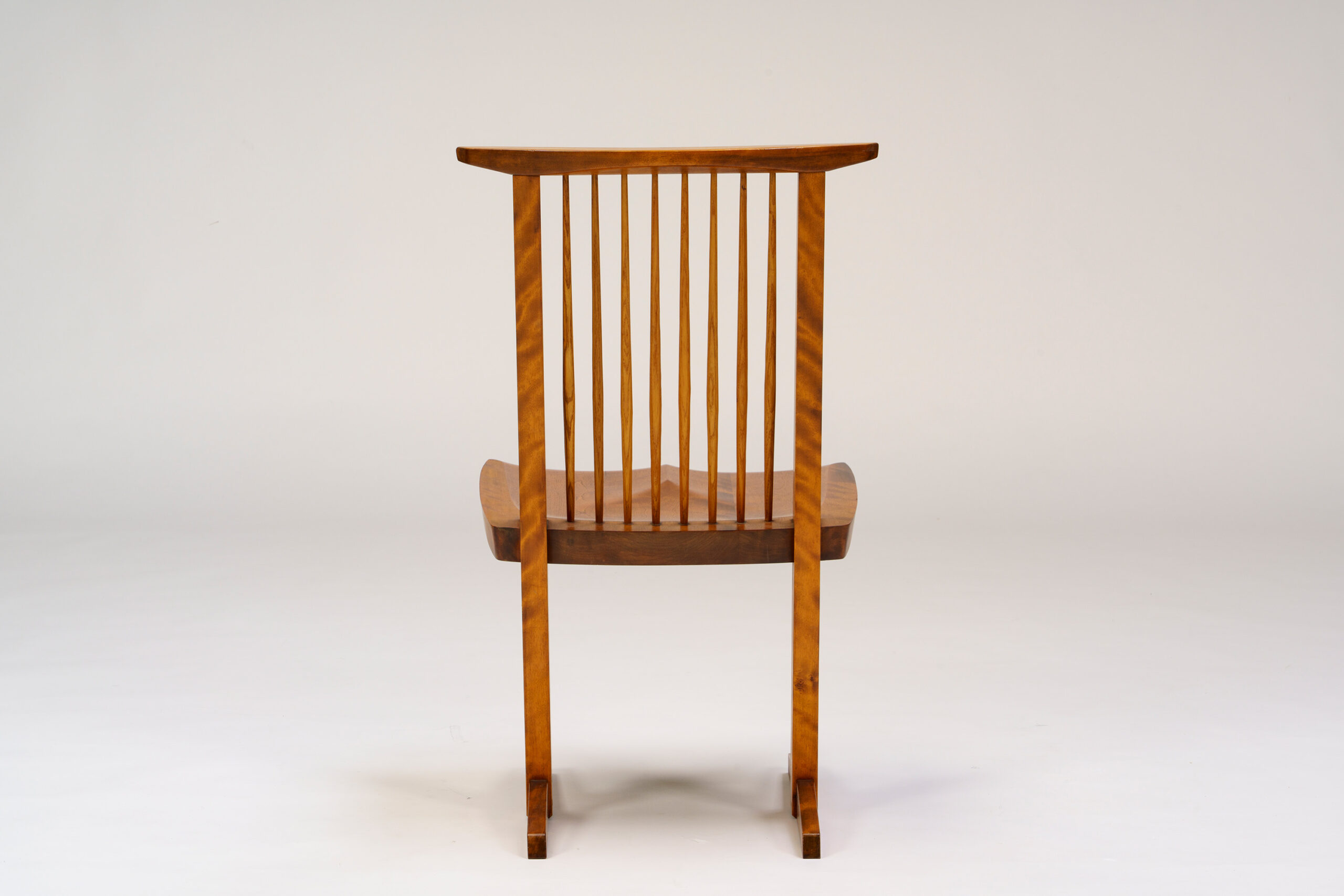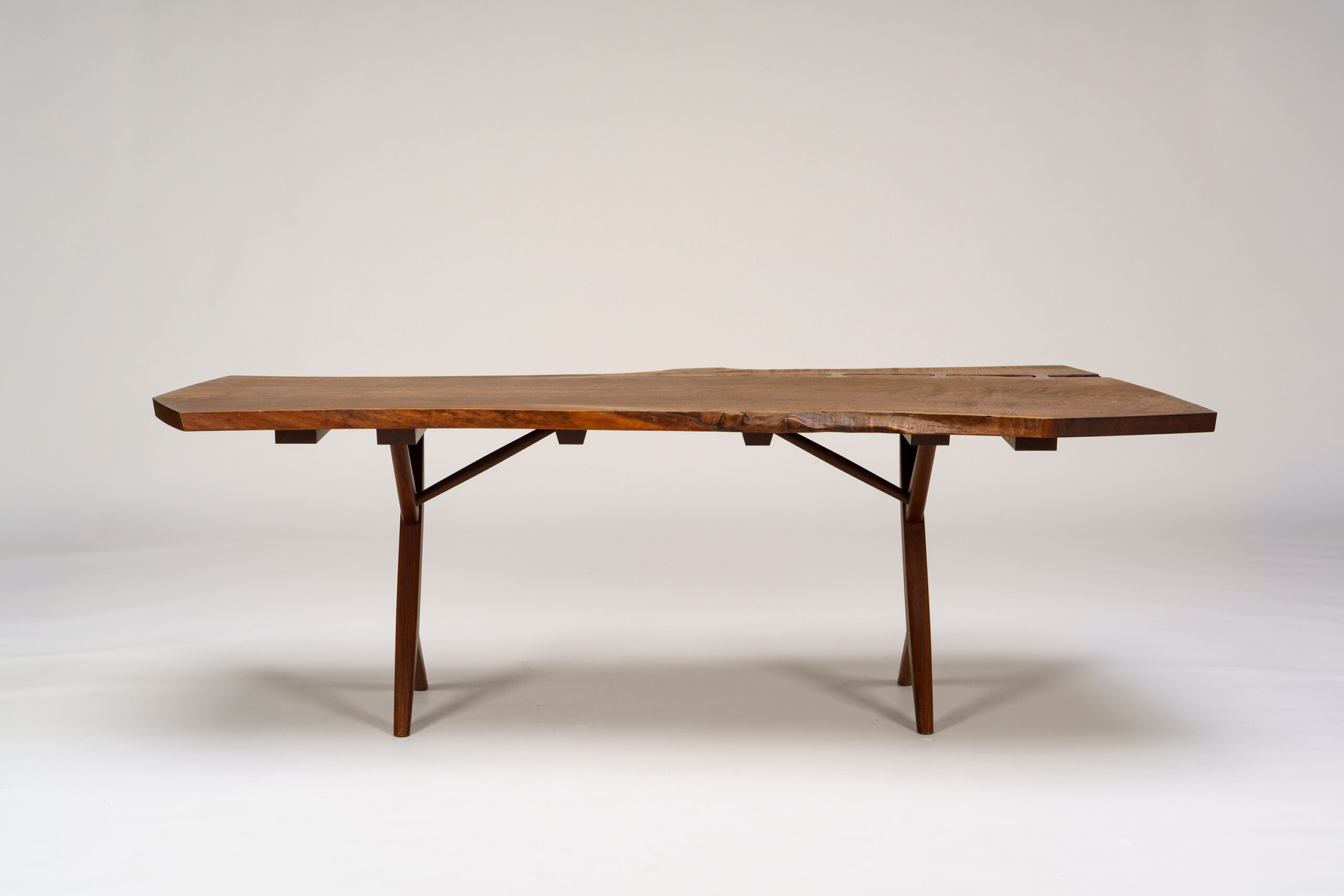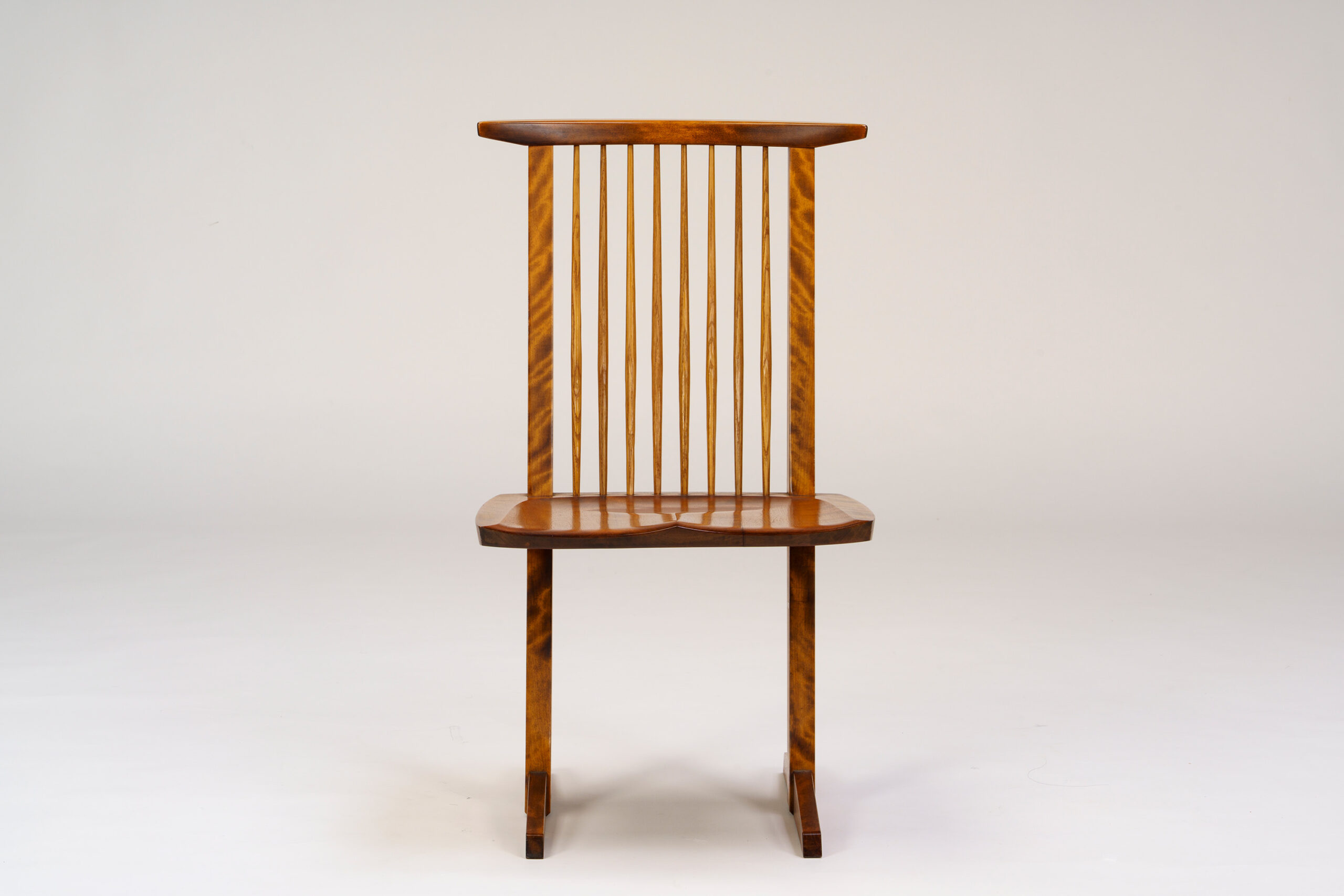 Crafted from American black walnut, the Cross-Leg Table employs a truss structure, an architectural system in which crossed members support weight, resulting in a form that conveys both the solidity of its thick tabletop and a refined, sharply articulated construction. The Conoid Chair, made of birch, is distinguished by the gentle curvature and flex of its backrest and by a leg structure supported solely by two side members. In both the table and the chairs, stability is achieved without placing legs at all four corners. This assured sense of balance reflects a design sensibility rooted in the artist’s background in architecture. In 1964, Nakashima came to Japan at the invitation of the sculptor Nagare Masayuki. During his time in Kagawa, he resonated with Sanuki Minguren, a group dedicated to reinterpreting traditional folk tools as refined contemporary forms, and became one of its members, forging a close connection with the region.