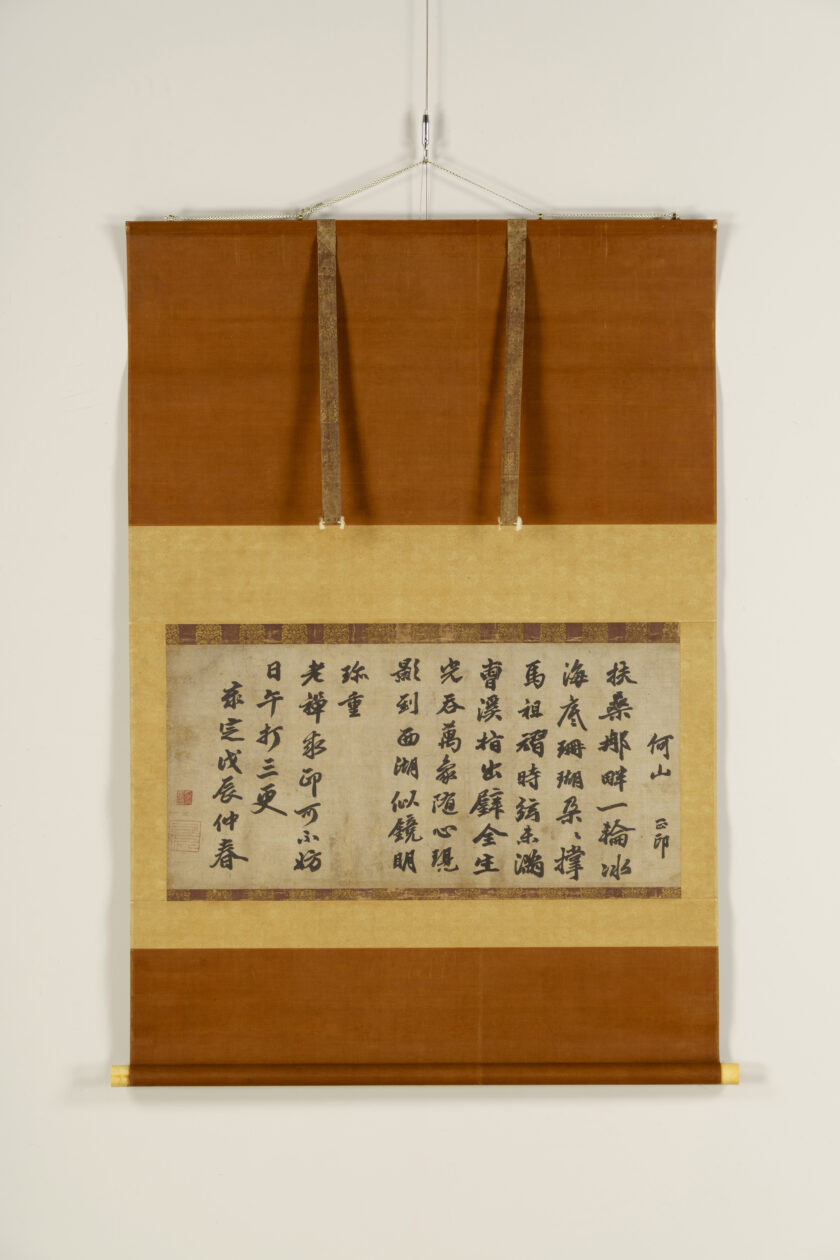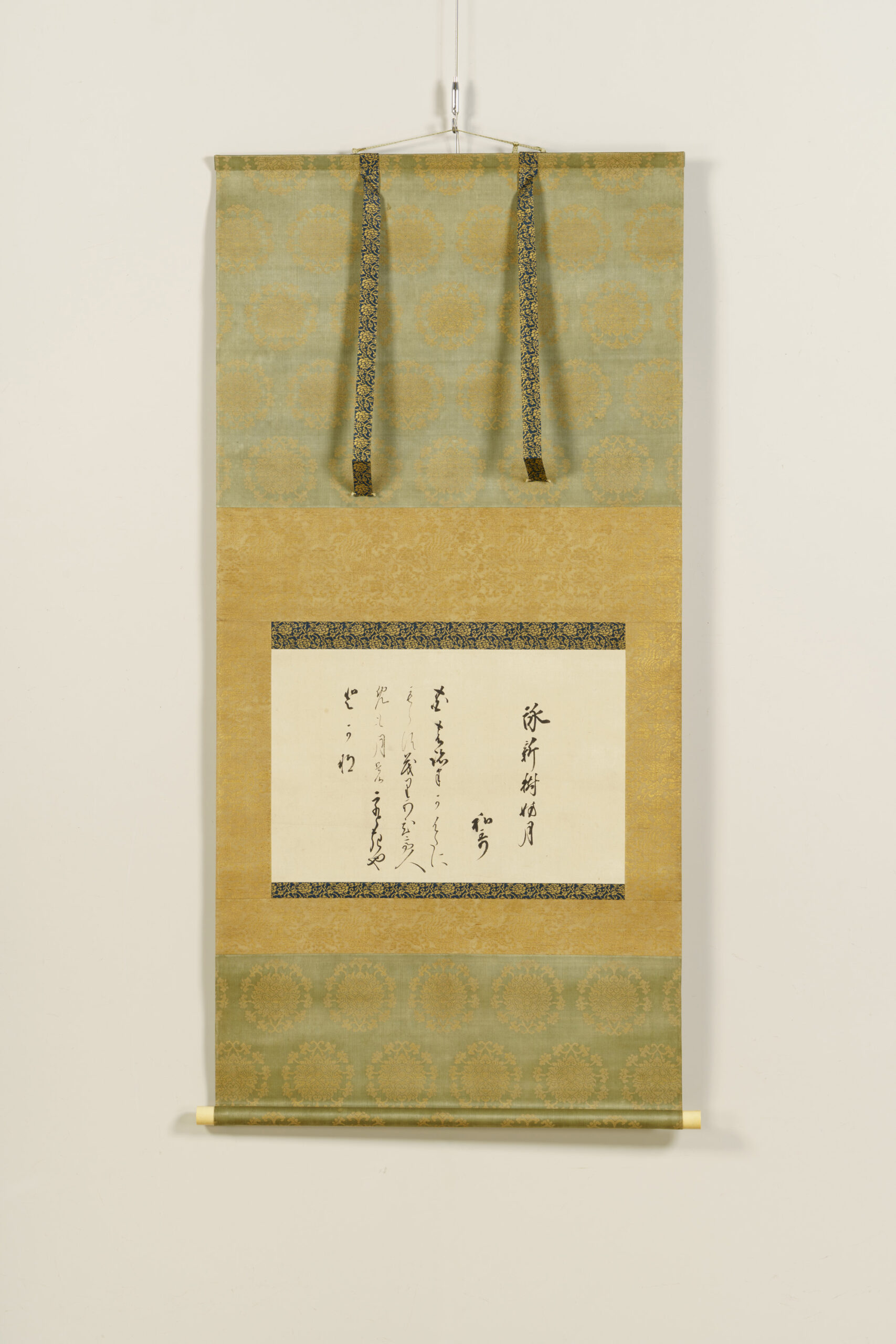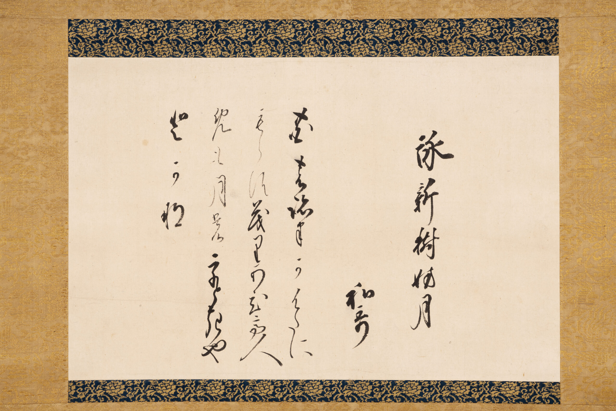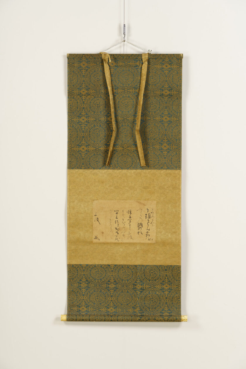 Shinkan refers to calligraphy personally written by an emperor. This work features a waka composed by Emperor Go-Sai on September 4, 1668 (Kanbun 8), on the theme of shinju tsuki o samatageru (young branches obscuring the moon), written by the emperor himself on kaishi, a sheet of paper carried in the front fold of a garment. Emperor Go-Sai ascended the throne following the sudden death of his elder brother, Emperor Go-Kōmyō, and served an interim sovereign until the accession of Emperor Reigen. Because his accession was unexpected, he received rigorous instruction in waka and other courtly studies from his father, retired Emperor Go-Mizunoo. In later years, he attained Kokin denju, the secret transmission of authoritative interpretations of the Kokin Wakashū (Collection of Ancient and Modern Japanese Poetry). This work was handed down within the Takamatsu Matsudaira family and is thought to have been bestowed in connection with the enthronement ceremony of Emperor Go-Sai in 1656 (Meireki 2), which Matsudaira Yorishige, the first head of the Takamatsu Matsudaira family, attended as the shogunate’s representative, as well as in light of his close relationship with the retired Emperor Go-Mizunoo.