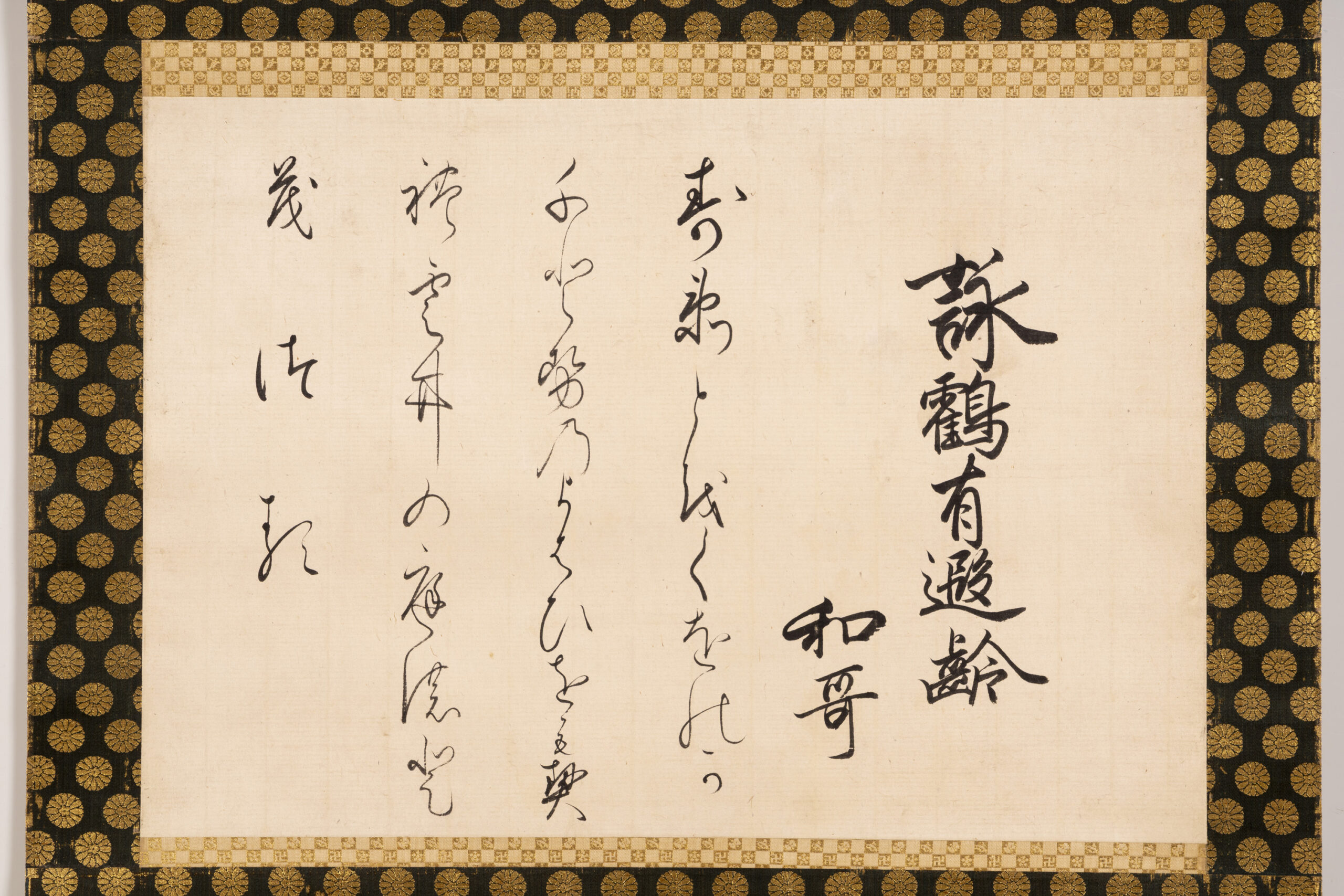 Shinkan refers to calligraphy personally written by an emperor. This work features a waka composed by Emperor Higashiyama at the Gokaihajime (the New Year’s imperial poetry gathering) held on March 7, 1709 (Hōei 6), transcribed on kaishi, a sheet of paper carried in the front fold of a garment, and handed down within the Takamatsu Matsudaira family. The poem was composed on the theme of tsuru ni karei ari (Cranes are said to enjoy long life) and expresses a wish for longevity. Emperor Higashiyama was the fourth son of Emperor Reigen. Upon his accession in 1687 (Jōkyō 4), the Daijōe, a rite in which a newly enthroned emperor offers newly harvested grain to the deities and partakes of it himself, was conducted for the first time in 230 years. During the reign of Emperor Higashiyama, closer cooperation between the imperial court and the shogunate brought the efforts to revive imperial court ceremonies that had lapsed during the medieval era (late 12th–16th centuries) that had been initiated under Emperor Go-Mizunoo to fruition.