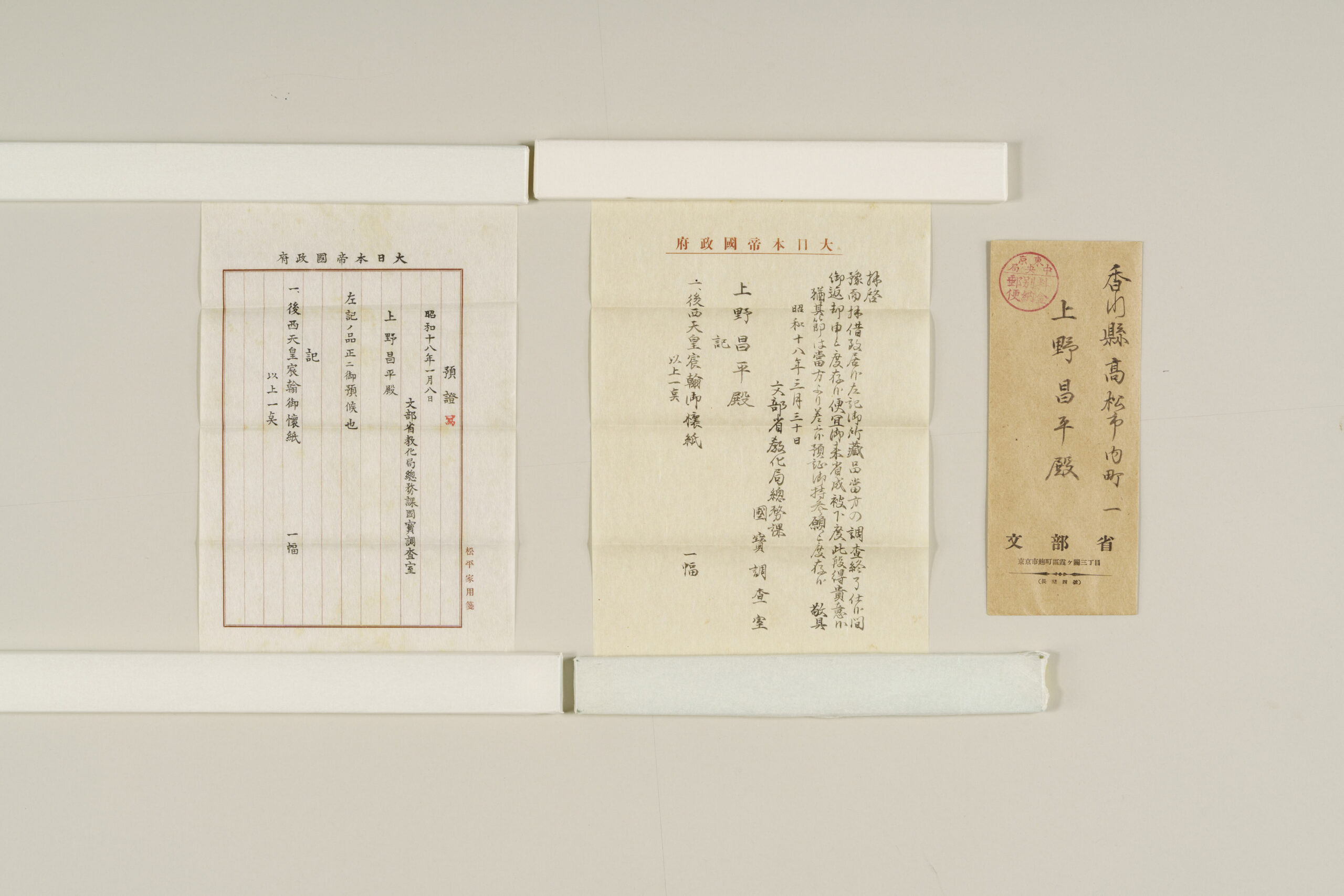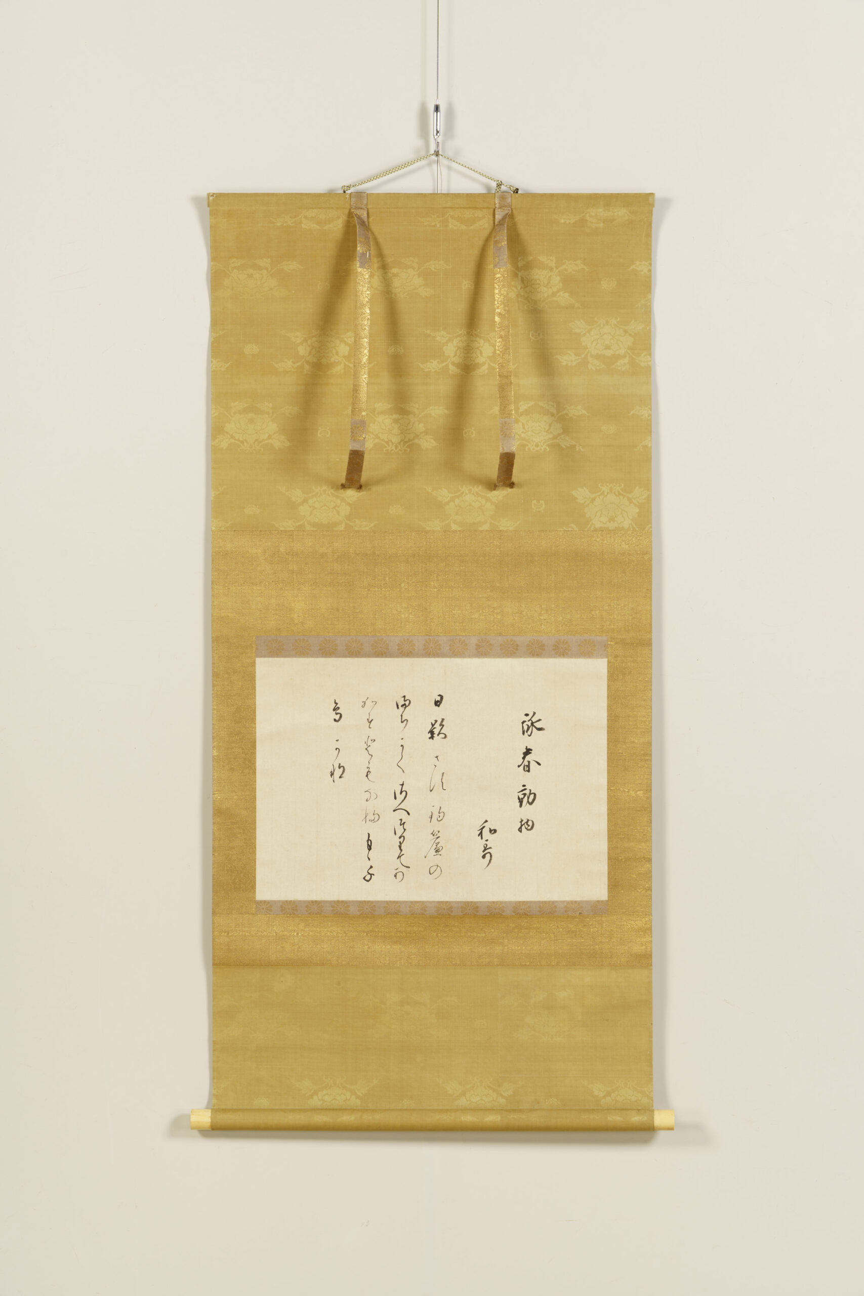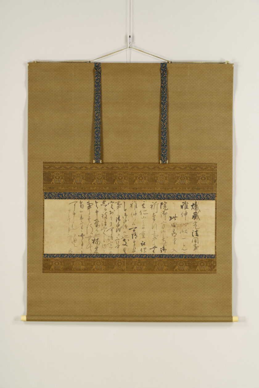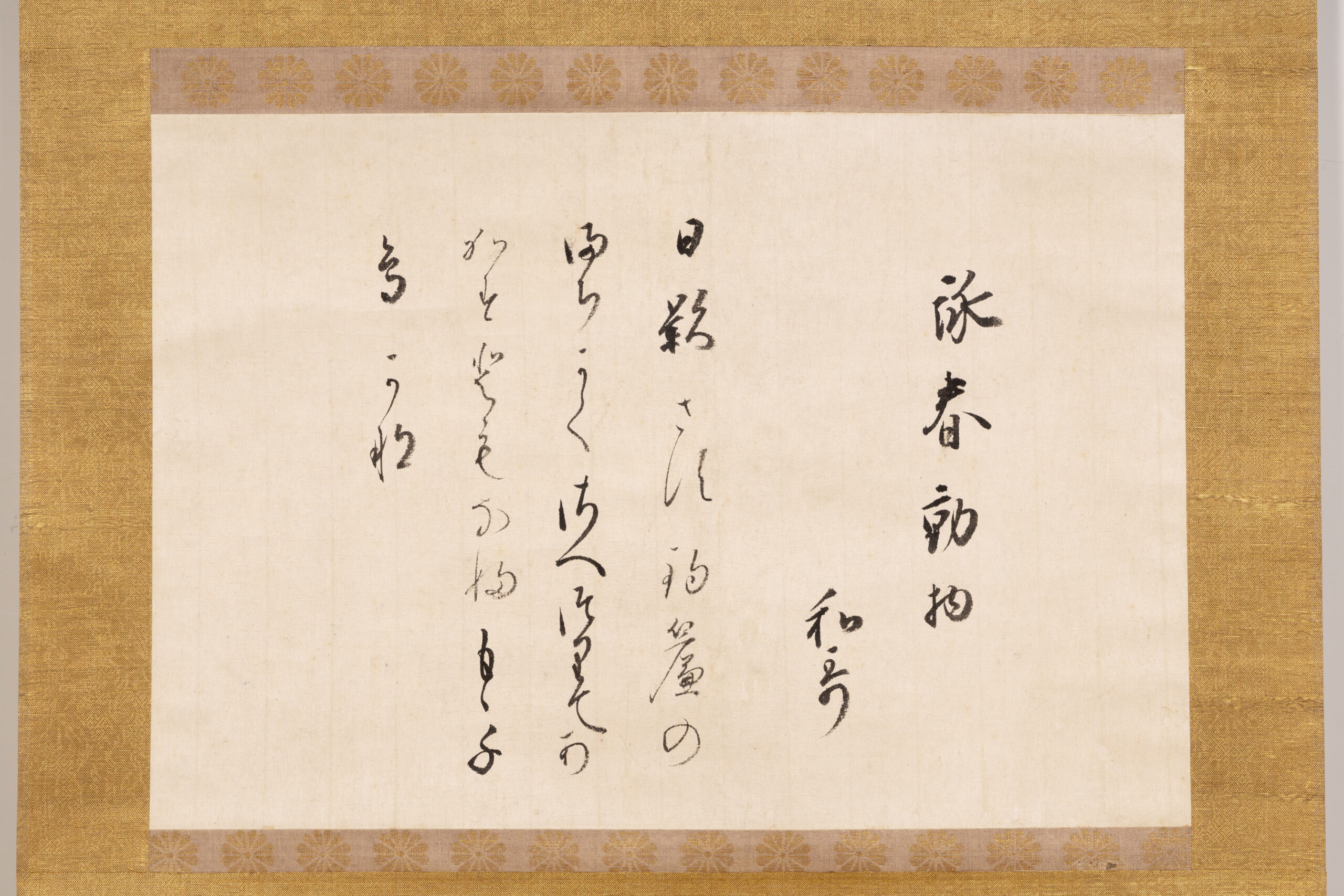 Shinkan refers to calligraphy personally written by an emperor. This work features a waka composed by Emperor Go-Sai under the theme of spring animals written by the emperor himself on kaishi, a sheet of paper carried in the front fold of a garment. The date of composition is unknown. Emperor Go-Sai, the seventh son of Emperor Go-Mizunoo, ascended the throne following the sudden death of his elder brother, Emperor Go-Kōmyō, and served as an interim sovereign until the accession of Emperor Reigen. This work was handed down within the Takamatsu Matsudaira family and is thought to have been bestowed in connection with the enthronement ceremony of Emperor Go-Sai in 1656 (Meireki 2), which Matsudaira Yorishige, the first head of the Takamatsu Matsudaira family, attended as the shogunate’s representative. It is one of several works that attest to the close ties between the imperial court and the Takamatsu Matsudaira family during this period.