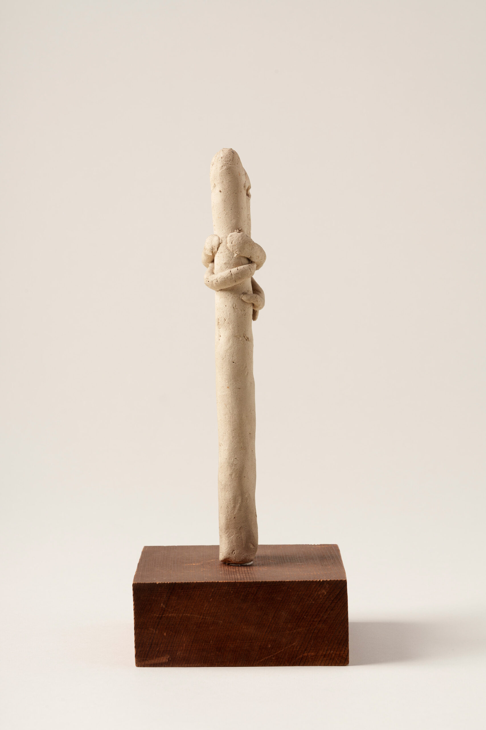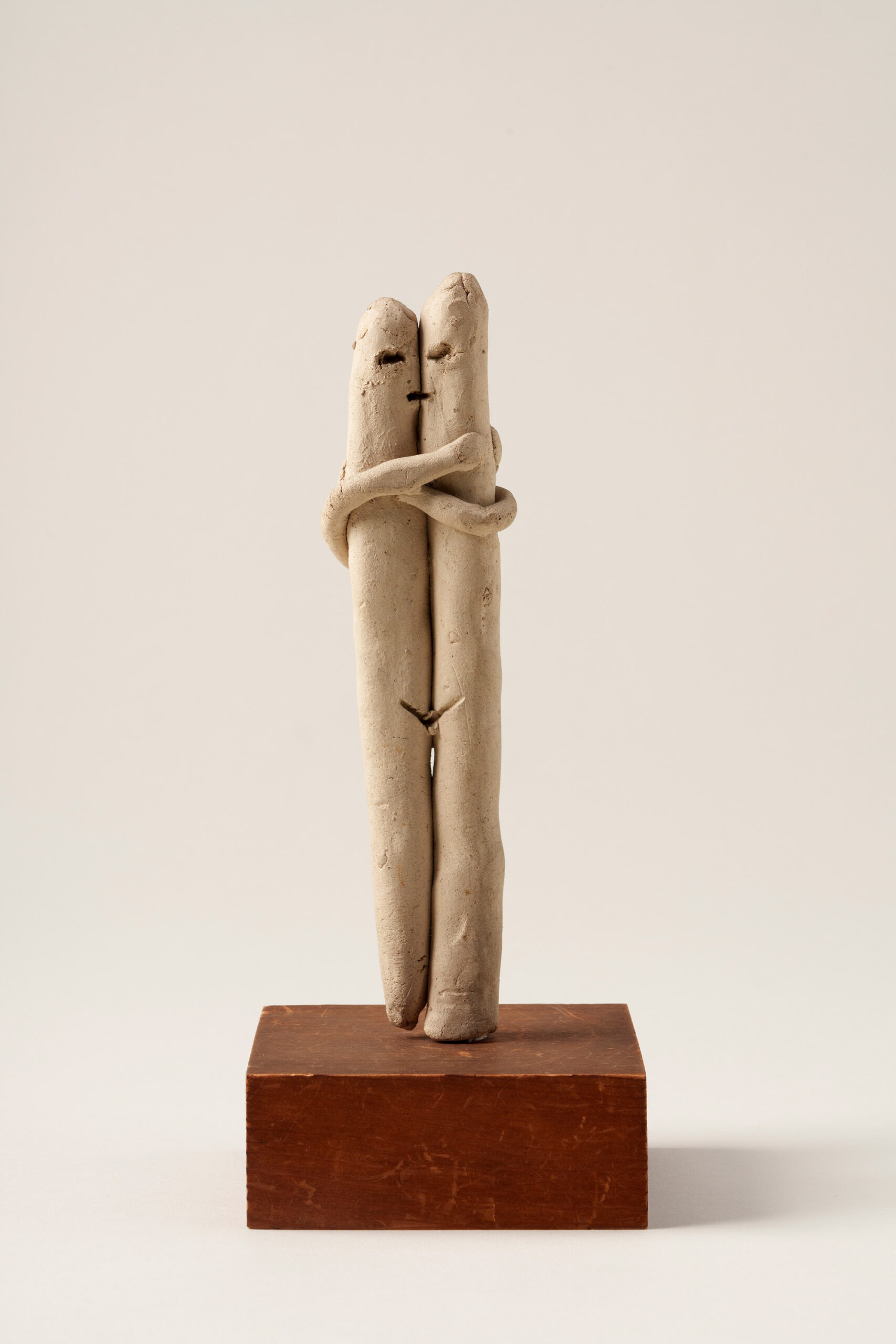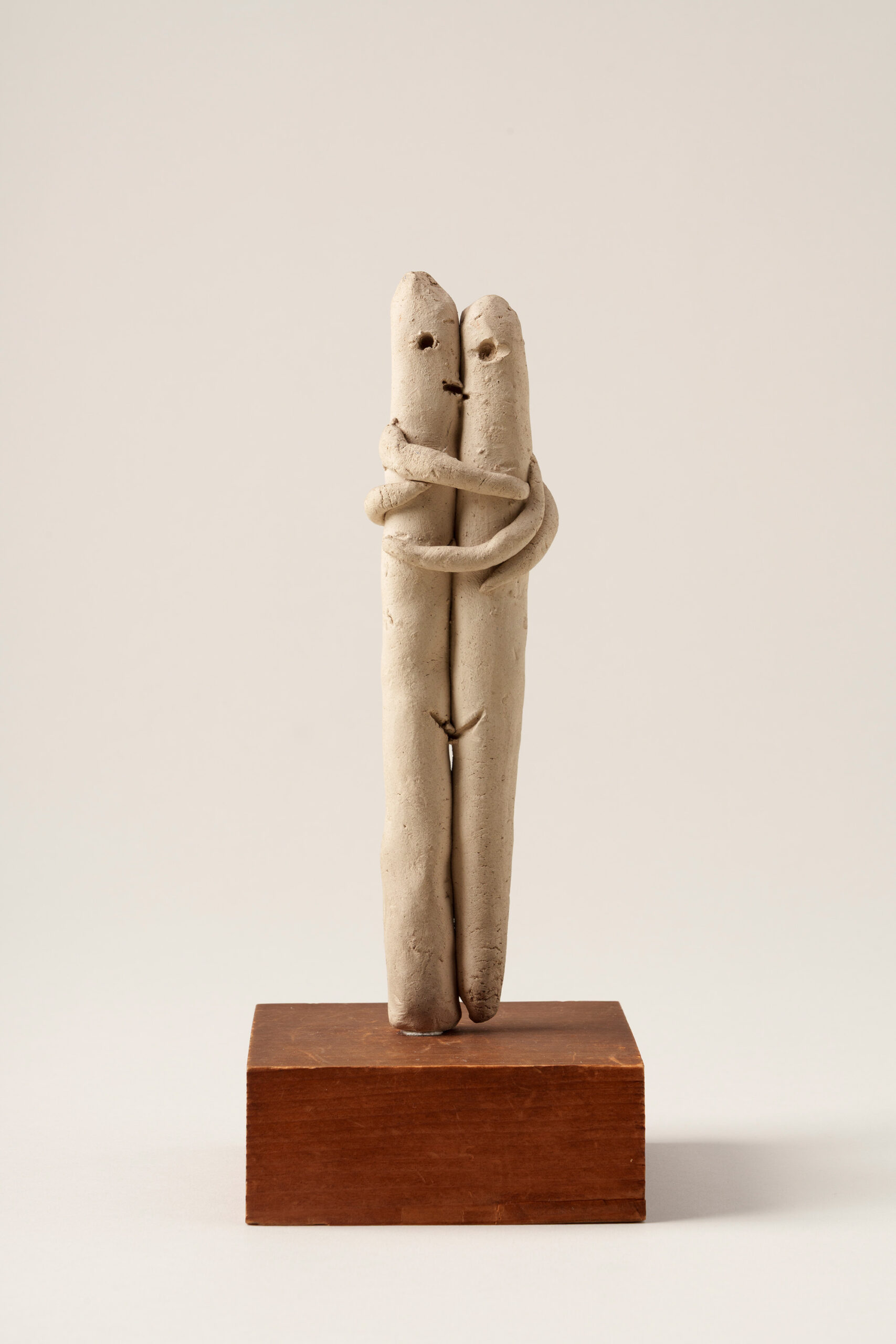 This sculpture was created by joining two vertically elongated, rod-like forms of clay side by side and firing them. Near the top, indentations evoke simplified eyes and a mouth; below, stylized arms curve gently as if to enfold one another. As the title Koibito (“Lovers”) indicates, the work portrays a pair of lovers locked in an intimate embrace.