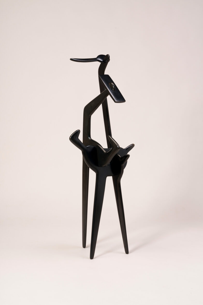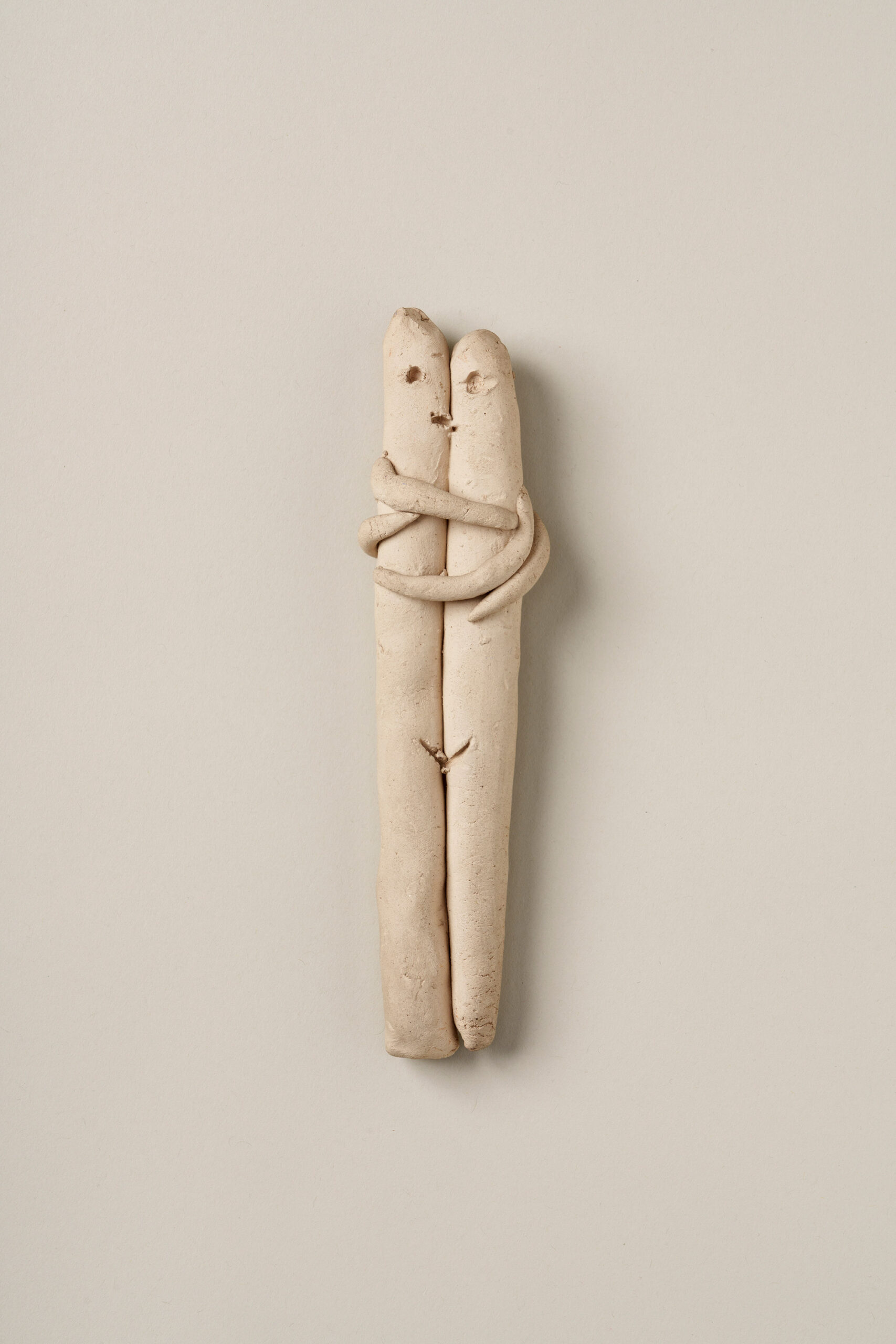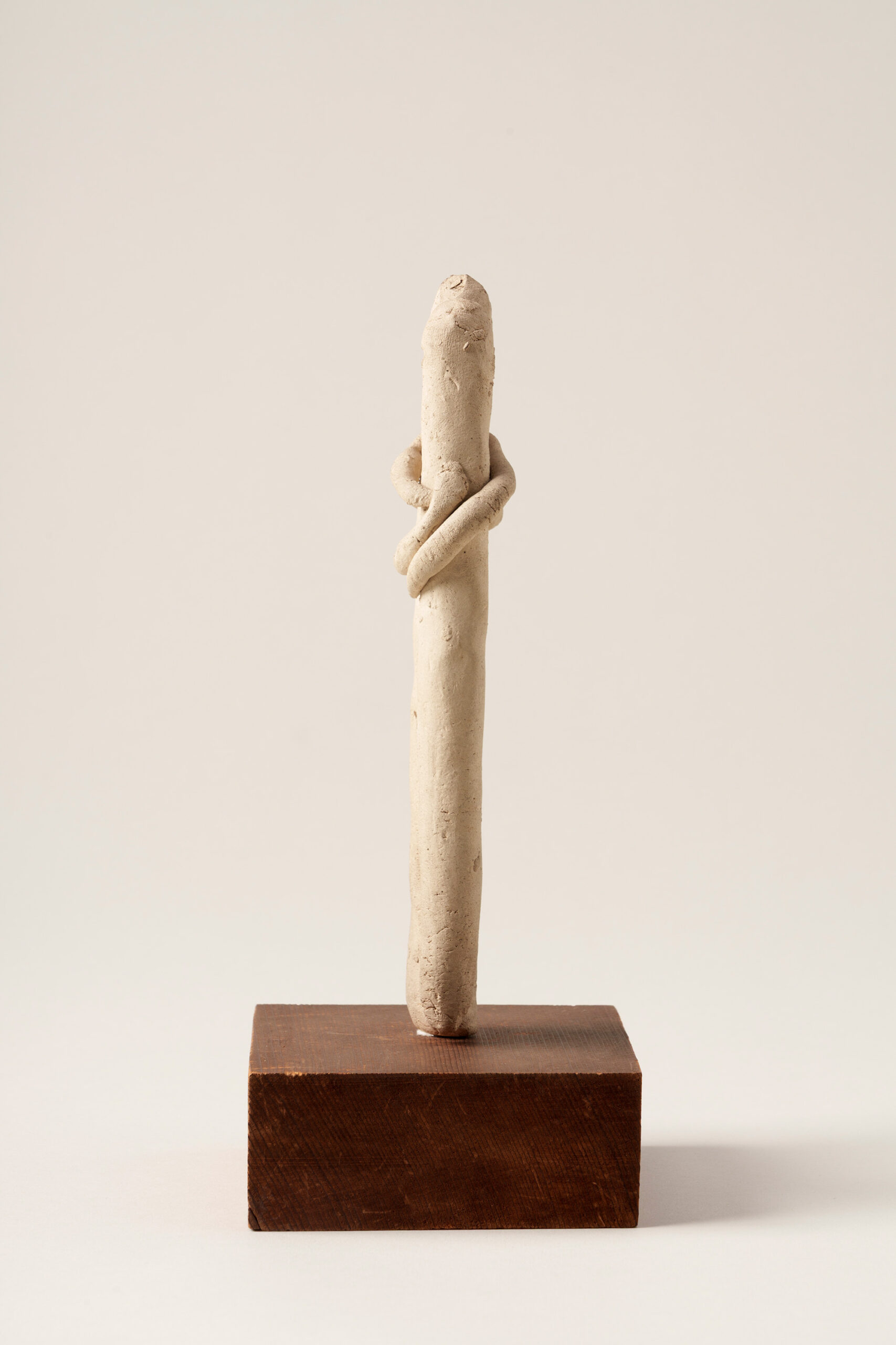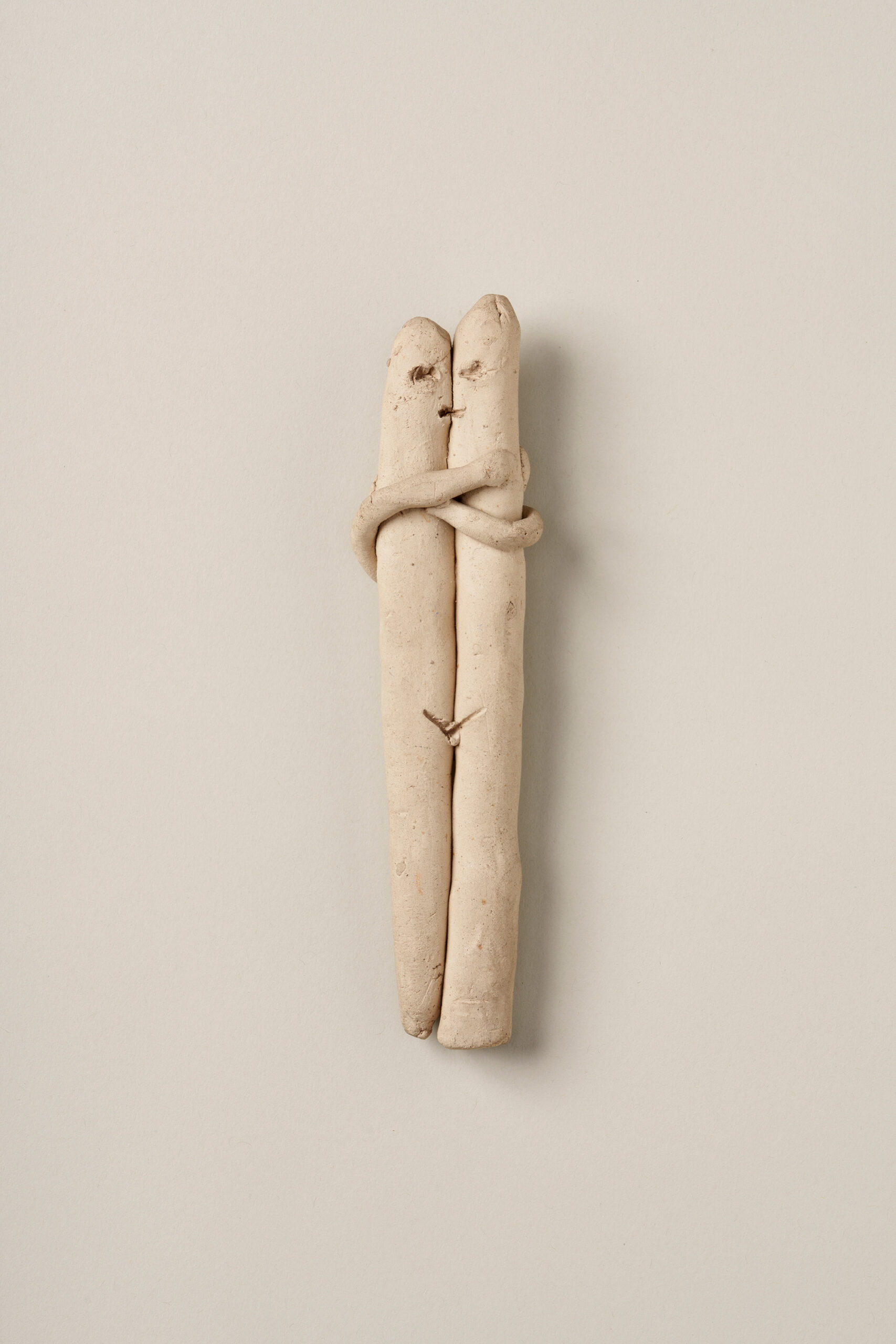 This sculpture was created by joining two vertically elongated, rod-like forms of clay side by side and firing them. Near the top, indentations evoke simplified eyes and a mouth; below, stylized arms curve gently as if to enfold one another. As the title Koibito (“Lovers”) indicates, the work portrays a pair of lovers locked in an intimate embrace.