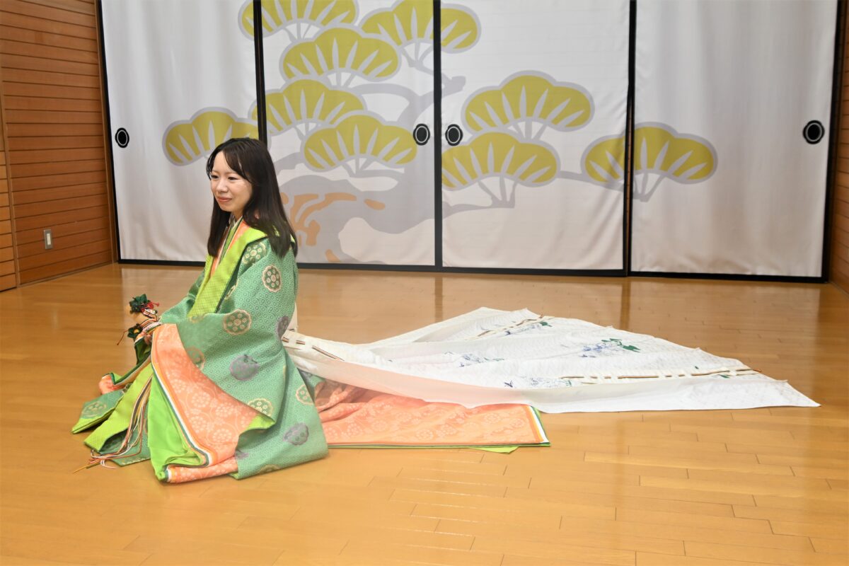 体験学習室では、十二単(じゅうにひとえ)や甲冑(かっちゅう)の着付け体験ができます。