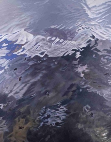 さざ波を立てる水面に空が写っている。しかし、作者はそれだけを描きたかったのではなさそうだ。水面には数匹の小さな虫が描かれ、まるでゼリーの上でバランスをとっているかのように波間に漂っているのが見える。動きのリアリティを感じる作品である。