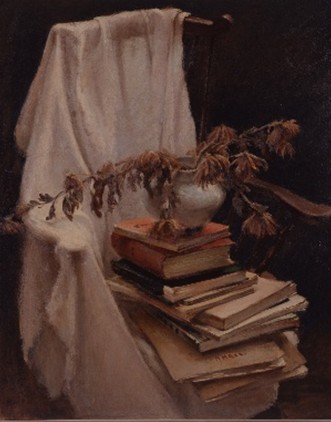 ウッドチェアに薄い白布をかけ、本や雑誌、花瓶、一枝の植物を積み、描いた静物画。白布のまとわりや透け感から見いだされるイスの形、雑誌の柔らかさ、分厚い本の固さ、硬質の陶器と枯れ始めた植物とあらゆるものの質感をとらえようと描かれている。