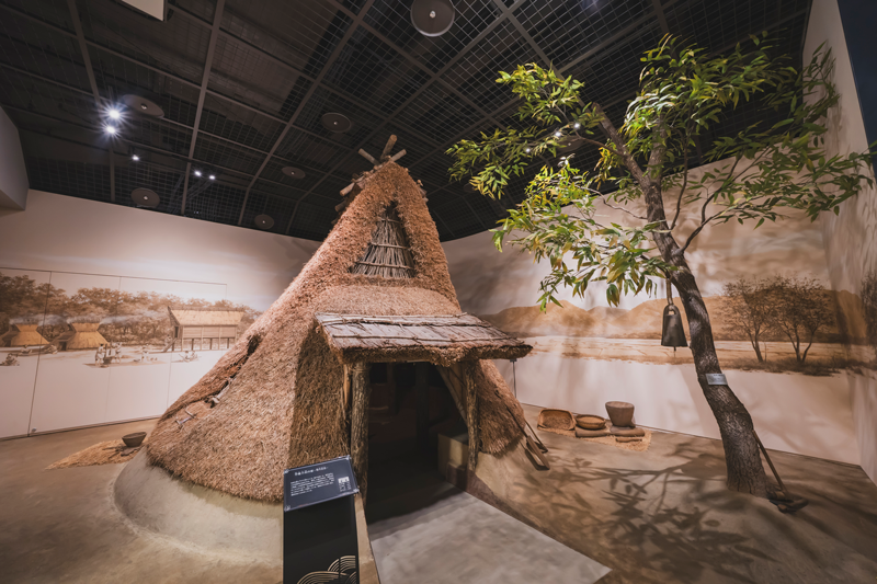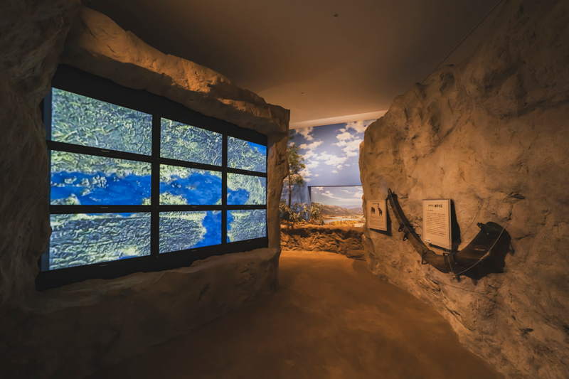 約2万年前の旧石器時代から約1700年前の弥生時代までをたどります。縄文時代の森は、香川県善通寺市の遺跡から発掘された植物の化石から、当時の樹木を再現しています。漁網にかかり発見された国内最大級のナウマン像の牙の化石や、香川県で出土した土器や石器なども展示しています。