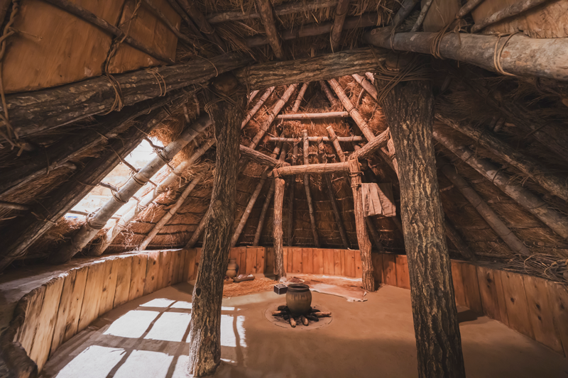 復元した竪穴住居の中に自由に入ることができます。中には弥生人の生活道具や食事を再現しており、米・肉・魚・豆・どんぐりなど海と山の幸の豊富な食事をとっていたこともうかがえます。