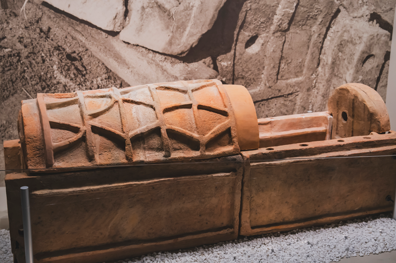 高松市の今岡古墳から出土した焼き物の棺(ひつぎ)で、古墳から出土した陶棺としては最古の部類。ふたの装飾模様や、ふたと底を組み合わせるための差し込み穴など細かな造りが特徴です。