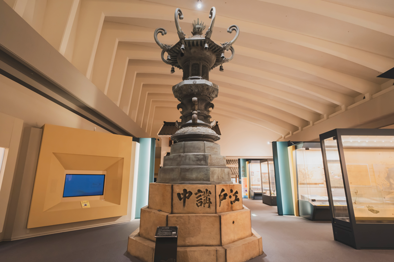 香川県丸亀市の新堀港(しんぼりこう)にある江戸講中灯籠の複製を展示しています。江戸時代、丸亀には金毘羅(こんぴら)参りの船が多く訪れたため、新堀港の船着き場を作ろうと人々が結集しました。その集まりが講中です。灯籠の台座には、講中に参加した1,385人の名前が刻まれています。