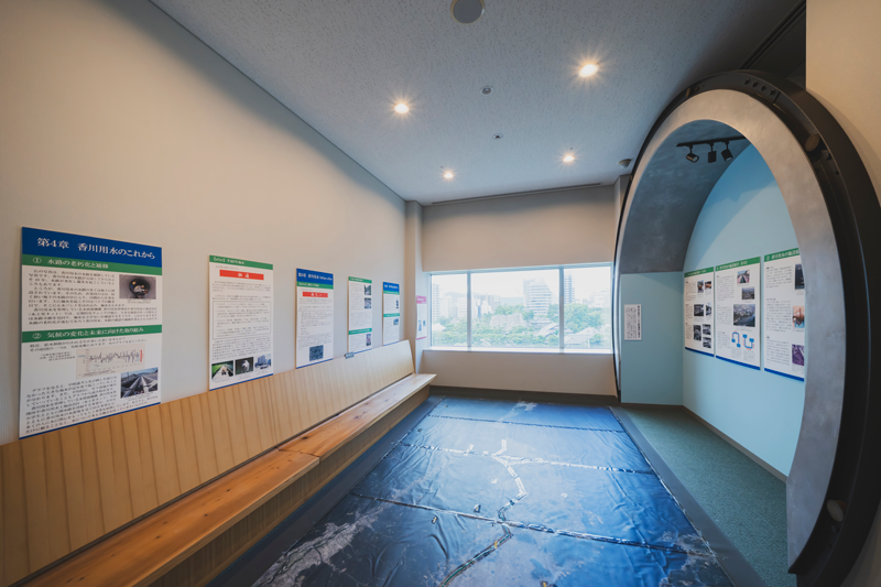 雨の少ない香川県の水利用の歴史や、吉野川の水を香川県へと送る香川用水の事業を紹介。阿讃導水トンネルの実物大模型や上空から見た香川用水の写真も展示しています。この展示室からは玉藻公園が一望できるので、景色もあわせてお楽しみいただけます。