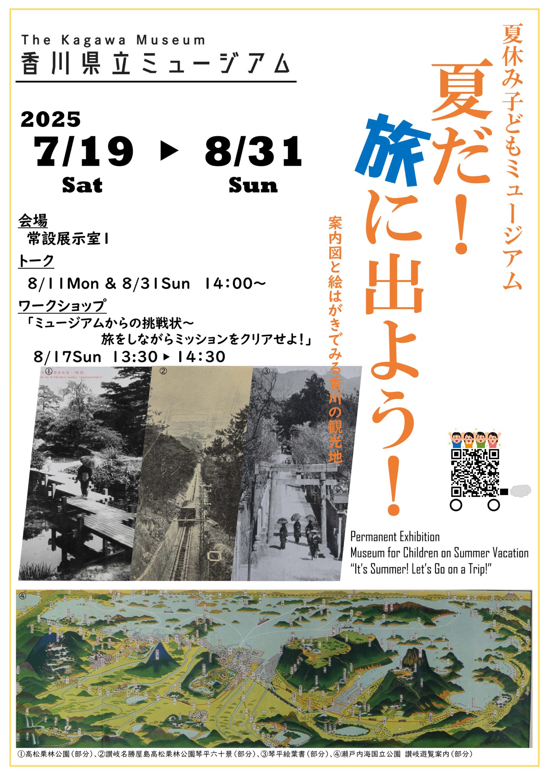 本展では、主に昭和63年(1988)の瀬戸大橋開通までの香川の名所を写した案内図や絵はがきを紹介します。案内図に記載された旅行ルートや絵はがきに写る風景写真を見ながら、旅先としての香川の魅力を発見していきます。