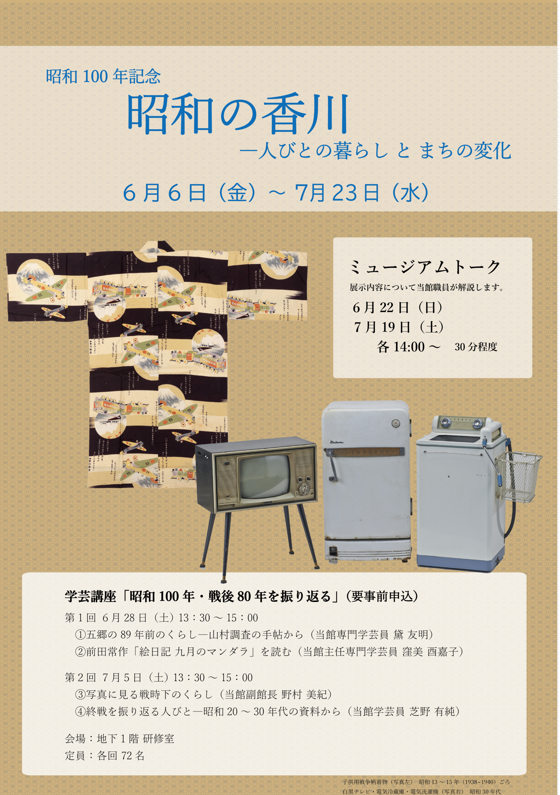 2025年は「昭和100年」の節目の年でもあり、そして終戦80周年でもあります。64年にわたって続いた昭和は、政治や文化、技術などあらゆる側面で大きな変化を経験した時代でした。本展では「昭和時代」を2つに分け、1章では戦前から終戦までを、2章では戦後を対象とし、全体を通じて「戦争」にも着目します。人びとの暮らしとそれを取り巻くまちの変化を収蔵資料から紹介し、香川県における昭和時代を振り返ります。