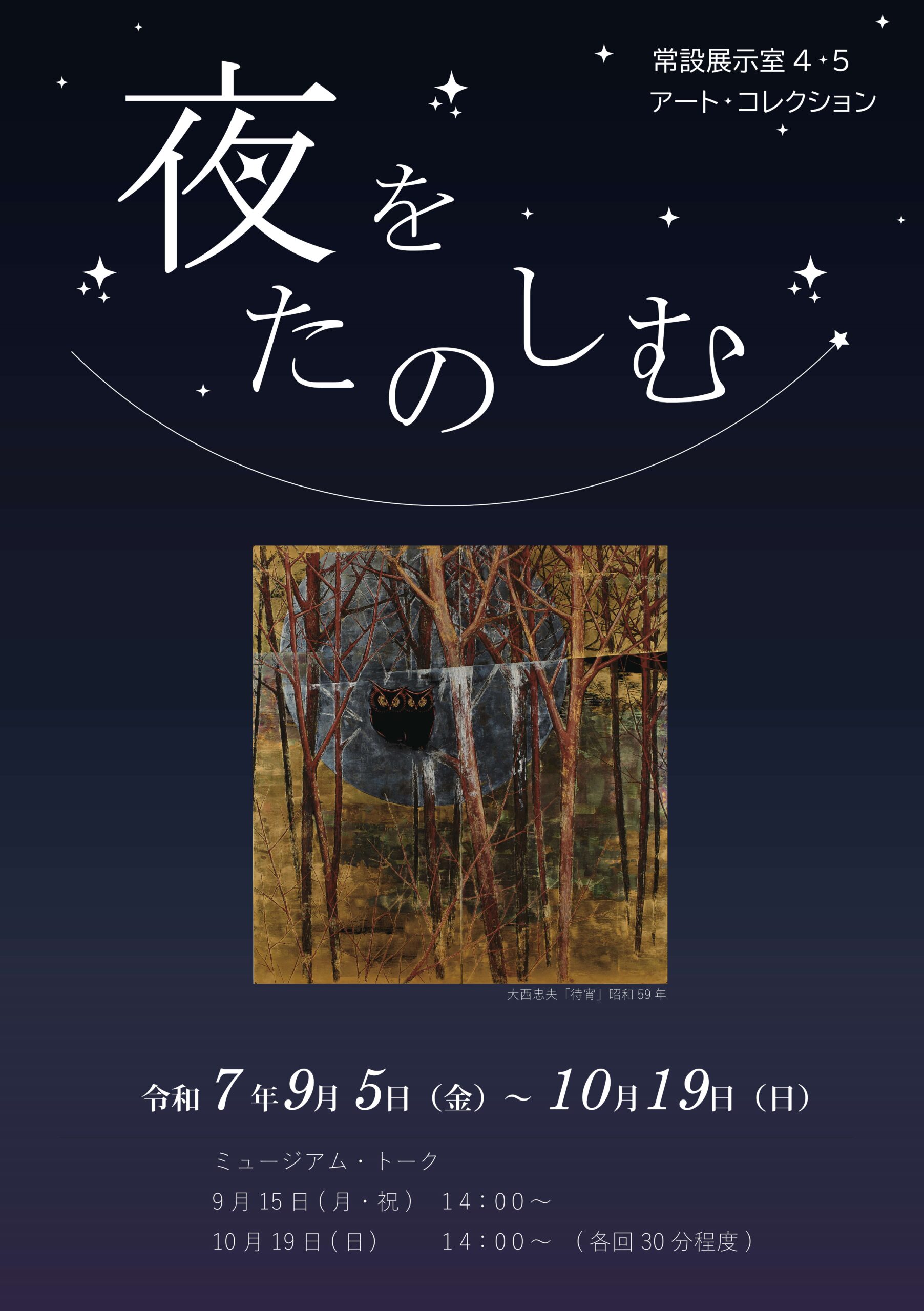 夜にひっそりと活動する生き物たち、月に照らされて輝く美しい風景、心の中に広がる夜のような闇の世界。夜には、昼間とはまた違う、不思議で美しい魅力がたくさんつまっています。絵画や彫刻、工芸など様々なジャンルの作品から、いろいろな「夜」を感じてみてください。