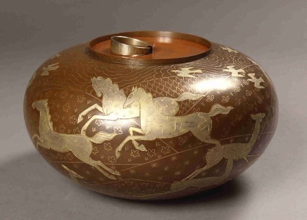 草花が咲いた野原を馬が颯爽と駆けています。壺全体に施された文様は、母材に異なる金属をはめ込んで装飾する象嵌(ぞうがん)という技法を用いています。丸みのある器物に繊細な線刻、鳥獣を象嵌で装飾する巧みな技術が発揮された本作は、第4回文展で特選を受賞。