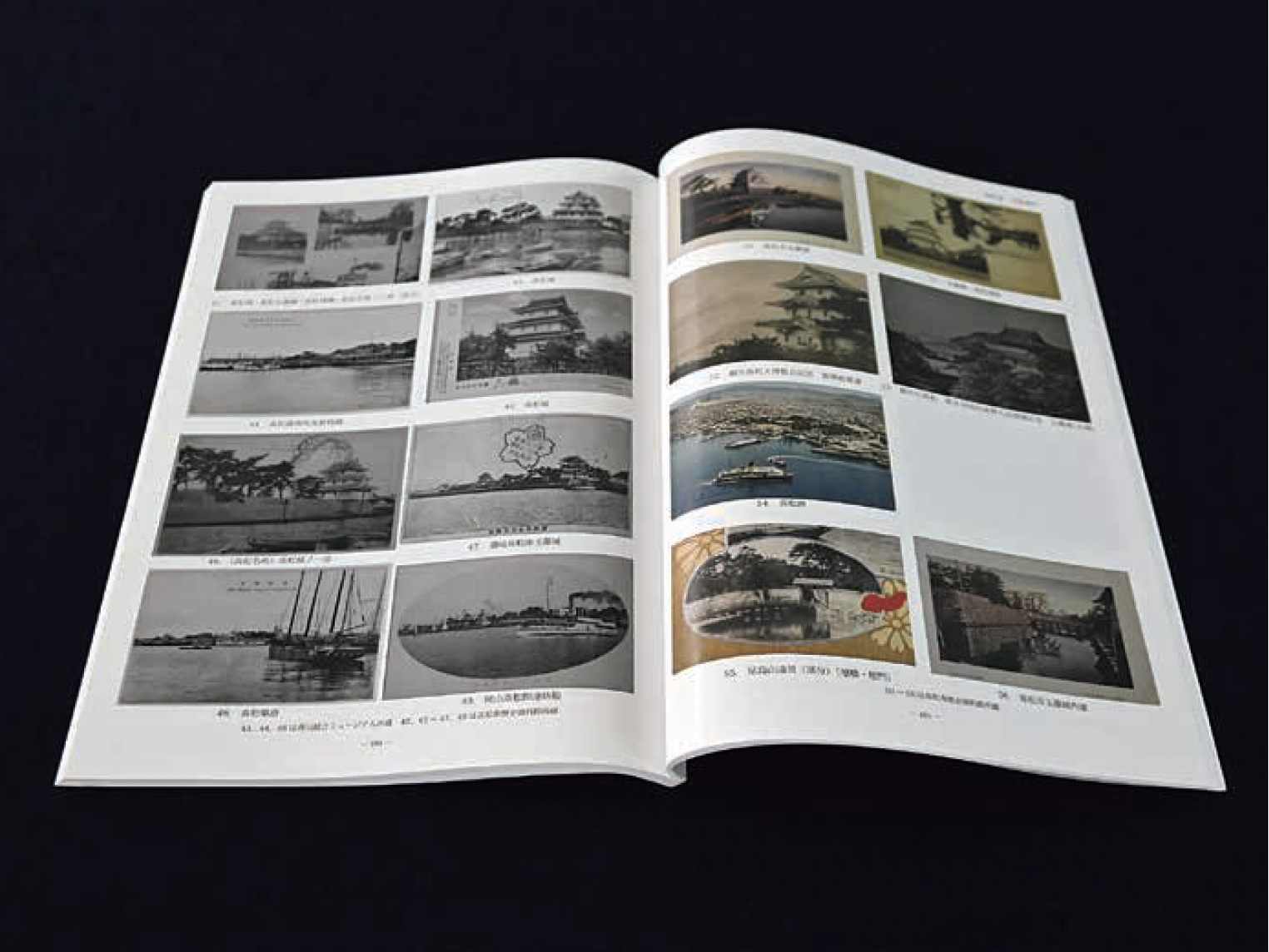 最初に、近代の高松城の変遷を視覚的に把握するため、当館のほか、公益財団法人松平公益会、高松市歴史資料館等が所蔵する写真資料のデータ収集を行いました。併せて、写真の撮影場所や年代を特定するため、参考資料として絵図・地図についてもデータを収集しました。収集したデータについて検討を重ね、令和4年度末には、写真資料(絵葉書・参考図版を含む)90件222点、絵図・地図46点のリストと画像を掲載した調査報告書(註)が高松市から刊行されました【図1】。