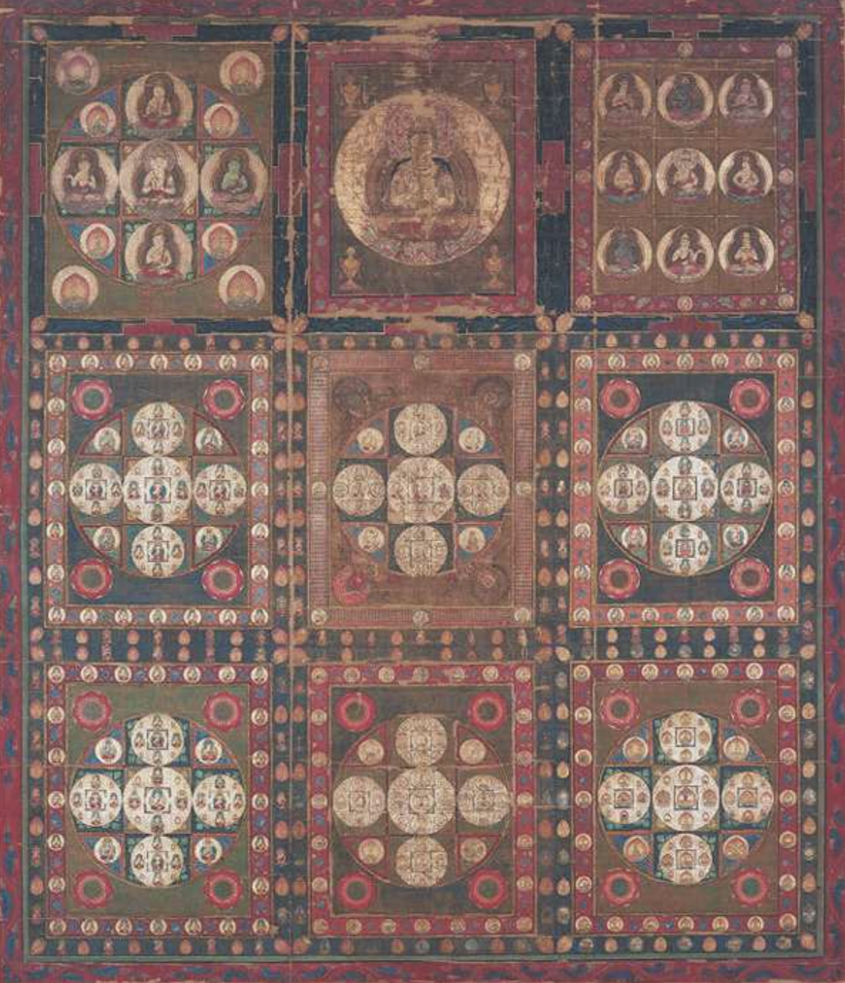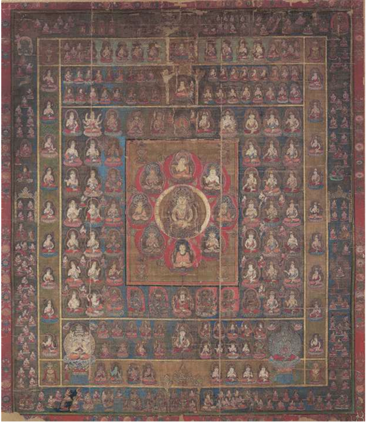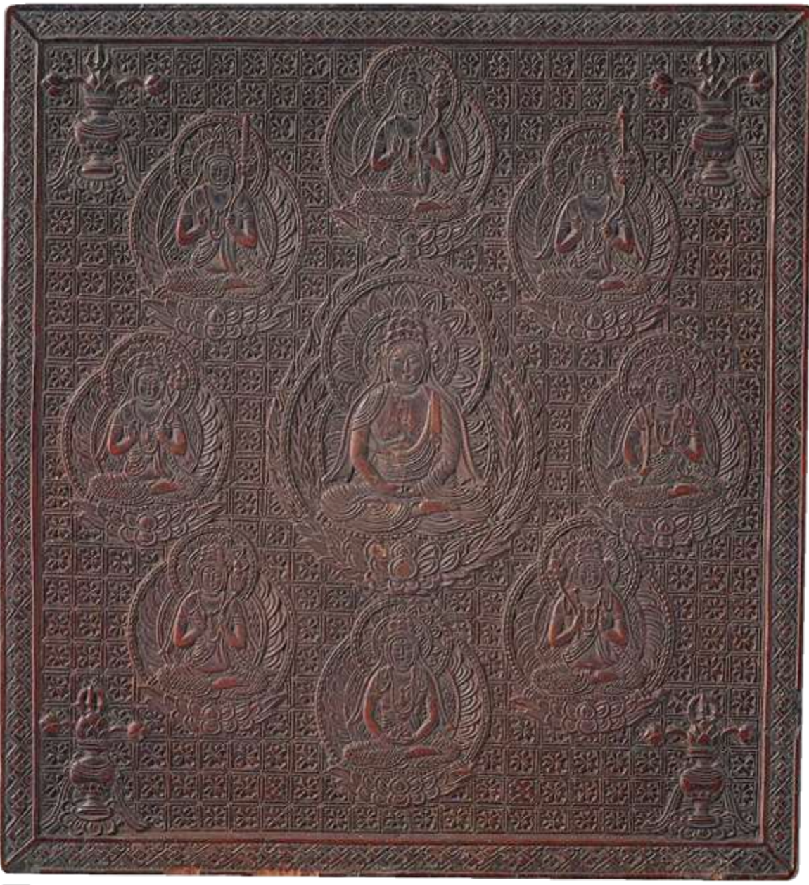 海上を通じてもたらされた中国・唐製の品がある。弥谷寺の五鈷鈴[図7]は、鈴身に四天王を配する華麗な梵音具で善通寺の国宝 鍔杖頭[後期展示]と同様、空海請来と伝わる。開法寺の阿弥陀曼荼羅[図8]は国宝 諸尊仏龕(金剛峯寺)[前期展示]に同じく白檀材に施された緻密な彫技が必見である。